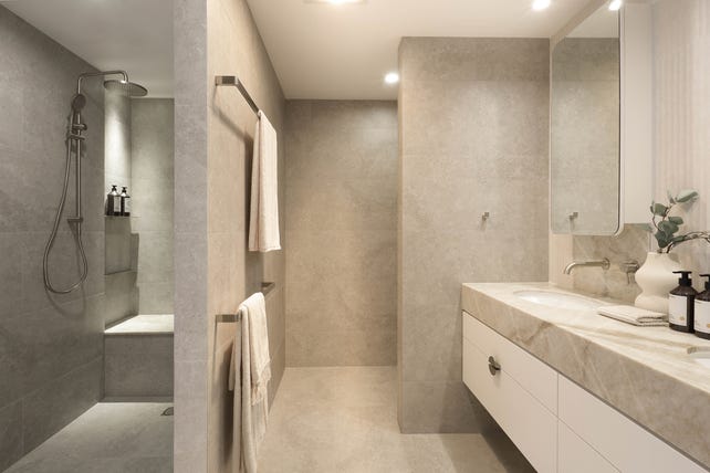 The aesthetics look amazing with 2700mm high ceilings with square set finish, natural stone benches, designer brushed nickel tapware, bespoke cabinetry including fluted 2-pac soft close in kitchen, floor to ceiling sheer curtains, 100% wool loop carpets with premium underlay in bedrooms, 450x900mm tiled flooring, dual vanities in ensuite, and a soft, chic coastal colour palette.