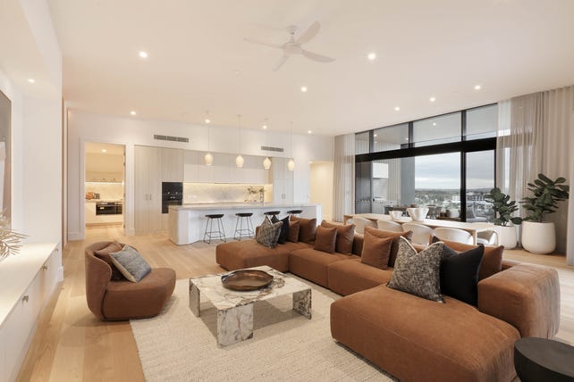 Across approximately 511 square metres with up to 3400mm high ceilings, oversized glass windows to invite light, and a prized north-easterly aspect. The penthouse comprises formal entry, four bedrooms, three fully tiled bathrooms, well-equipped galley kitchen with an oversized butler’s pantry, office, media room, open plan living/dining flowing to wraparound balcony with built-in BBQ, private balcony off master bedroom, air-conditioned wine cellar, separate laundry, and beach room with shower. Importantly, there is also secure lock-up parking for six cars, a rare and valuable amenity.