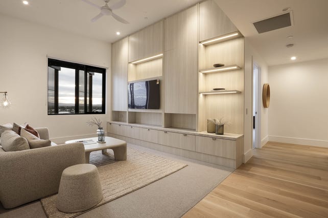 Bespoke cabinetry, natural stone benches in kitchen and bathrooms, brushed nickel tapware, quality window furnishings including full length sheer curtains, ducted air-conditioning, ceiling fans, sleek lighting, 100% wool carpets with premium underlay in bedrooms and media, solid American white oak flooring in kitchen/living and office, Gaggenau appliances including 2 x integrated dishwashers, 2 x Fisher/Paykel integrated fridge/freezer, dual vanities and dual showers plus luxury standalone bathtub with water views in opulent ensuite, and masses of storage – are among the suite of impressive features.