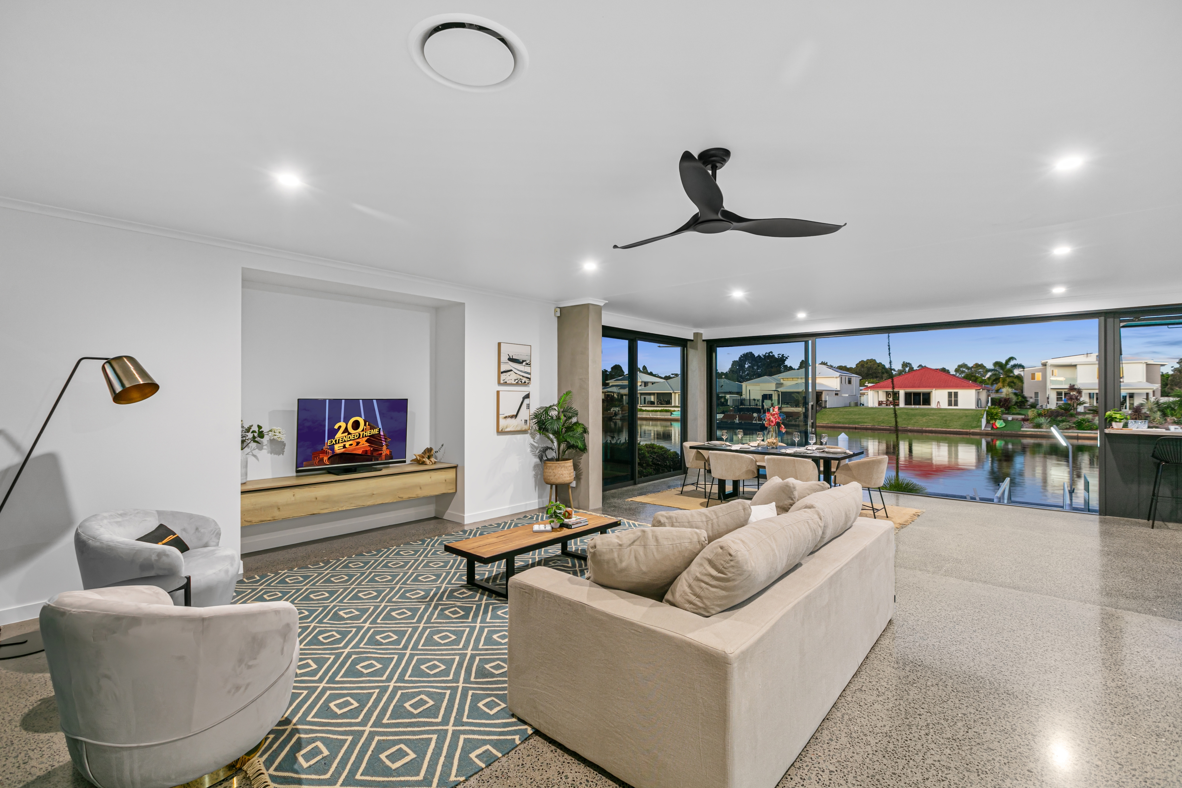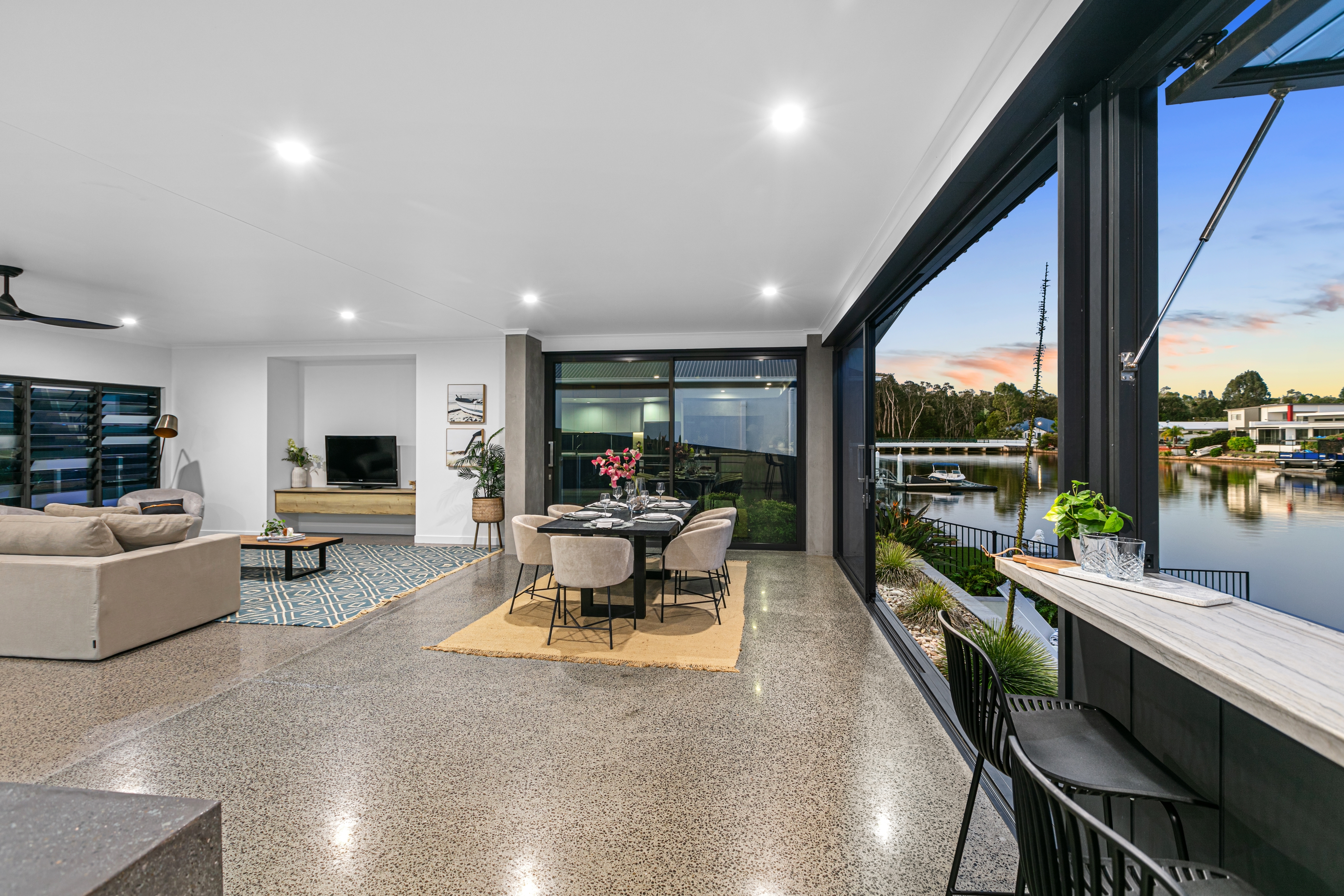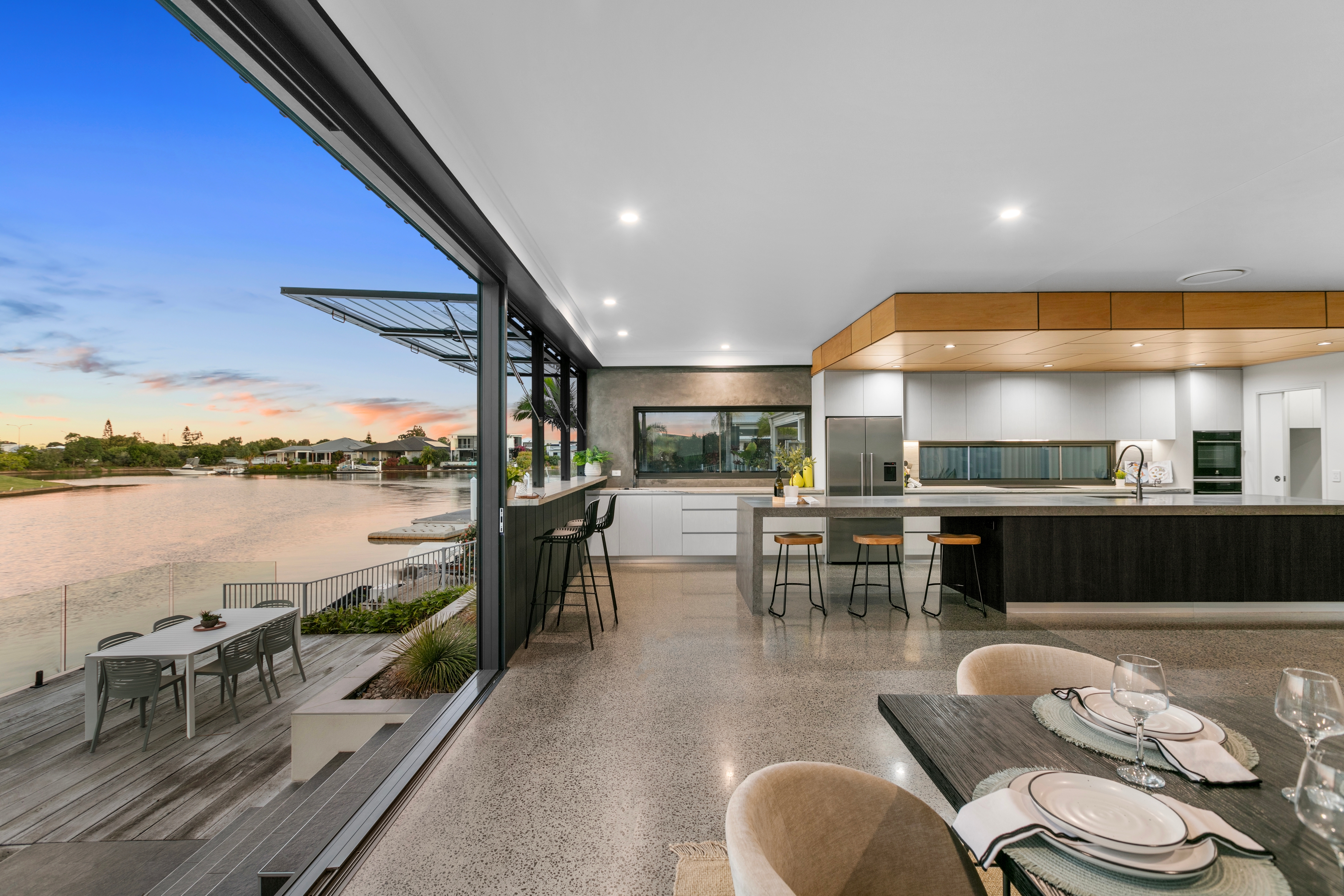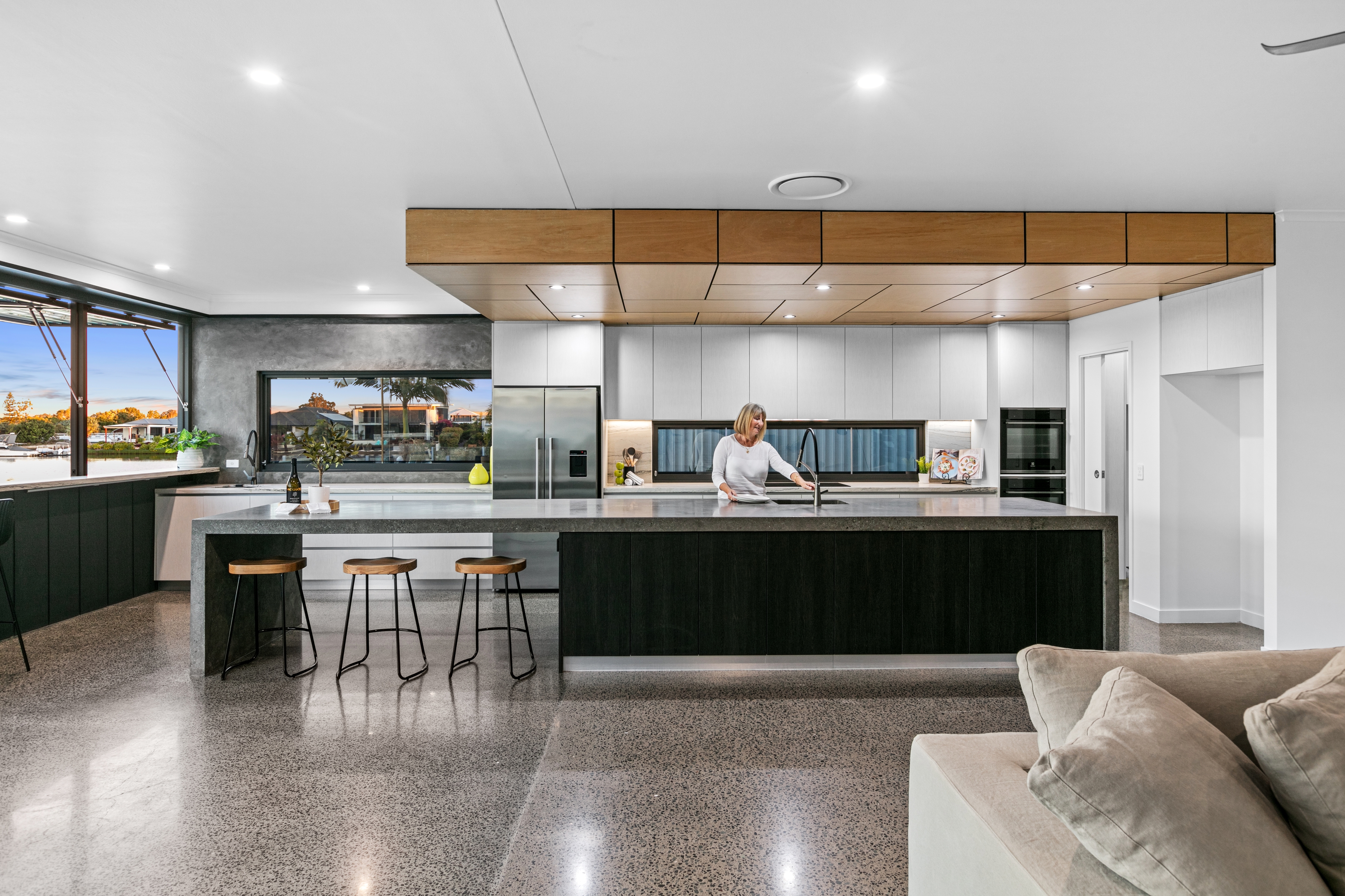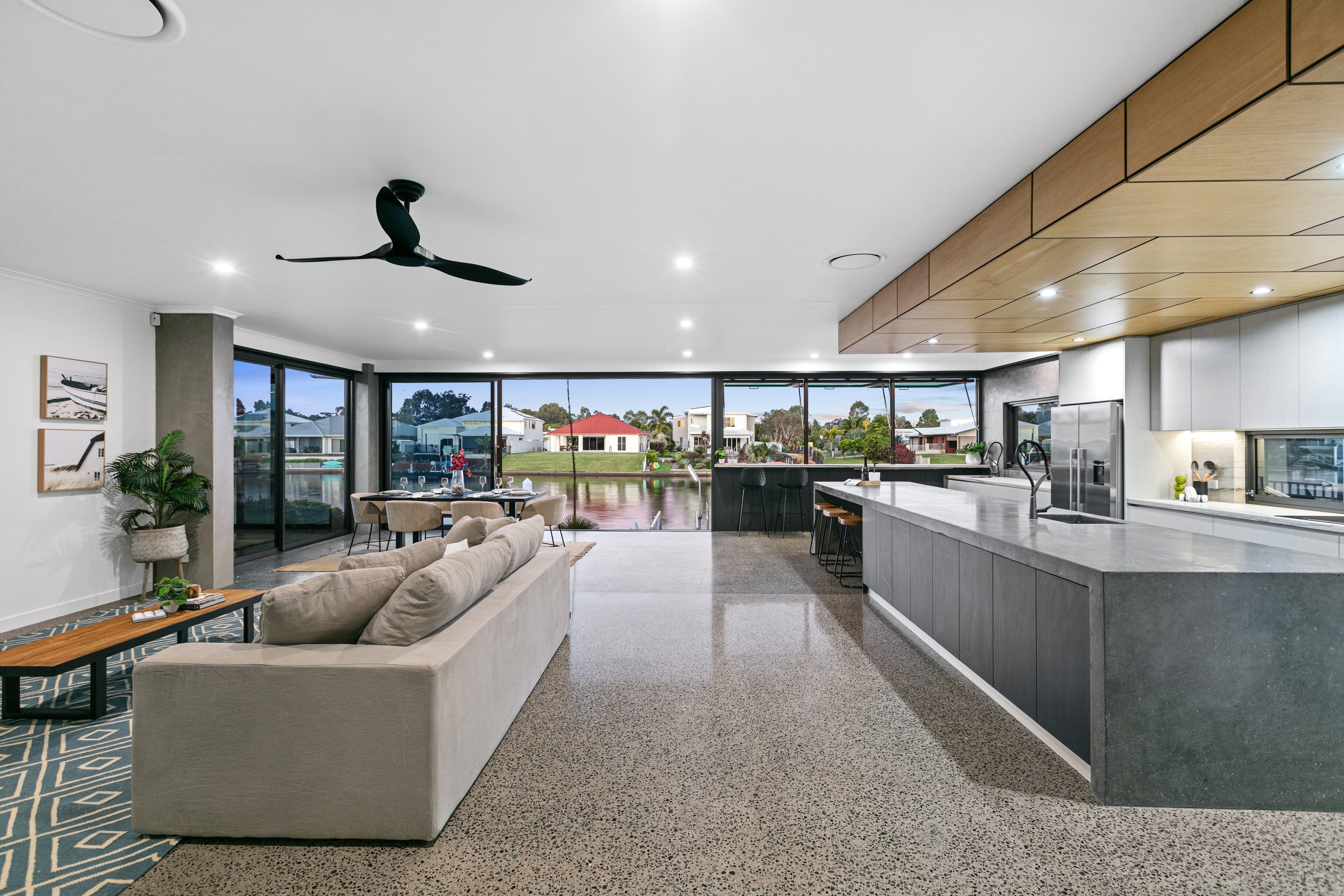 The chef's kitchen is a culinary dream, featuring a six-metre main kitchen benchtop, leather quartz countertops, dual ovens, a 900mm induction cooktop, and a spacious walk-in butler's pantry. Complete with a breakfast bar that overlooks the canal, enjoy your morning coffee with the breathtaking views to start your day.