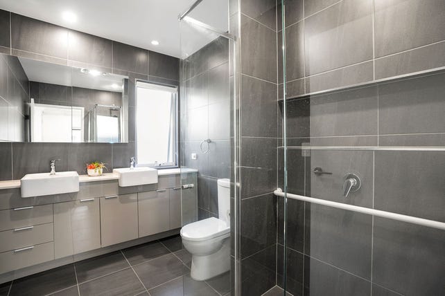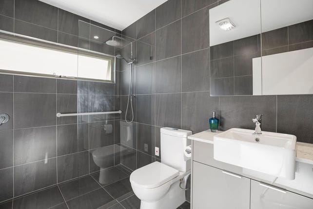 A well-appointed second bathroom services these rooms and features modern fixtures with tiles to the ceiling and sleek design.