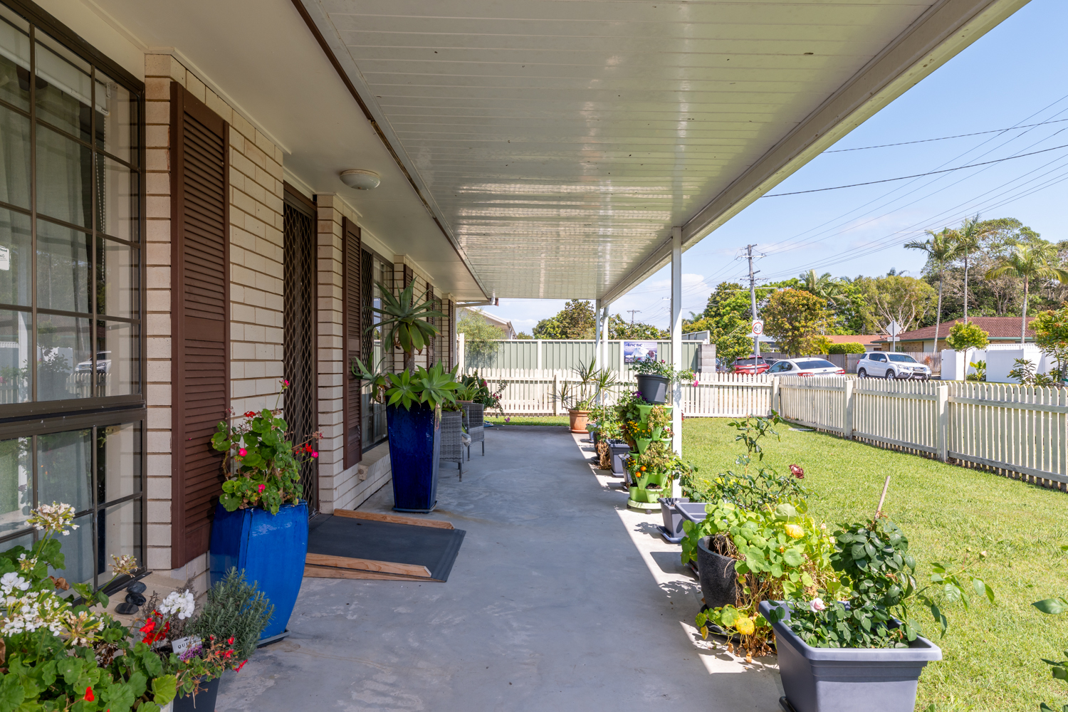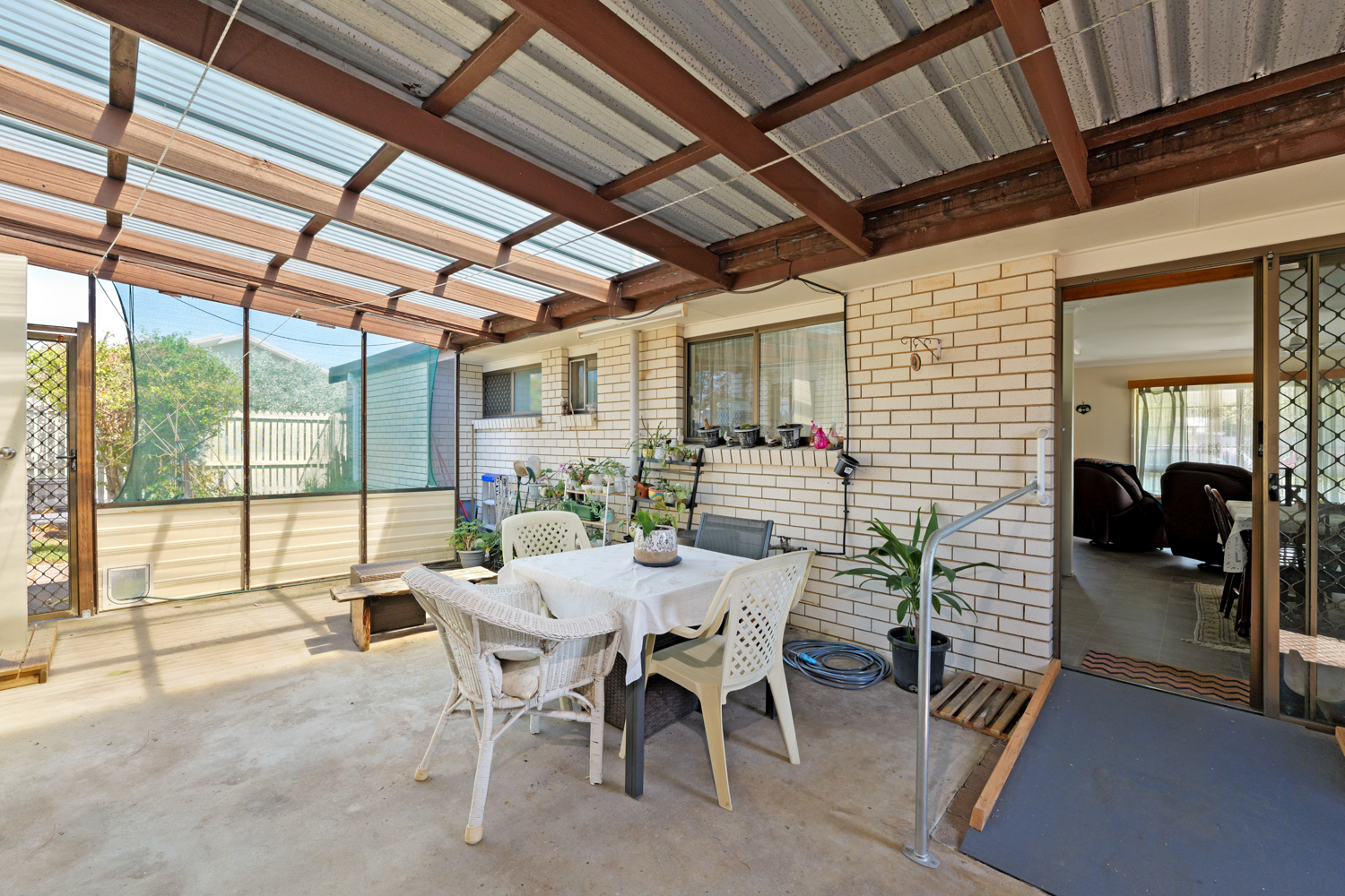 Outdoor area undercover and enclosed, fenced yard, single lock-up garage and screens on windows and doors.