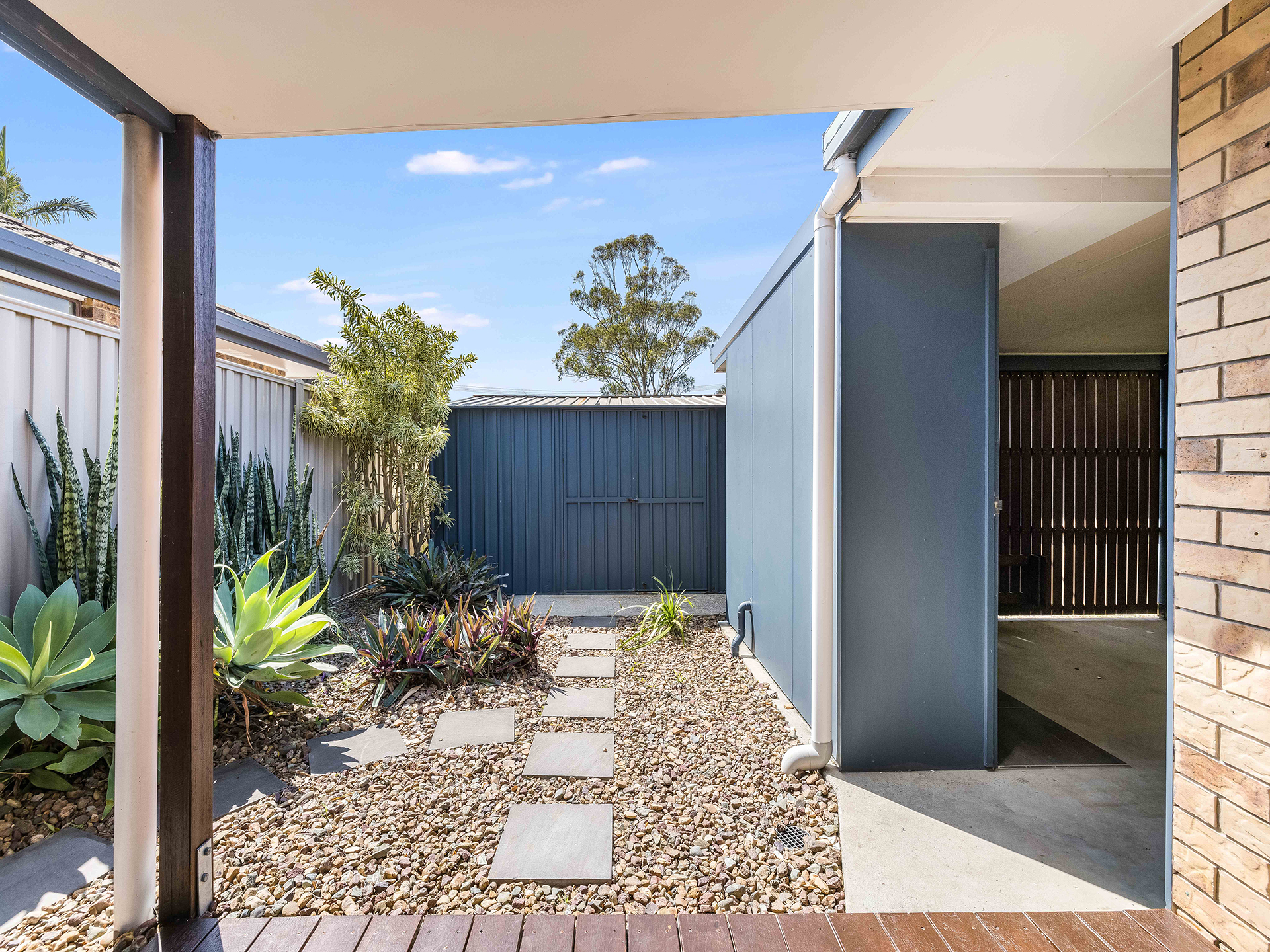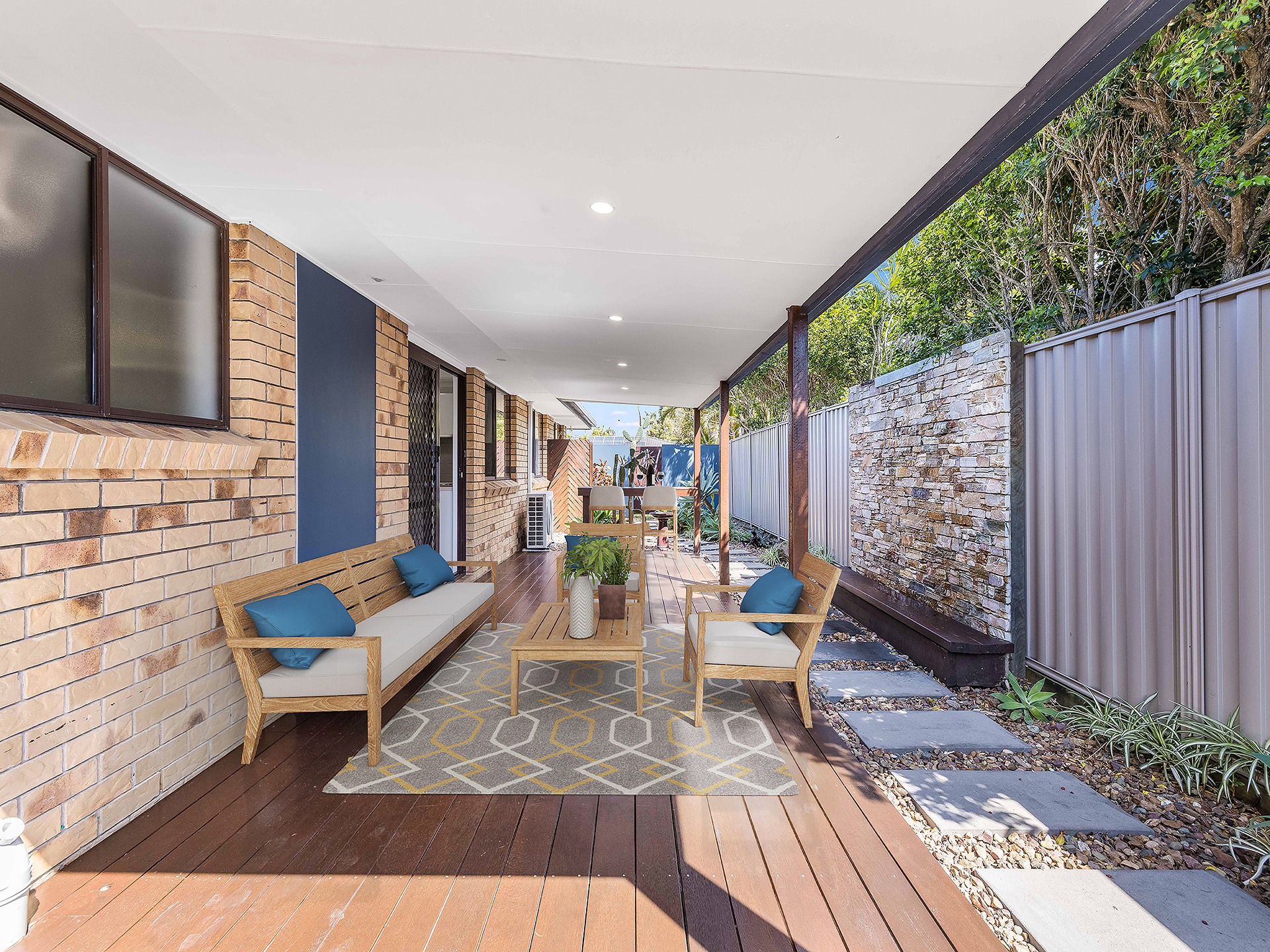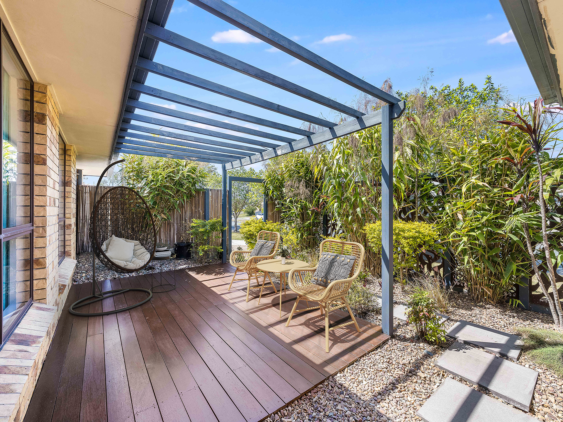From the moment you arrive, you'll be welcomed by a warm and inviting entrance. The front timber deck, framed by chic bamboo fencing and striking wrought-iron screens, creates a serene and private space to enjoy your morning coffee or unwind in the evenings. Inside, style meets practicality. The galley kitchen with modern finishes opens seamlessly to a vast open-plan living space, adorned with timber veneer flooring and neutral tones. The living area flows effortlessly onto the back deck, a perfect alfresco space complete with a tranquil water feature, setting the scene for outdoor dining and relaxation.