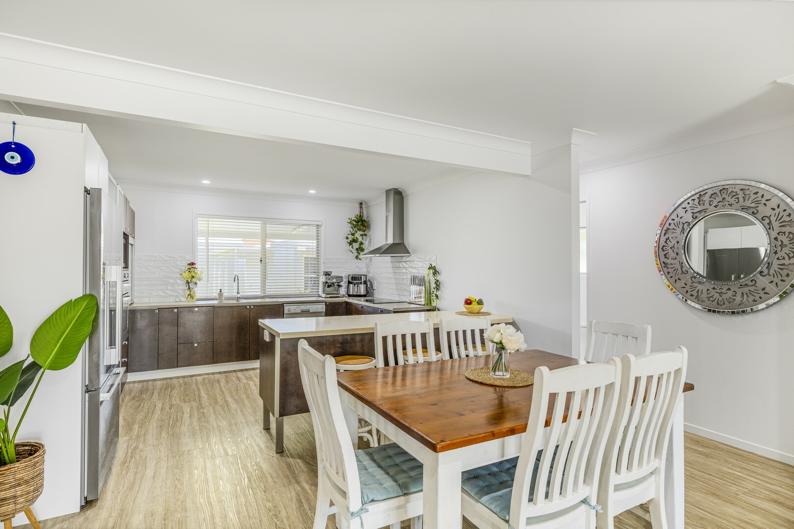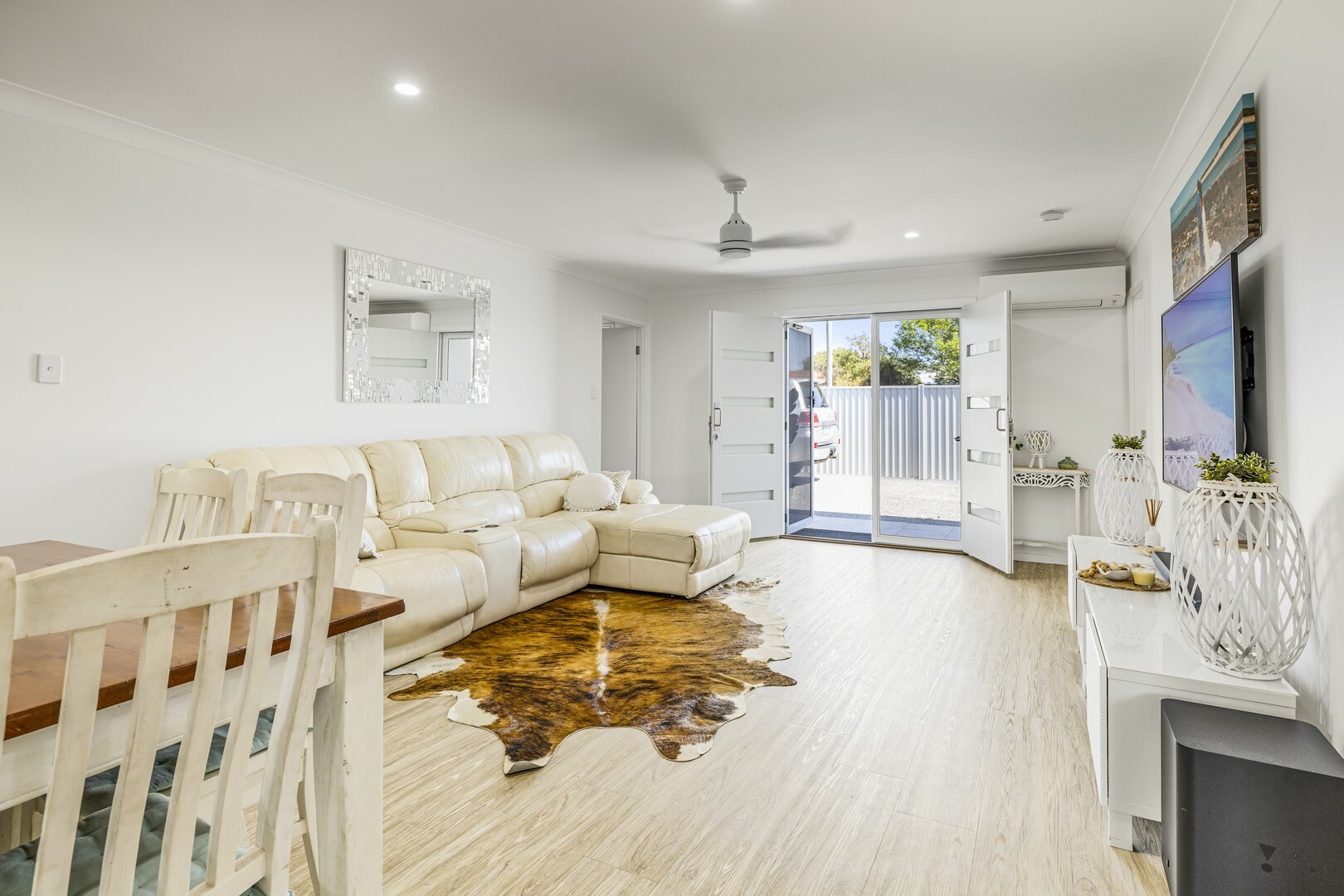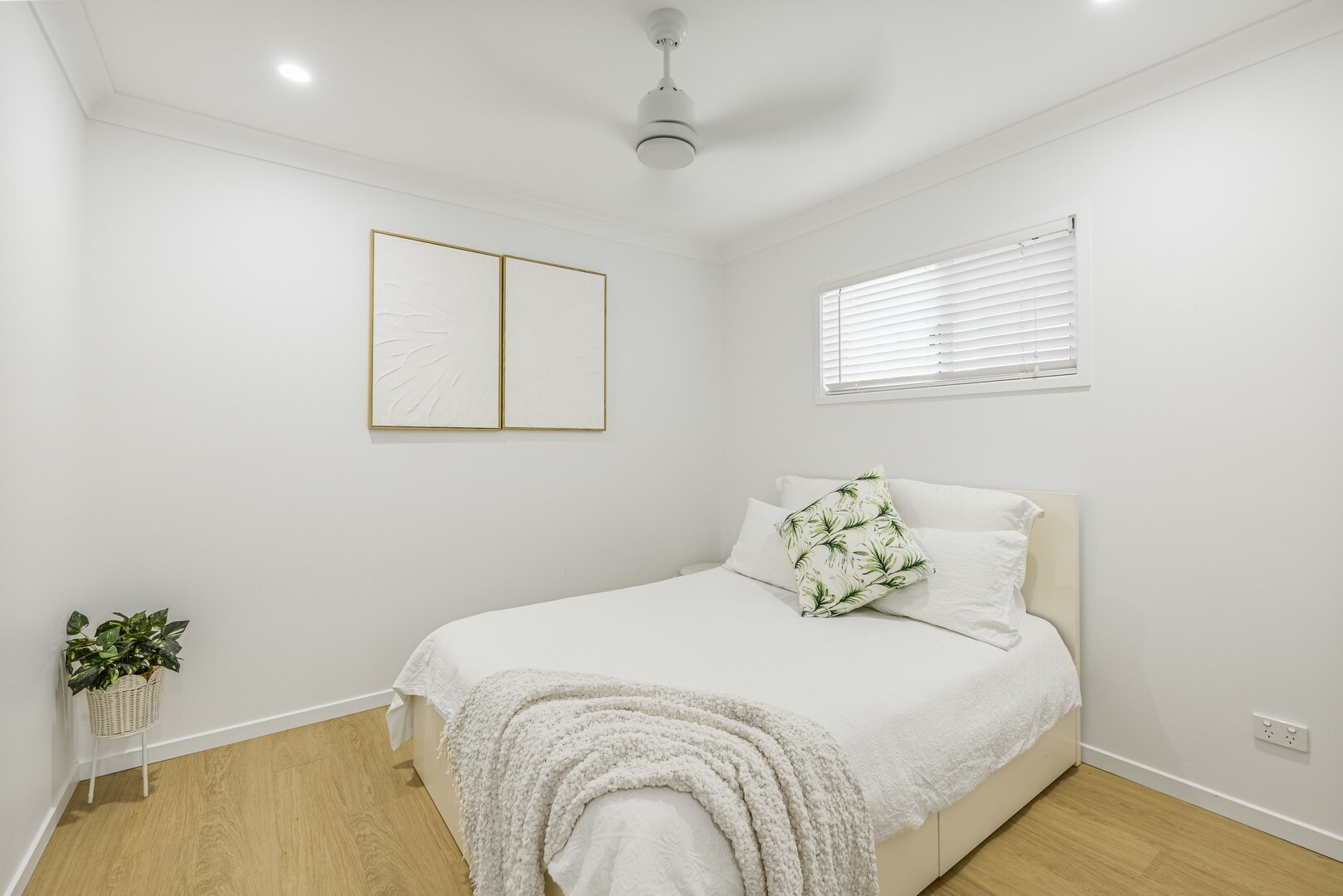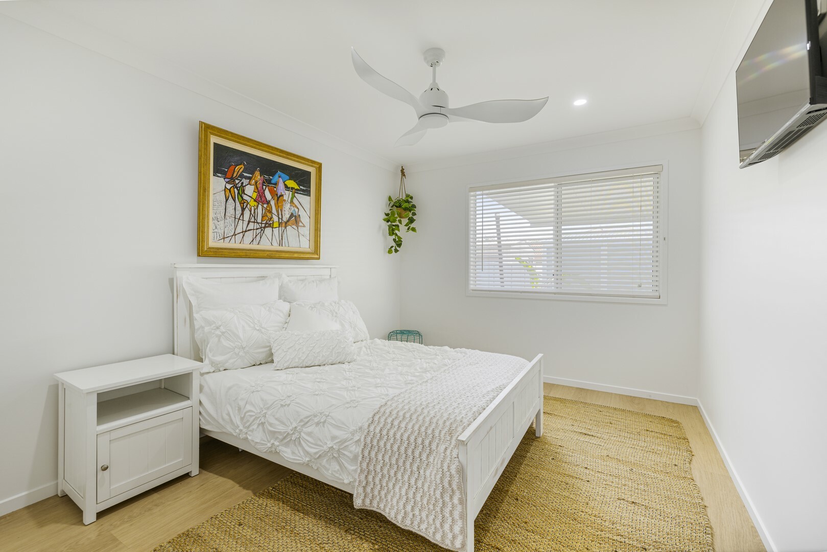 The home has a modern beach theme with plenty of natural light, a neutral colour palette, white shutters and low maintenance light timber coloured vinyl flooring.