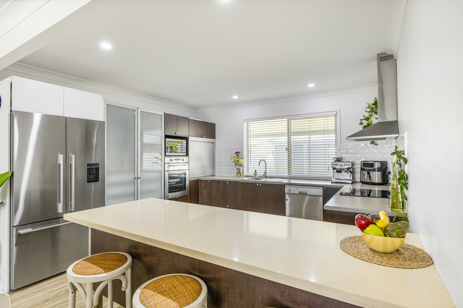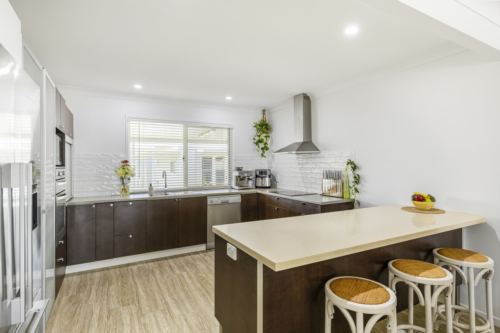 The kitchen is modern with ample bench and cupboard space, a breakfast bar, stainless steel appliances and overlooks the backyard.