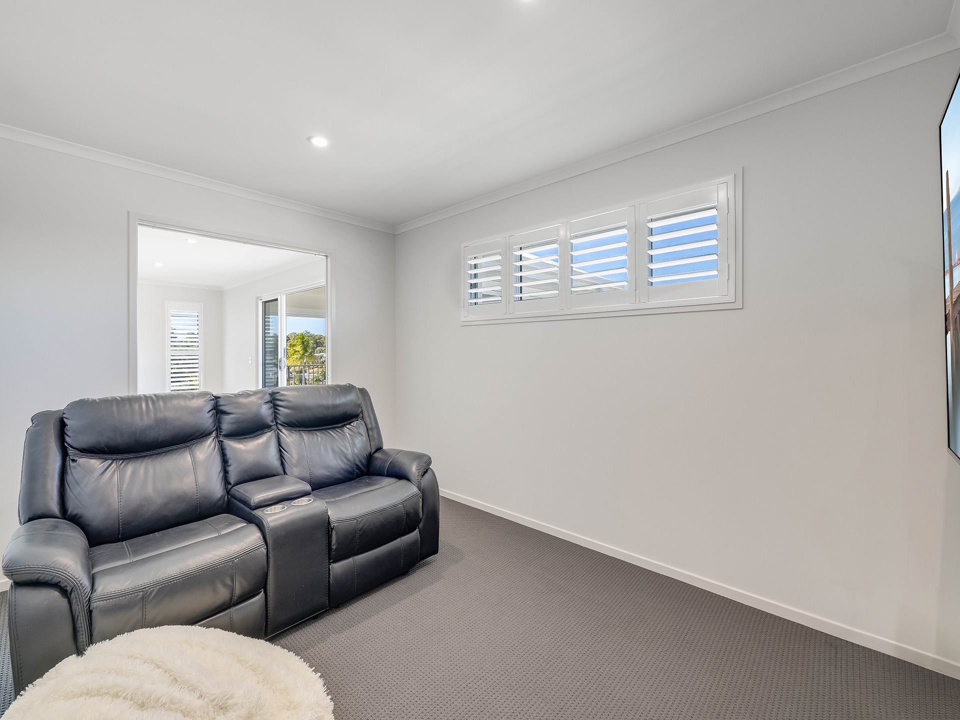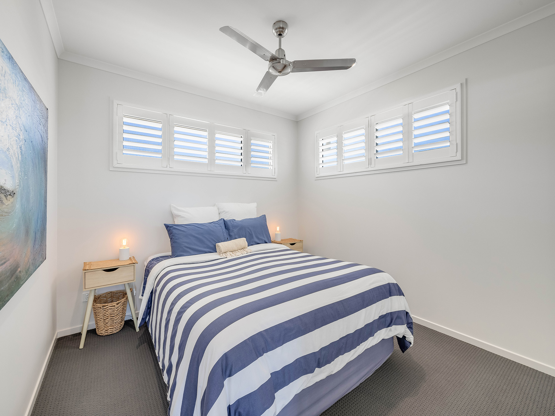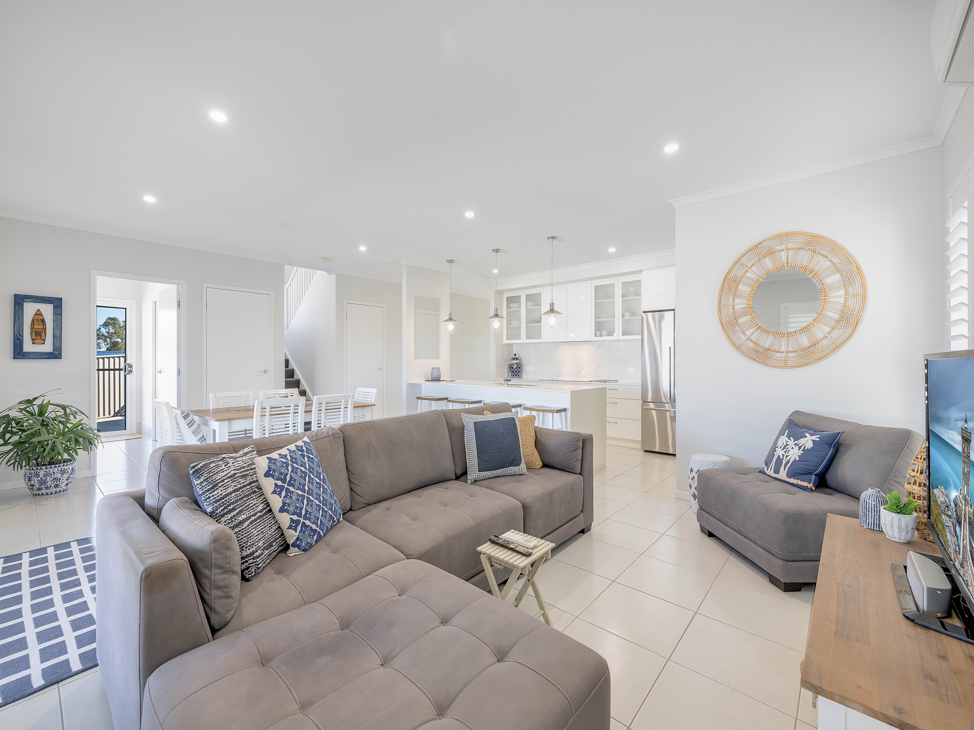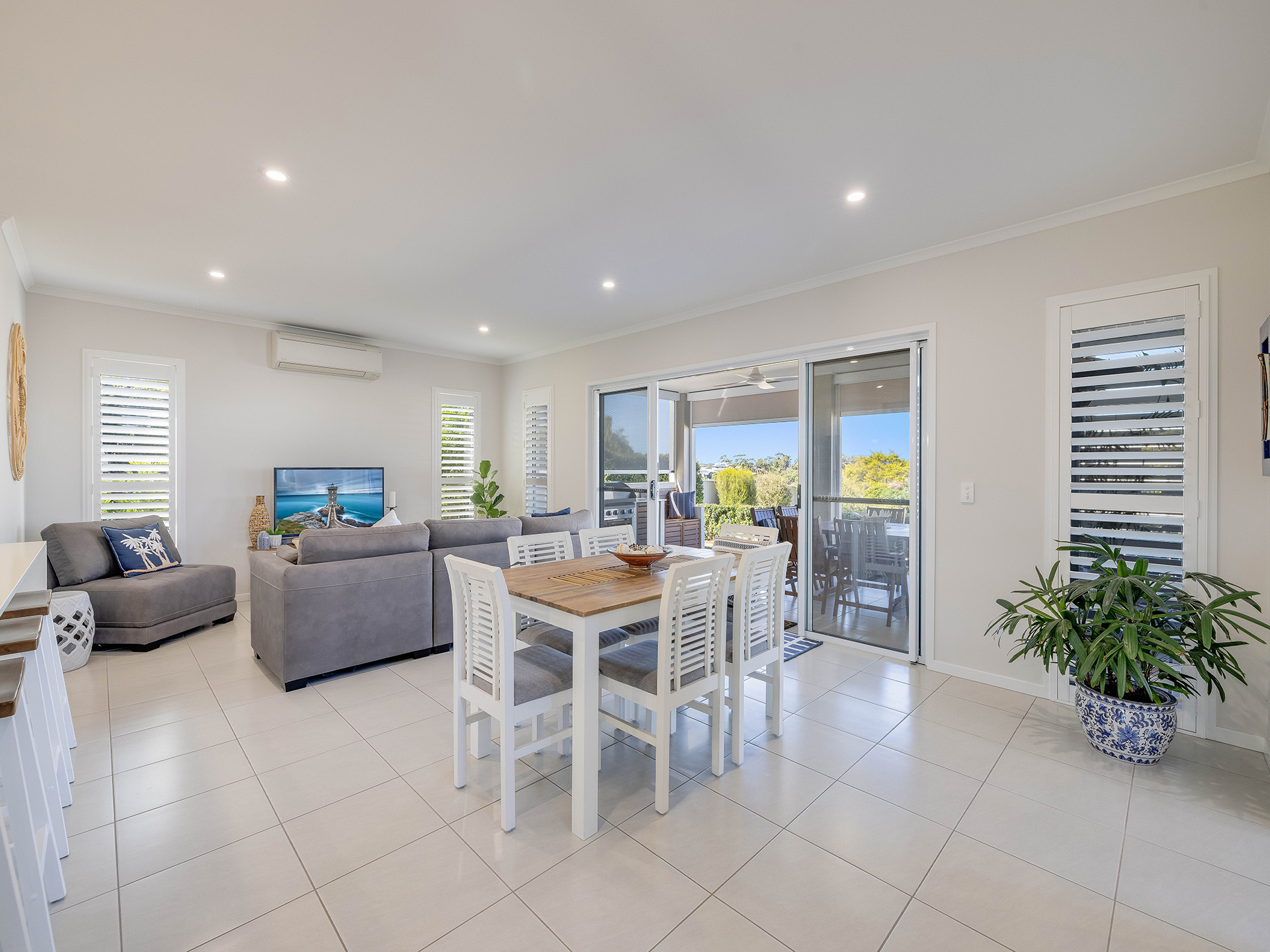 The kitchen is a standout feature, featuring a stunning stone benchtop and a waterfall breakfast bar that serves as a centerpiece for the space. Equipped with a 90cm oven and ceramic electric cooktop, this kitchen combines style with functionality. Ample storage options and a butler's pantry ensure that all your culinary needs are met, making it easy to entertain guests in the adjoining lounge and dining area. This space is designed for hosting large gatherings, with enough room to accommodate even the biggest of dining tables. The white plantation shutters not only provide light control but also add a coastal charm to the home.