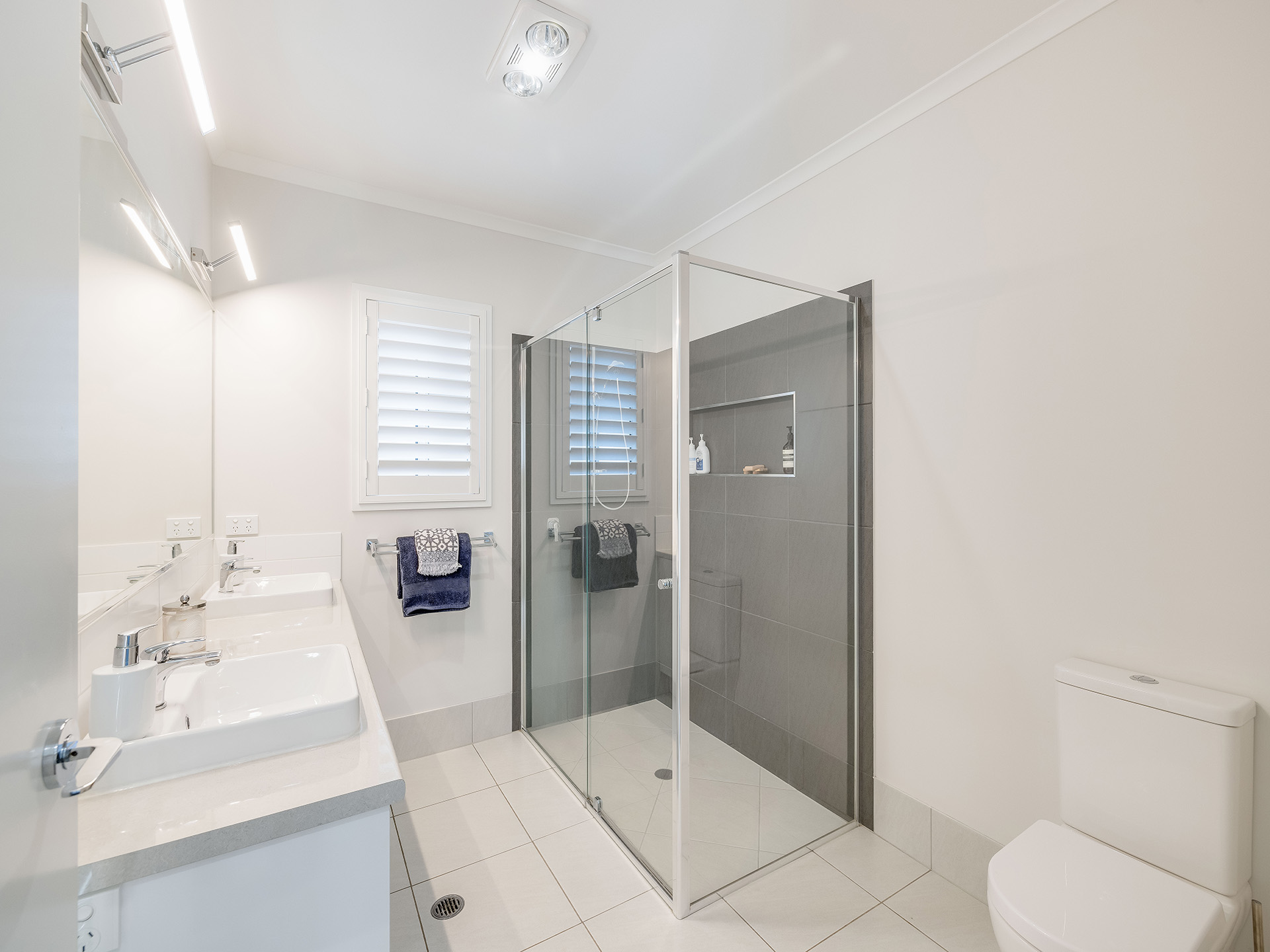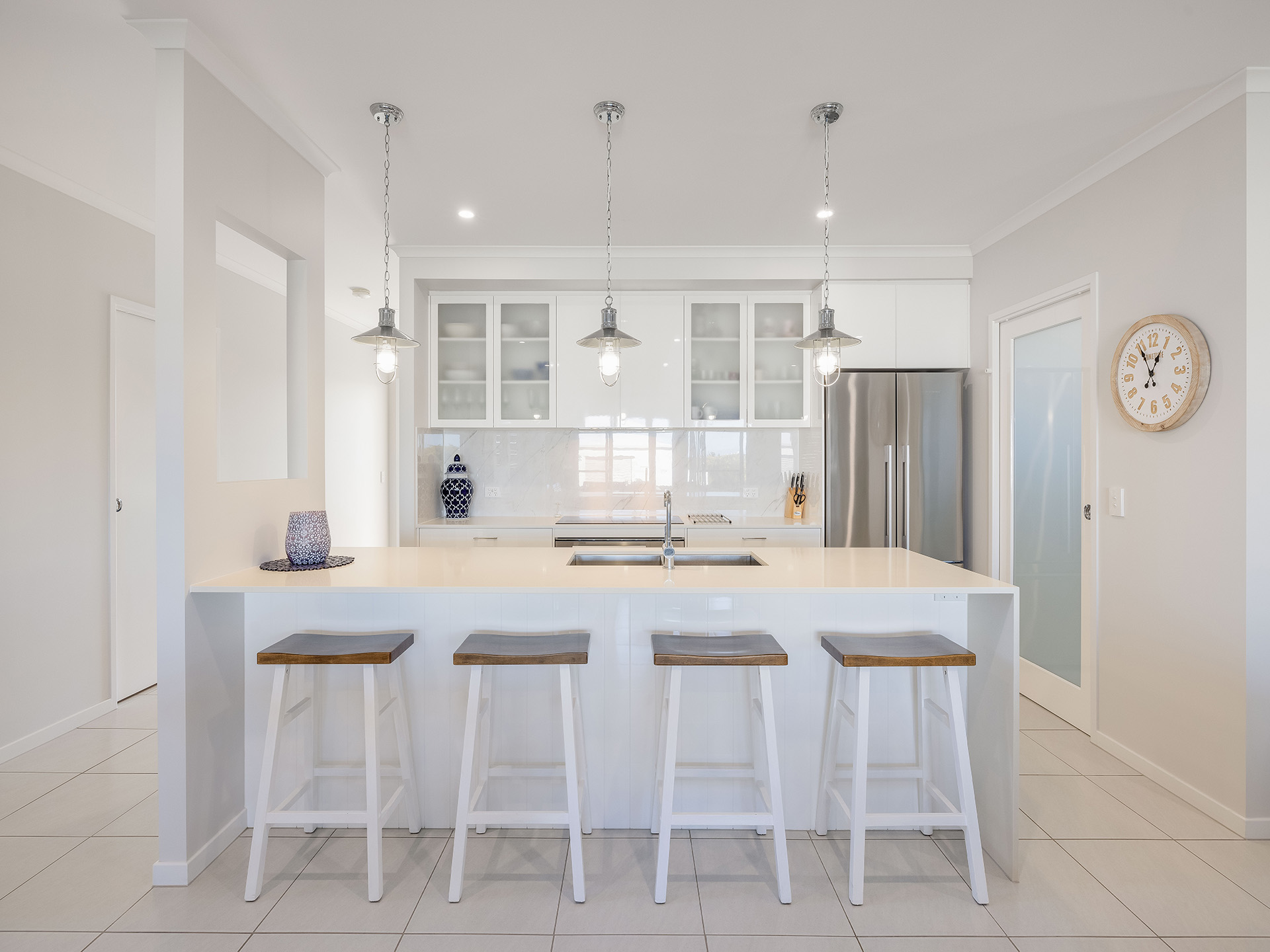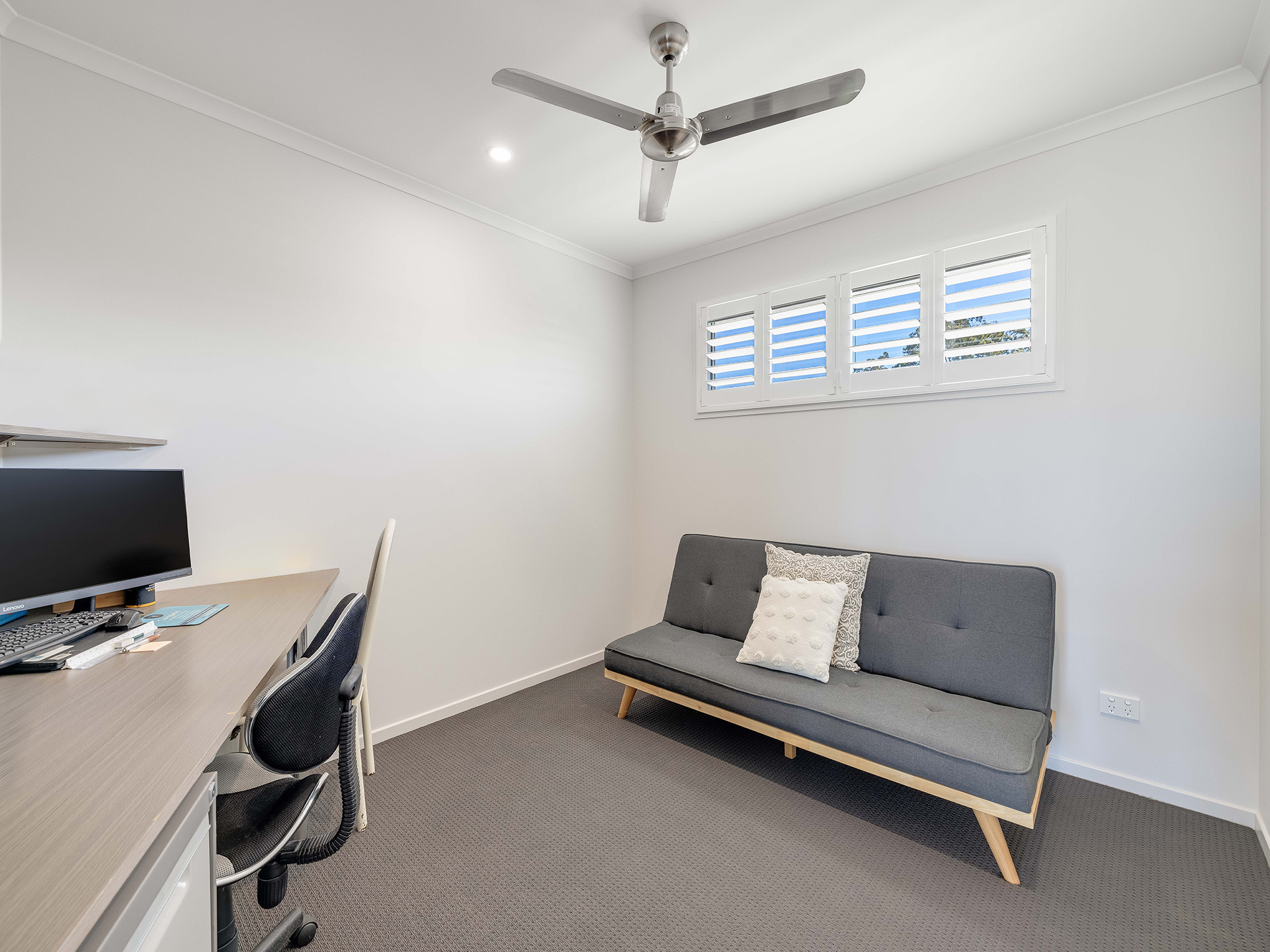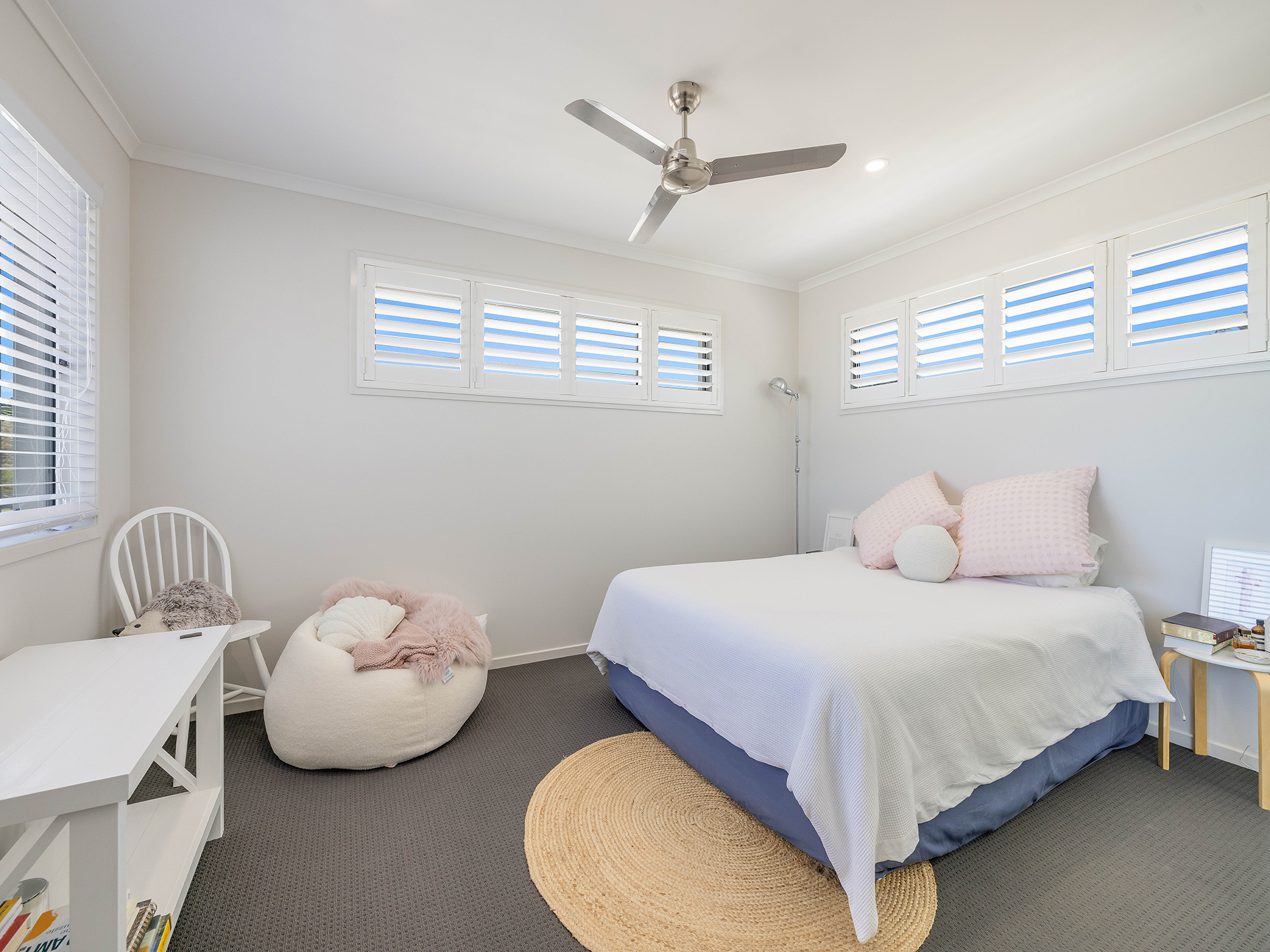 The kitchen is a standout feature, featuring a stunning stone benchtop and a waterfall breakfast bar that serves as a centerpiece for the space. Equipped with a 90cm oven and ceramic electric cooktop, this kitchen combines style with functionality. Ample storage options and a butler's pantry ensure that all your culinary needs are met, making it easy to entertain guests in the adjoining lounge and dining area. This space is designed for hosting large gatherings, with enough room to accommodate even the biggest of dining tables. The white plantation shutters not only provide light control but also add a coastal charm to the home.