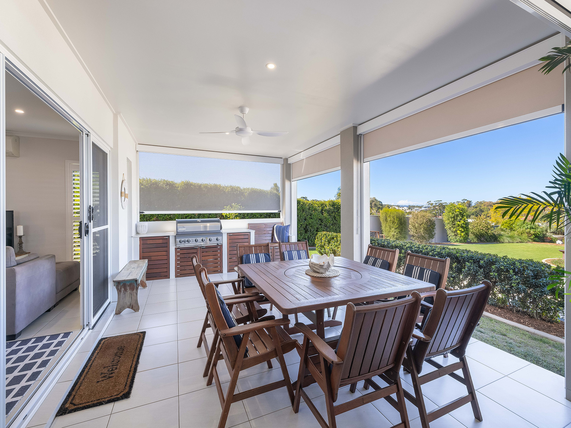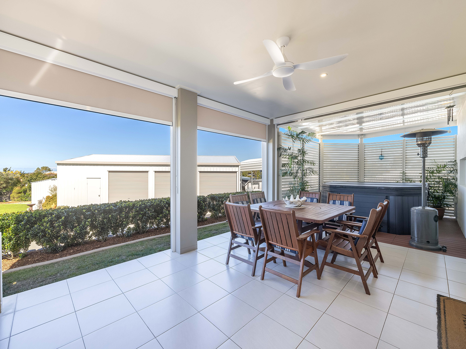 For outdoor entertaining, the covered alfresco area is perfect. Drop-down shades allow you to enjoy cooler evenings, while a custom-built BBQ with stone benchtop and storage make outdoor cooking a pleasure. An undercover spa bath adds a touch of luxury, creating a perfect spot to relax and unwind.