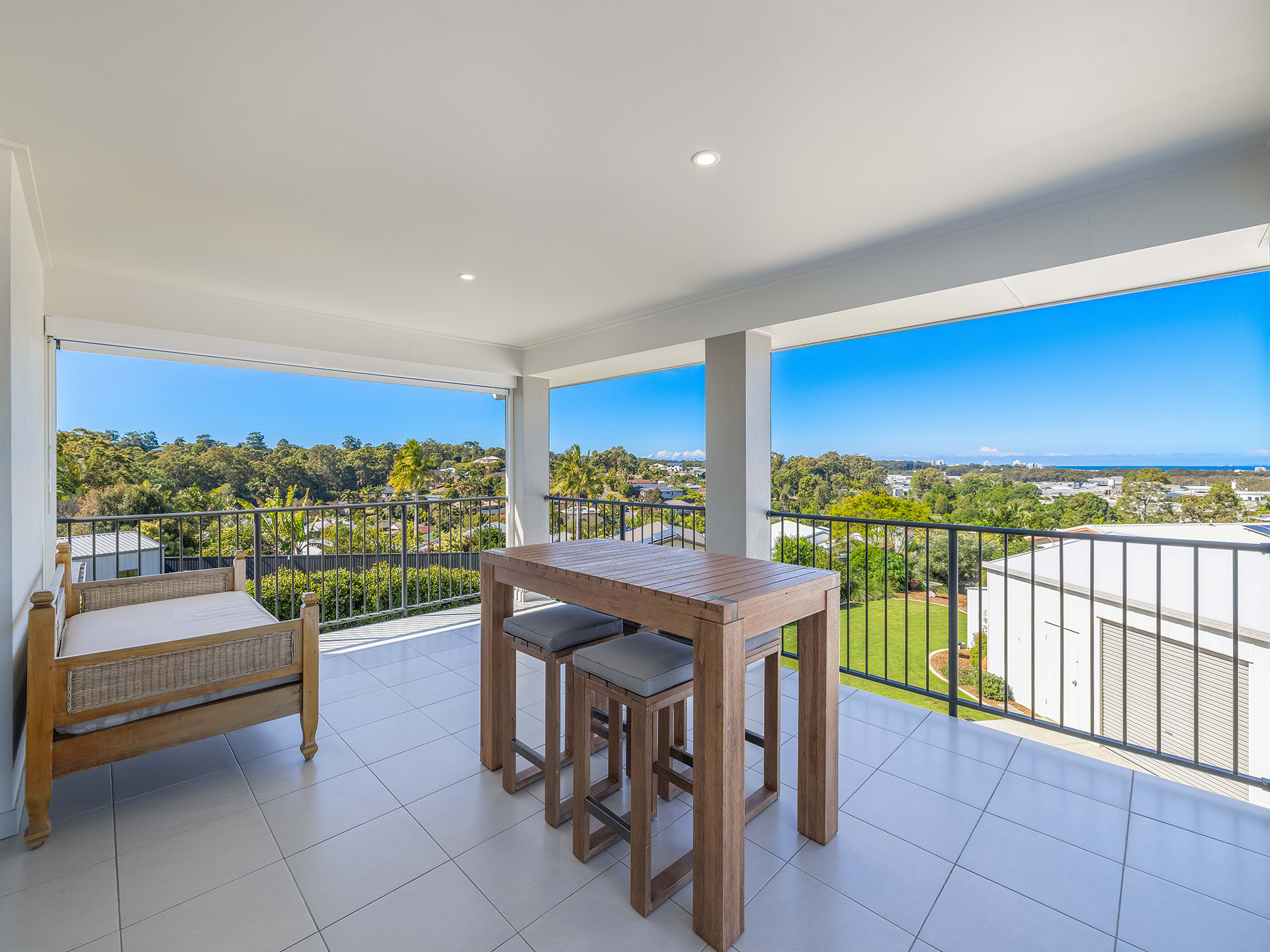 three well-sized bedrooms, each with built-in cupboards and ceiling fans, ensure comfort for family and guests. The main bathroom is thoughtfully designed with a separate tub and shower, catering to all needs. The upper deck is a highlight, offering spacious and airy views of the treetops and the stunning ocean vista.