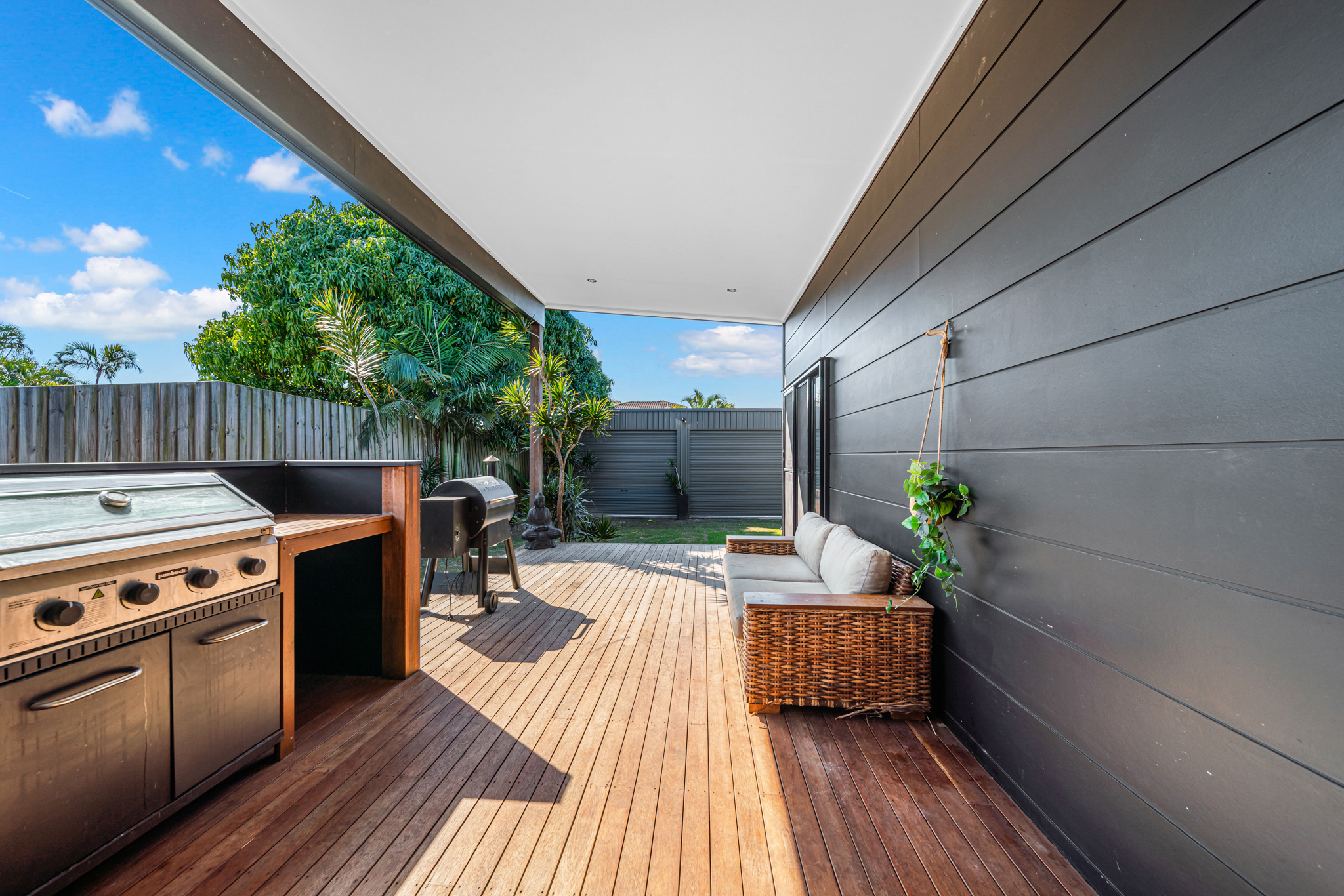 Outdoors, the back deck has a built-in BBQ area, ideal for alfresco dining and soaking up the sunshine. The fully fenced home offers privacy and security on a generous 708m² block, just a short walk from the beach.