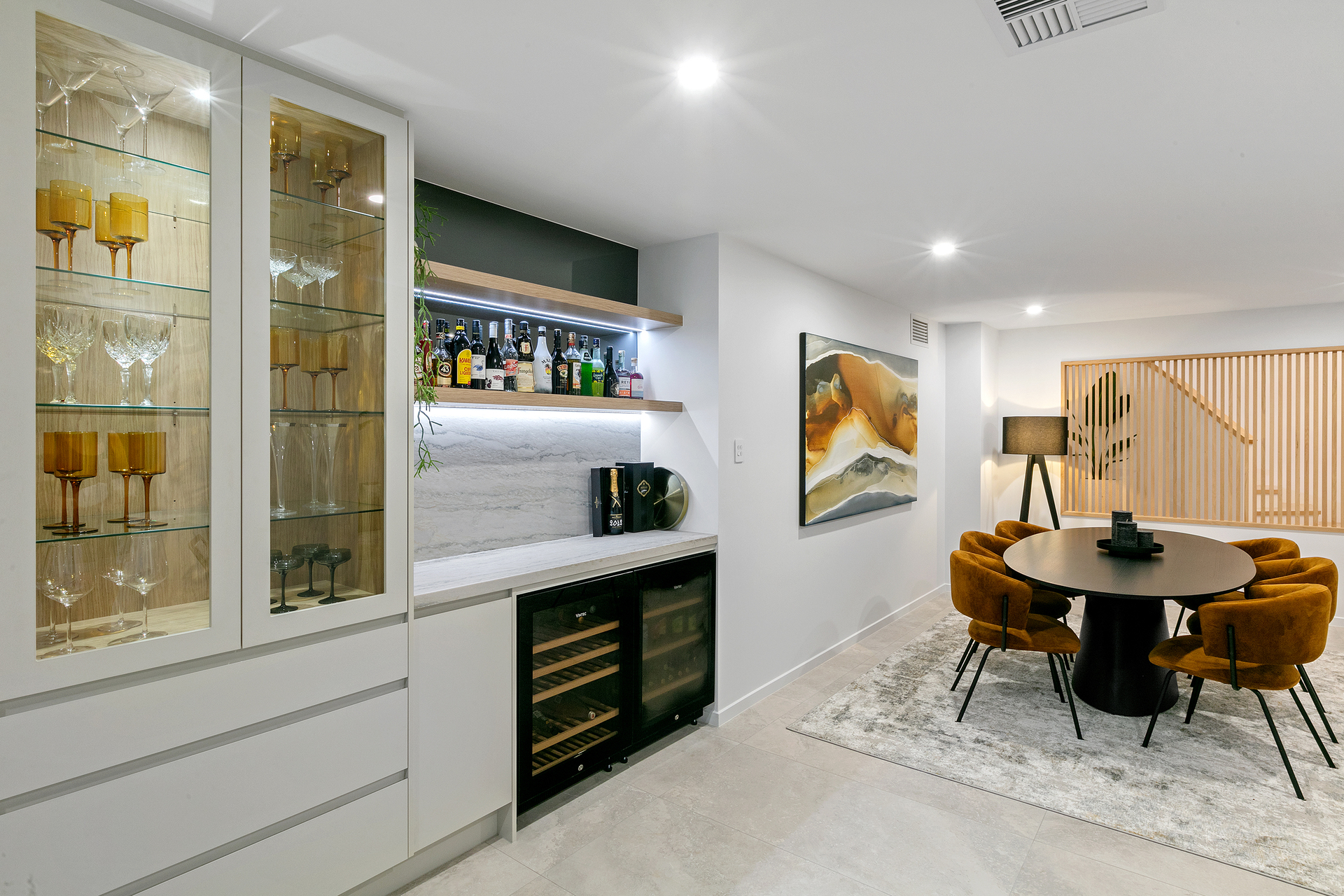 - Open butler's pantry with smoked mirror and herb garden - Indoor bar with under counter Vintec wine and beverage fridge