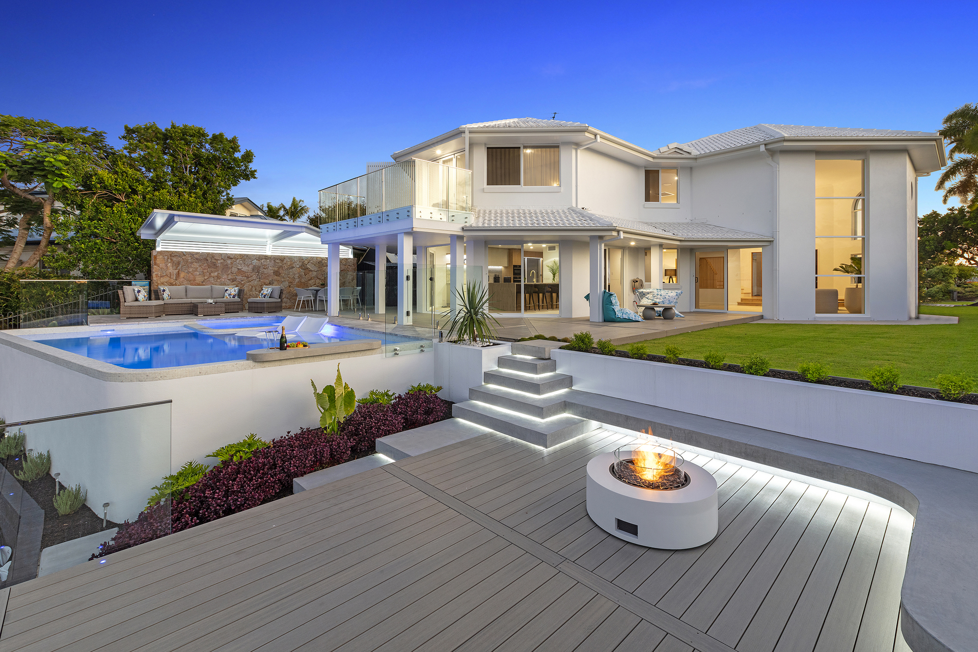 When the sun goes down the entertainment atmosphere lights up with LED floating concrete stairs down to the mesmerising glow of the sunken-lounge fire pit by the water.