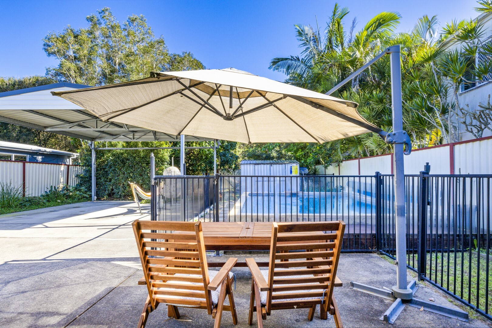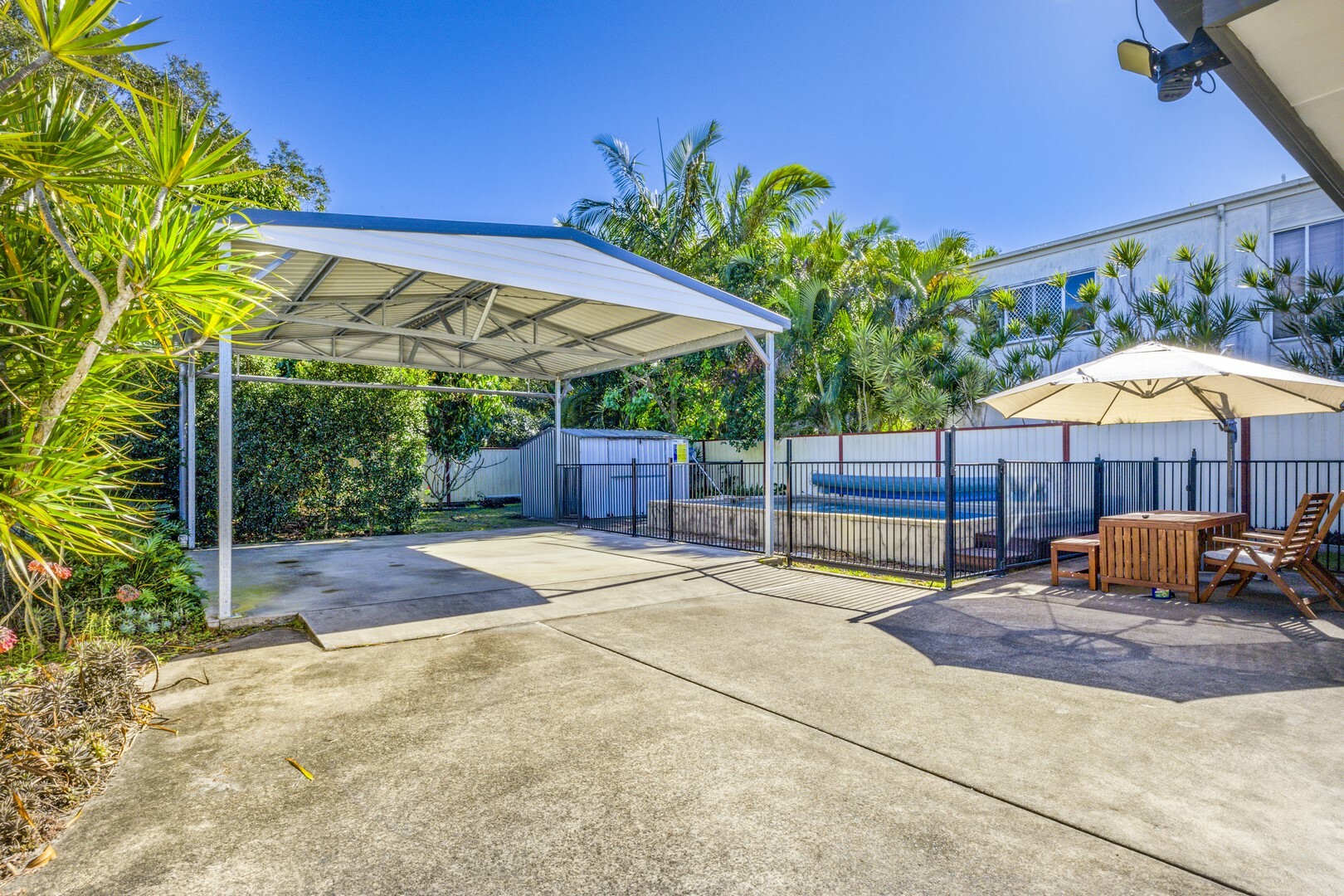 - Oversized double carport with an extra car space at the front