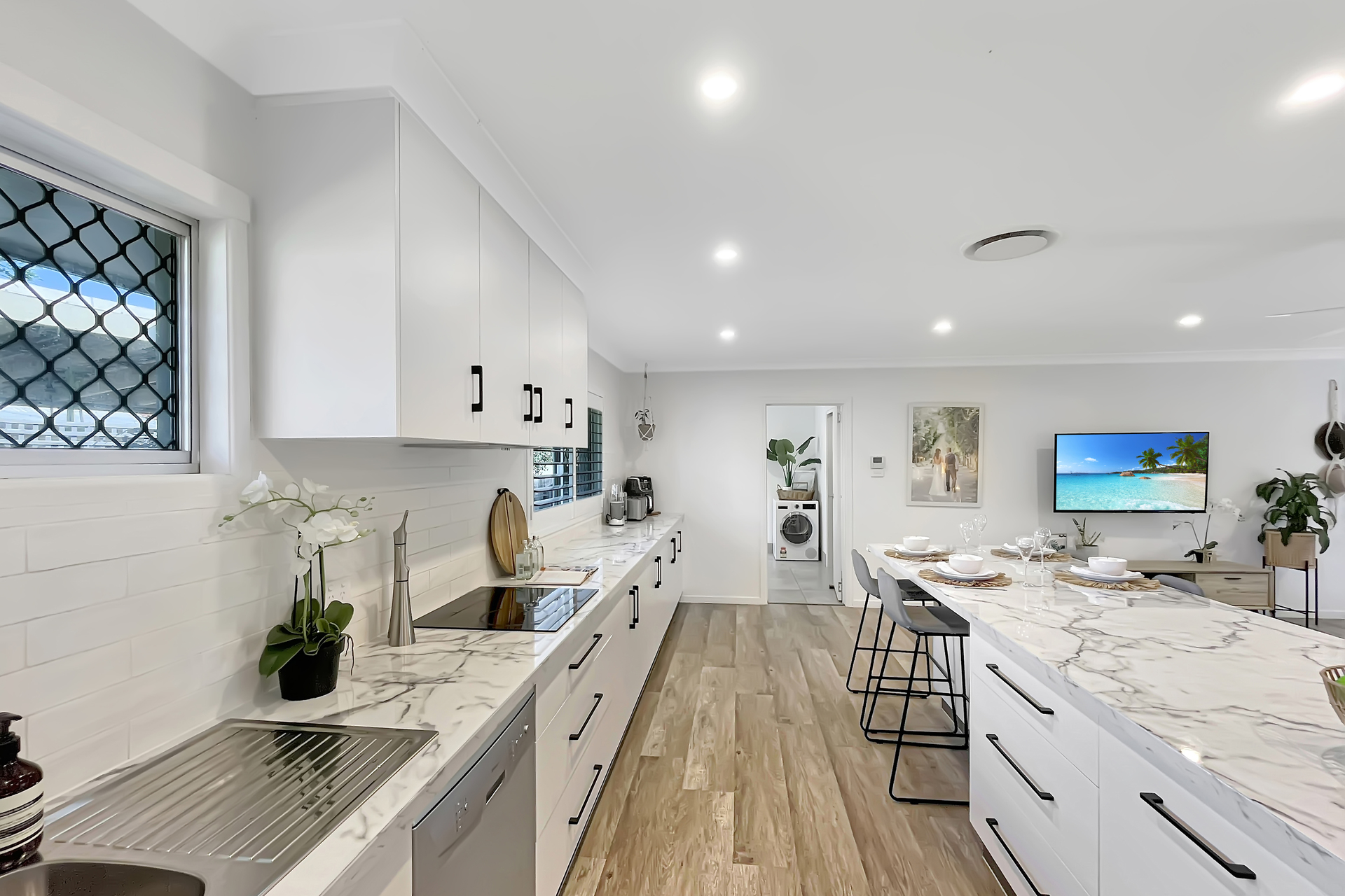 - Plantation shutters and vinyl flooring added to living room area and newly created master retreat - Brand new walk-through robe leads to a luxurious ensuite complete with walk-in shower with niche and separate toilet - Kitchen is the heart of the home with its powered island bench the star of the show - Laundry area has been reconfigured and provides additional powered pantry space