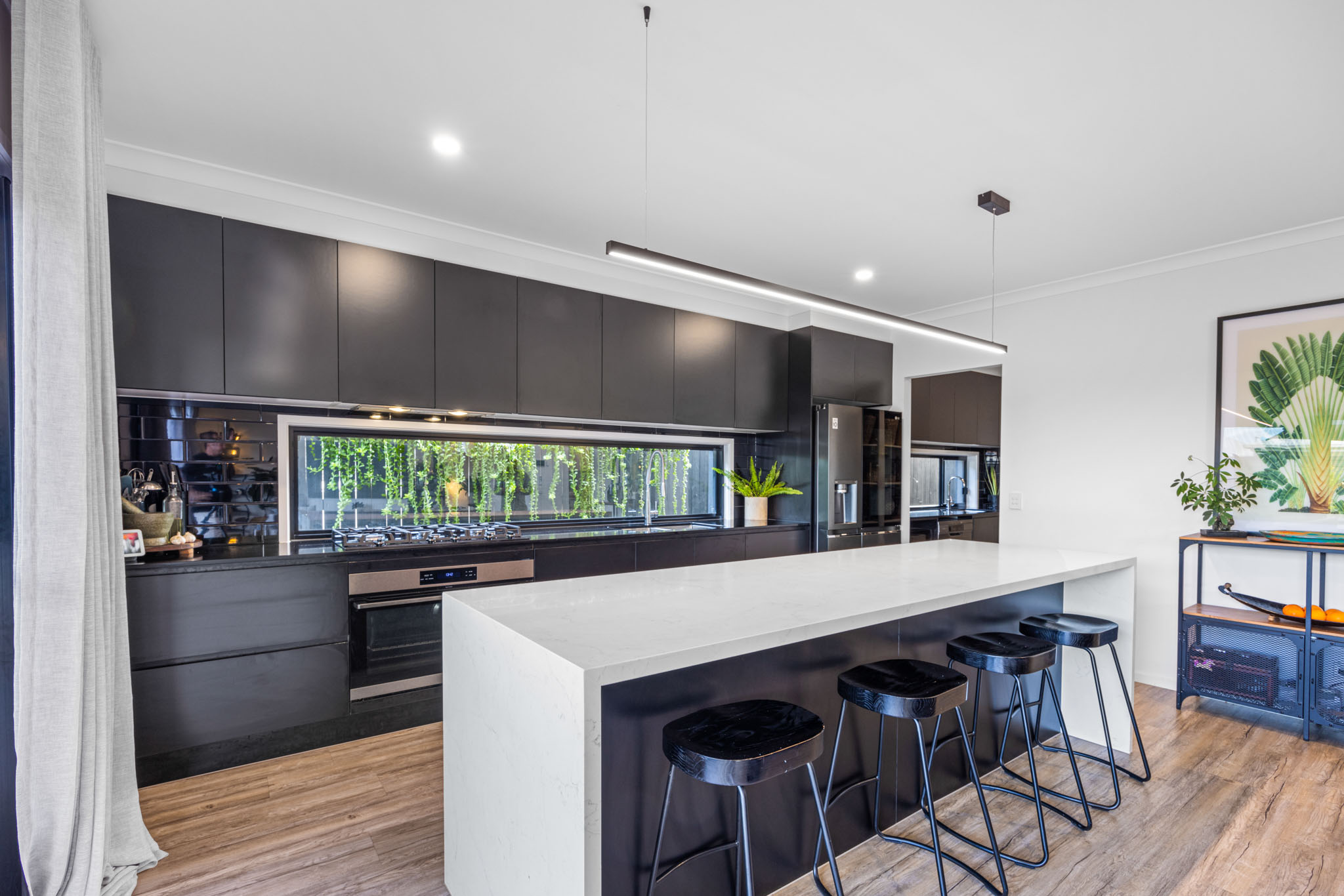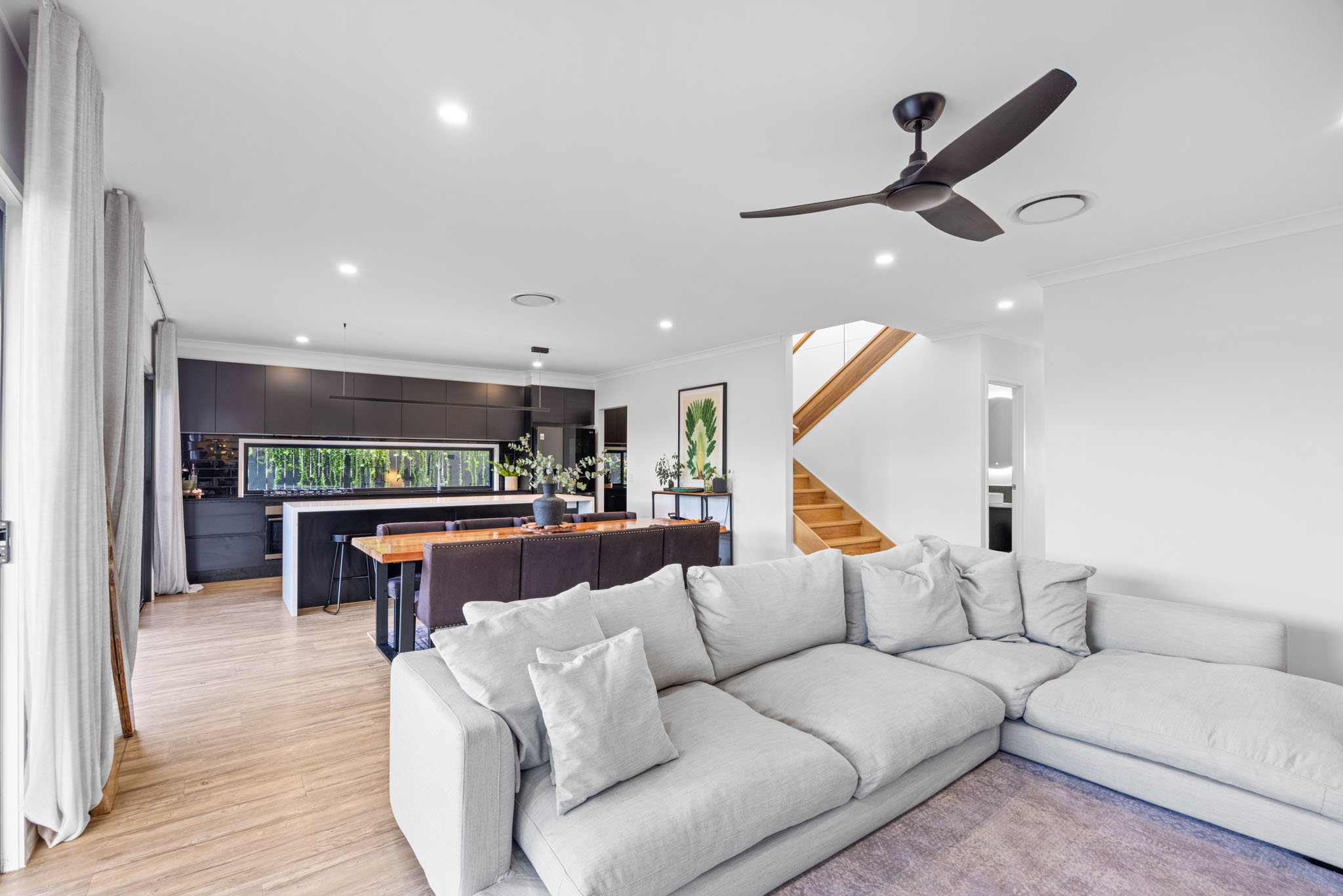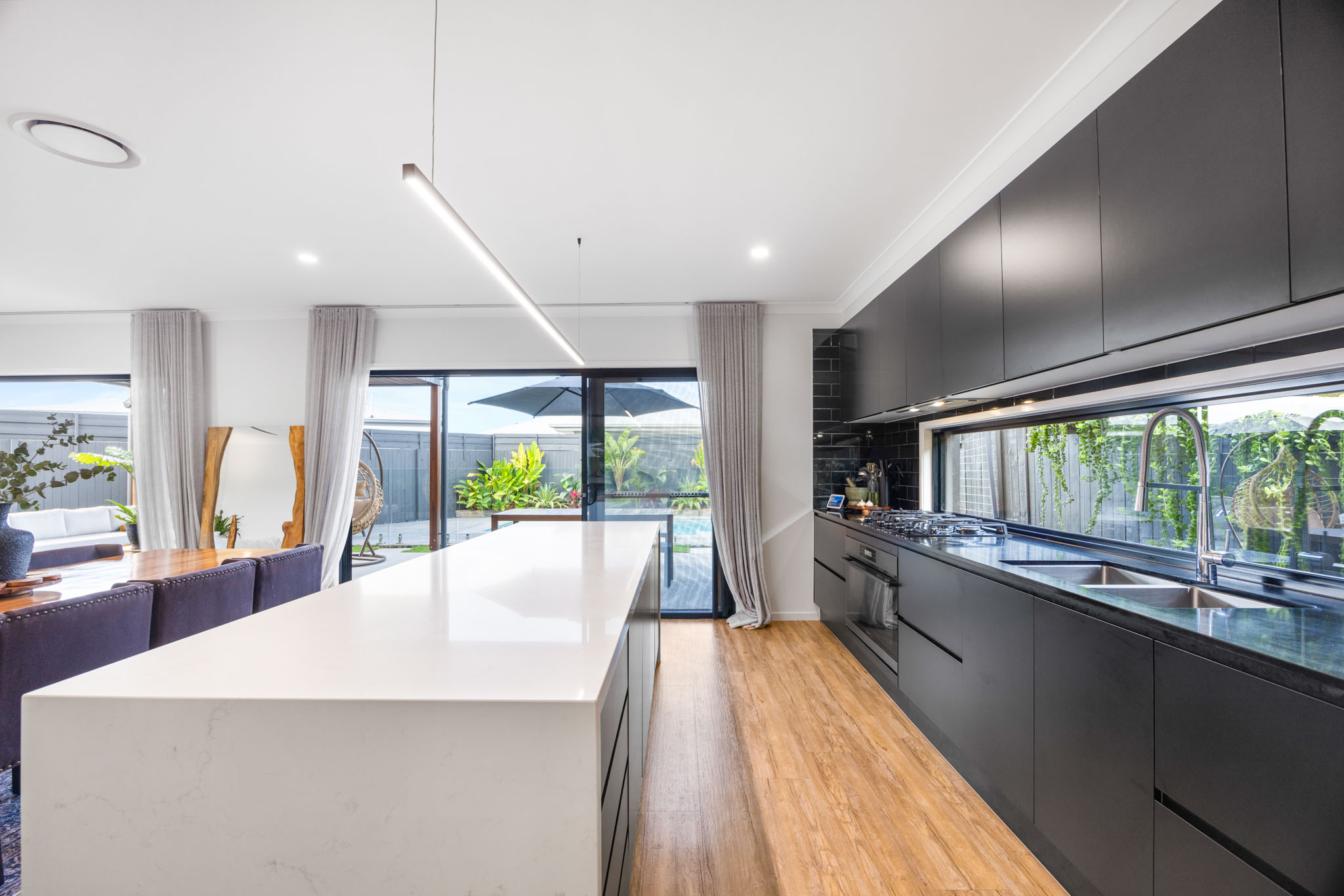 -Spacious Kitchen: Featuring 40mm waterfall stone benchtops, high-quality 900mm appliances, and a generous butler's pantry equipped with a sink, microwave, dishwasher, and open shelving. -High Ceilings: High ceilings throughout the home, creating an open and elegant atmosphere. -Open Plan Living: A large open plan dining and living area that seamlessly integrates with the outdoors through large stacker doors and luxurious floor-to-ceiling curtains. -Indoor-Outdoor Flow: Effortlessly transition from the indoor spaces to the large tiled covered alfresco area, perfect for entertaining and enjoying pool views. -Tropical Resort Pool: A beautifully landscaped pool area exuding a tropical resort vibe, ideal for relaxation, entertaining and recreation. -Convenient Downstairs Powder Room: A well-placed powder room downstairs for added convenience. -Ducted air-conditioning: Ensuring comfort across all seasons. -Generous Bedrooms: Four spacious bedrooms, including an oversized master suite with a luxurious double vanity ensuite and a walk-in robe (WIR). -Elegant Large Bathrooms: High-quality fixtures, stone benchtops and floor-to-ceiling tiles enhance the elegance of the bathrooms. -Upstairs Lounge: A large lounge room on the upper level provides additional space for relaxation and family activities. -Designer Landscaped Gardens: Beautifully designed gardens throughout the property, adding a touch of elegance and enhancing the overall ambiance. -Dual Living Dwelling: Includes a separate one-bedroom unit with a beautifully private outdoor deck, a large bedroom with an ensuite and walk-in robe (WIR), a fully equipped kitchen, and a spacious lounge and dining area.