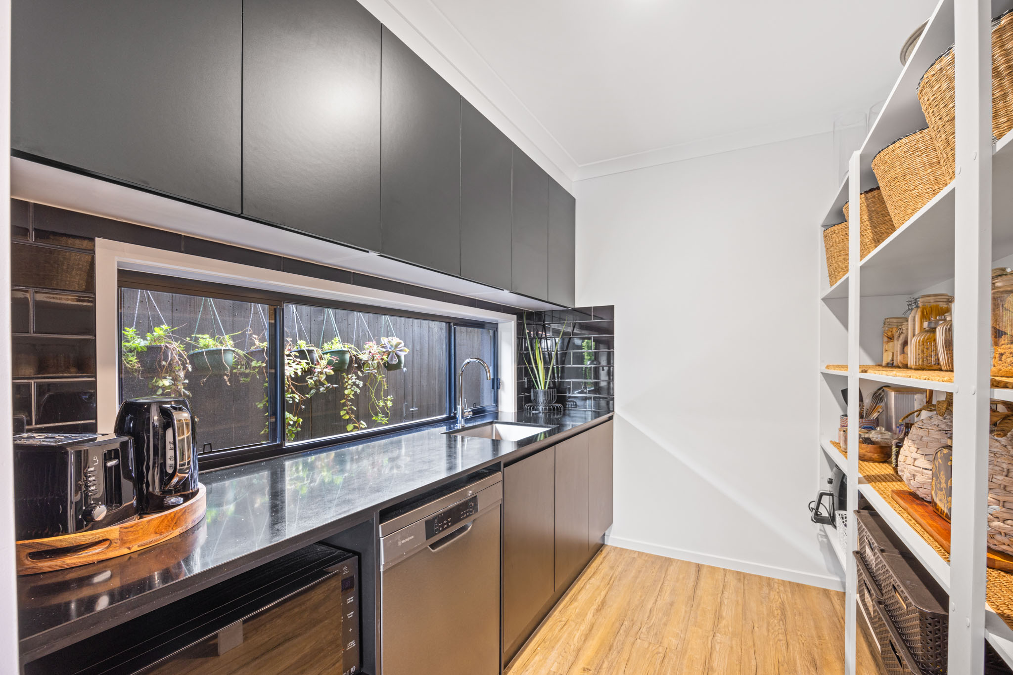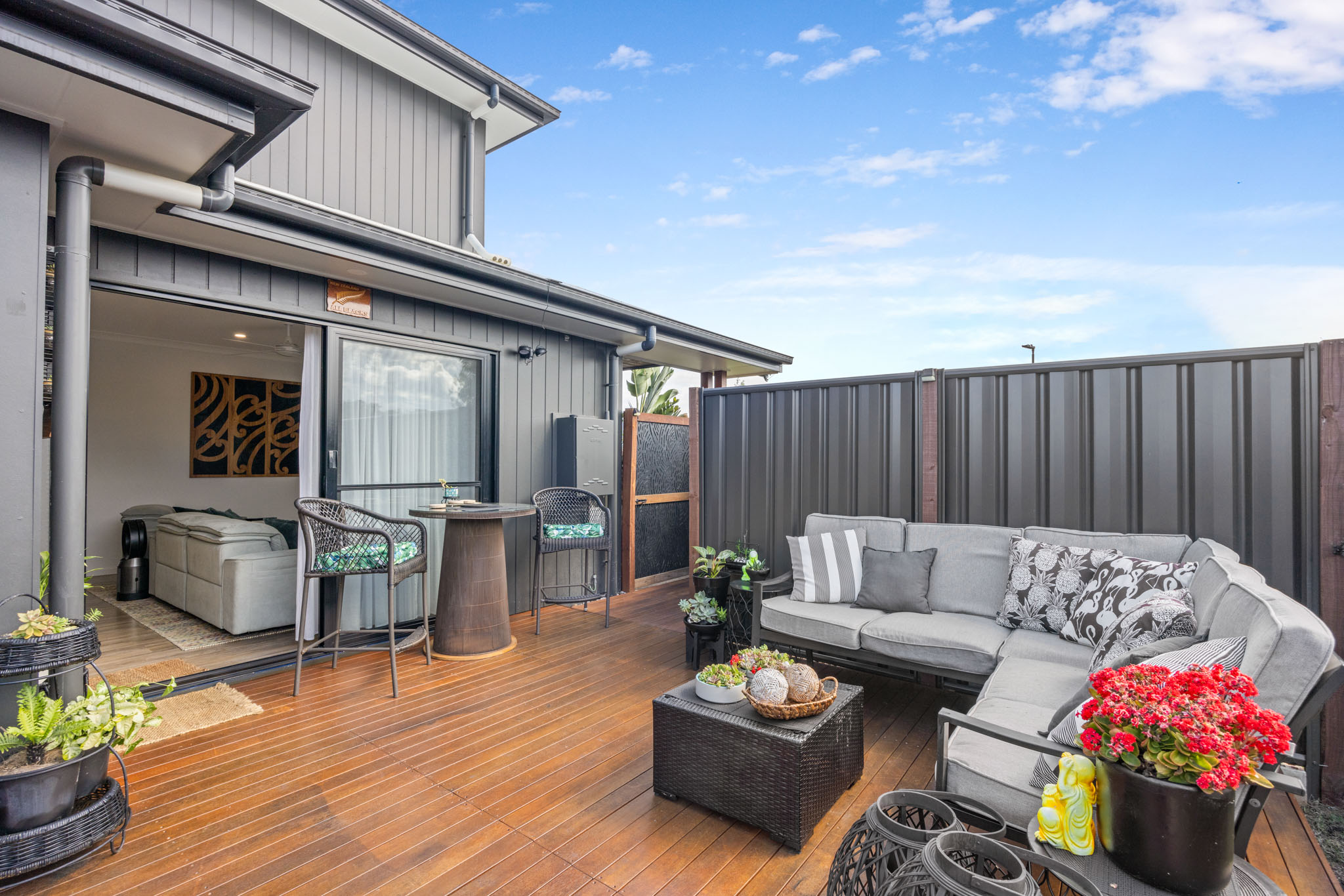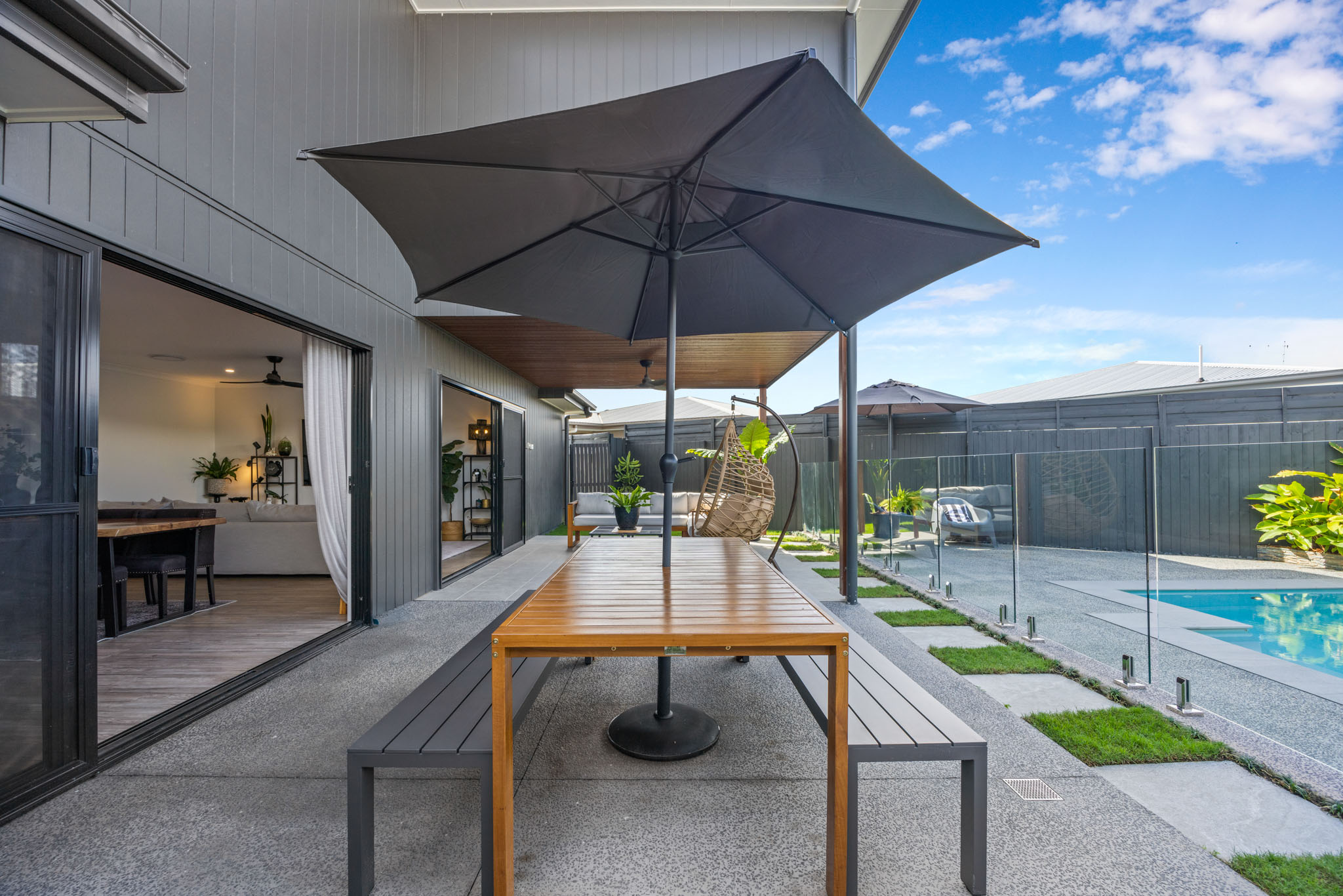 -Spacious Kitchen: Featuring 40mm waterfall stone benchtops, high-quality 900mm appliances, and a generous butler's pantry equipped with a sink, microwave, dishwasher, and open shelving. -High Ceilings: High ceilings throughout the home, creating an open and elegant atmosphere. -Open Plan Living: A large open plan dining and living area that seamlessly integrates with the outdoors through large stacker doors and luxurious floor-to-ceiling curtains. -Indoor-Outdoor Flow: Effortlessly transition from the indoor spaces to the large tiled covered alfresco area, perfect for entertaining and enjoying pool views. -Tropical Resort Pool: A beautifully landscaped pool area exuding a tropical resort vibe, ideal for relaxation, entertaining and recreation. -Convenient Downstairs Powder Room: A well-placed powder room downstairs for added convenience. -Ducted air-conditioning: Ensuring comfort across all seasons. -Generous Bedrooms: Four spacious bedrooms, including an oversized master suite with a luxurious double vanity ensuite and a walk-in robe (WIR). -Elegant Large Bathrooms: High-quality fixtures, stone benchtops and floor-to-ceiling tiles enhance the elegance of the bathrooms. -Upstairs Lounge: A large lounge room on the upper level provides additional space for relaxation and family activities. -Designer Landscaped Gardens: Beautifully designed gardens throughout the property, adding a touch of elegance and enhancing the overall ambiance. -Dual Living Dwelling: Includes a separate one-bedroom unit with a beautifully private outdoor deck, a large bedroom with an ensuite and walk-in robe (WIR), a fully equipped kitchen, and a spacious lounge and dining area.