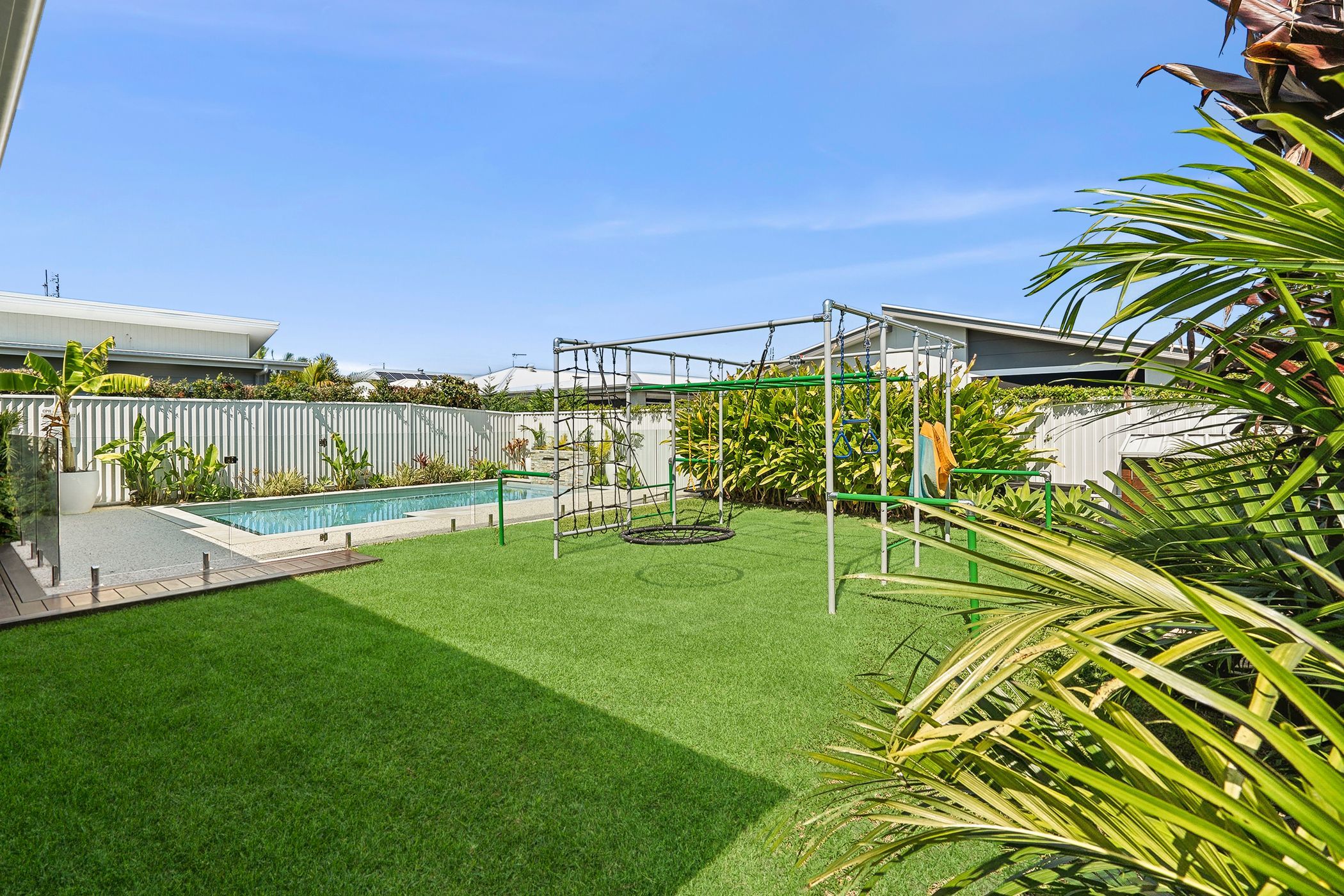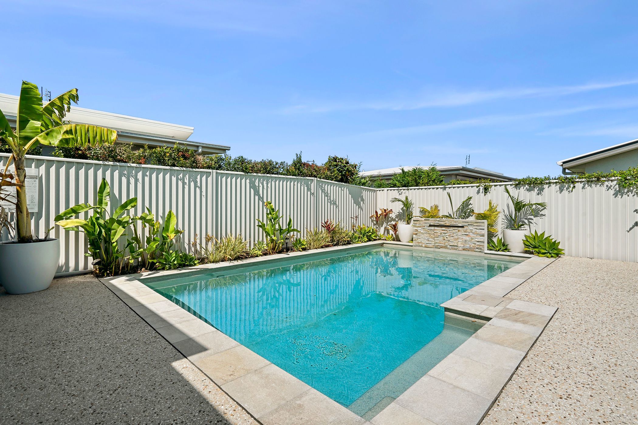 - Delightful in-ground heated swimming pool with waterfall feature - Grass area with small veg patch