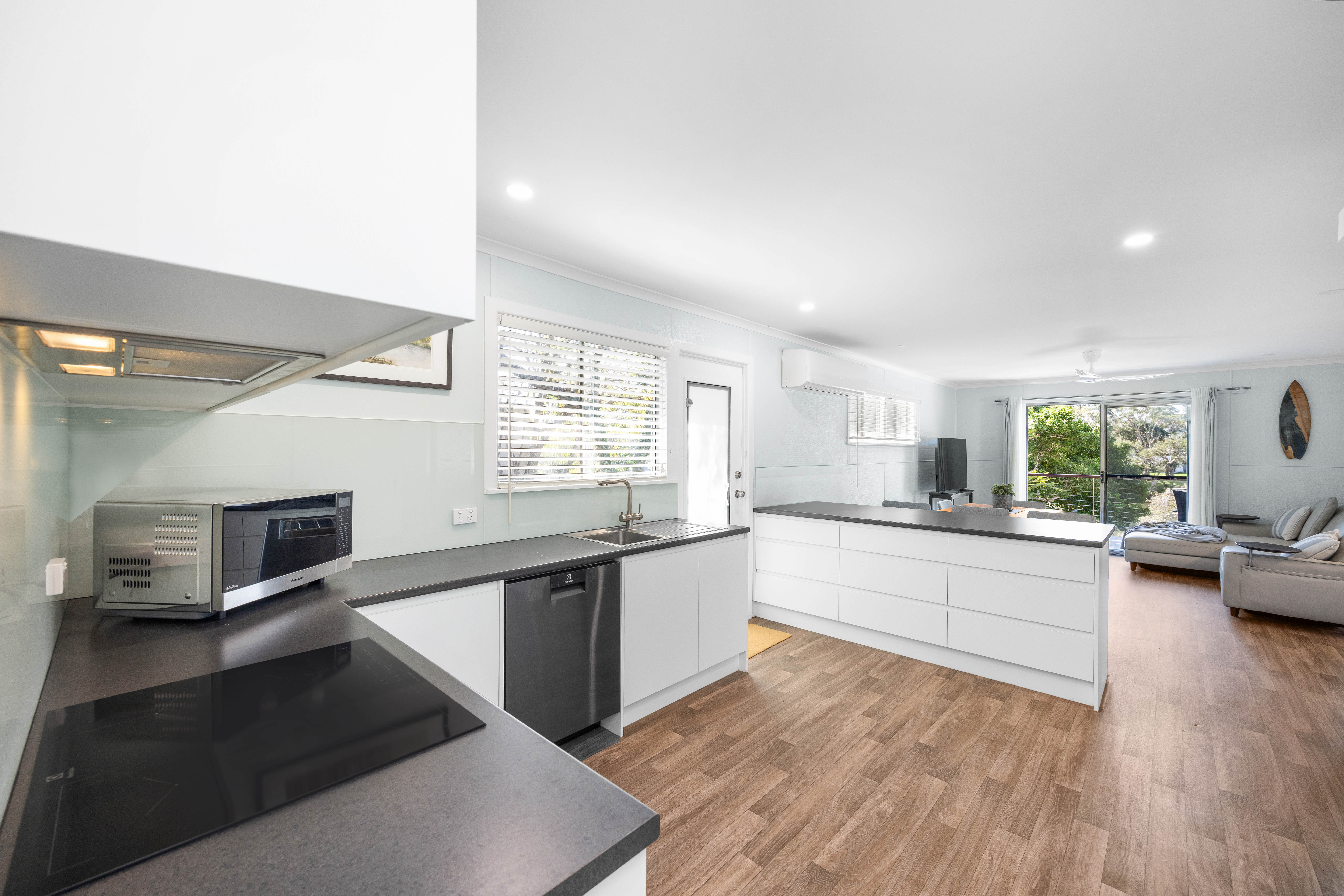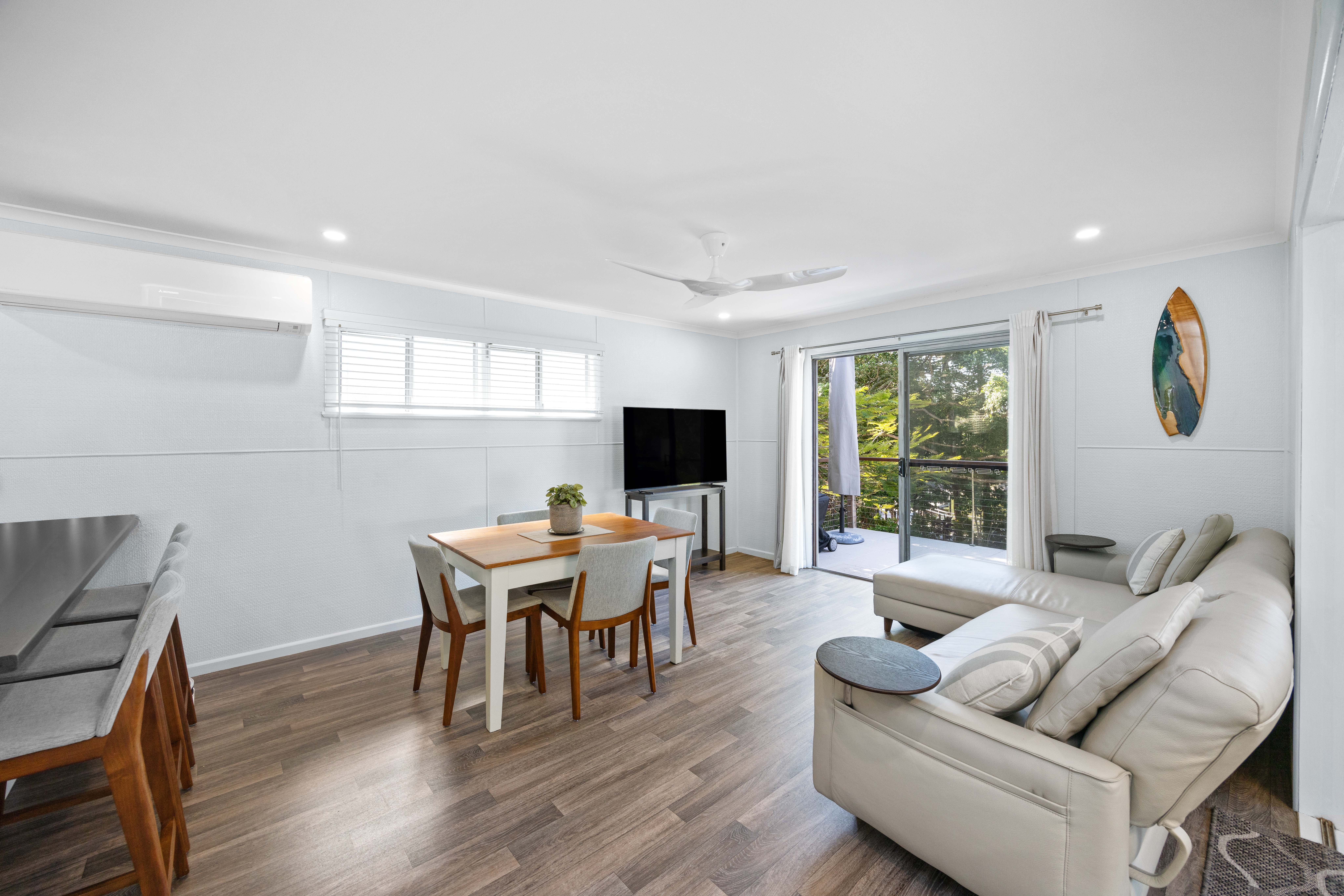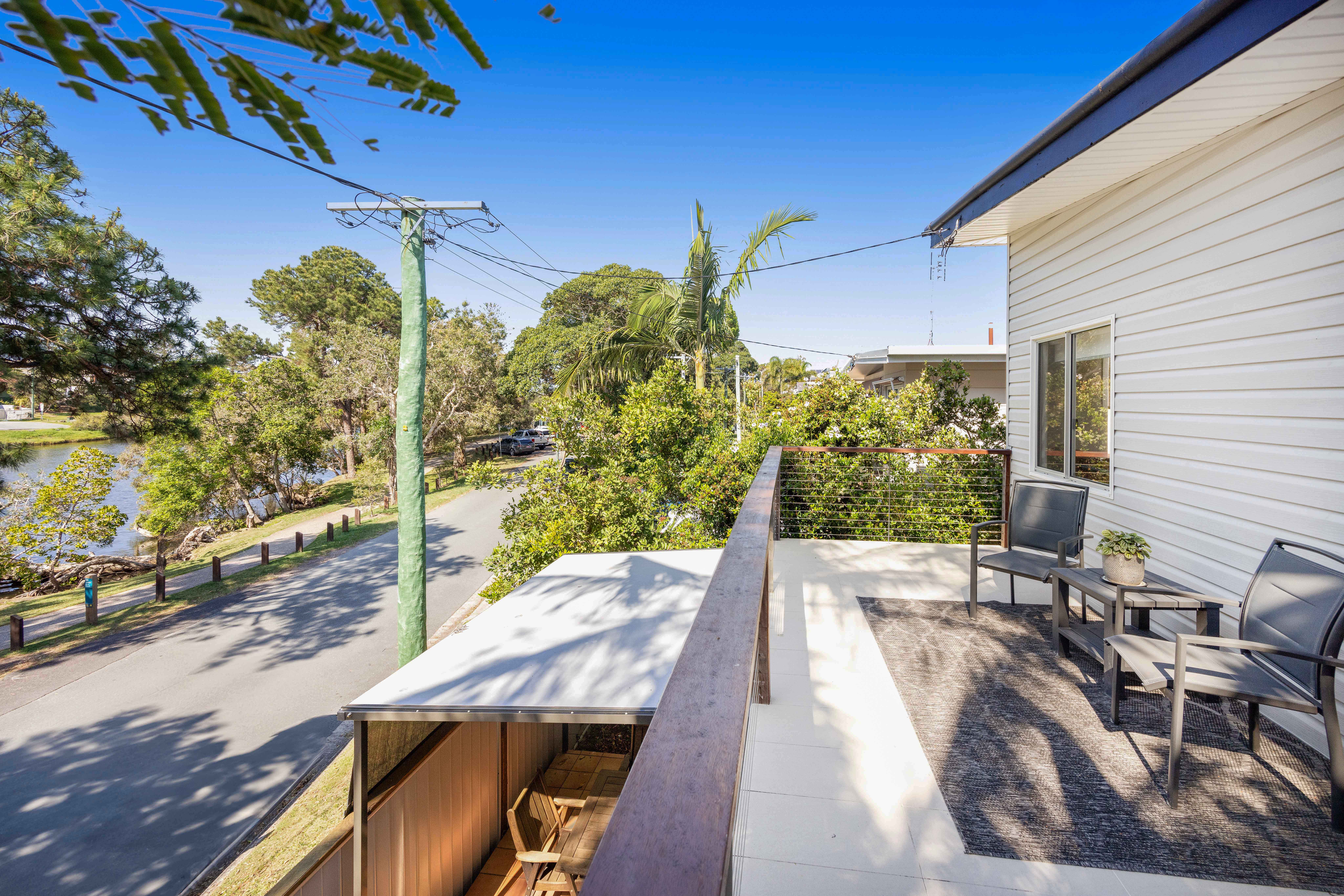 The home features an open plan living area which spills onto the front deck overlooking the leafy waterfront and ocean beyond - perfect for afternoon drinks at the end of a busy day at the beach.