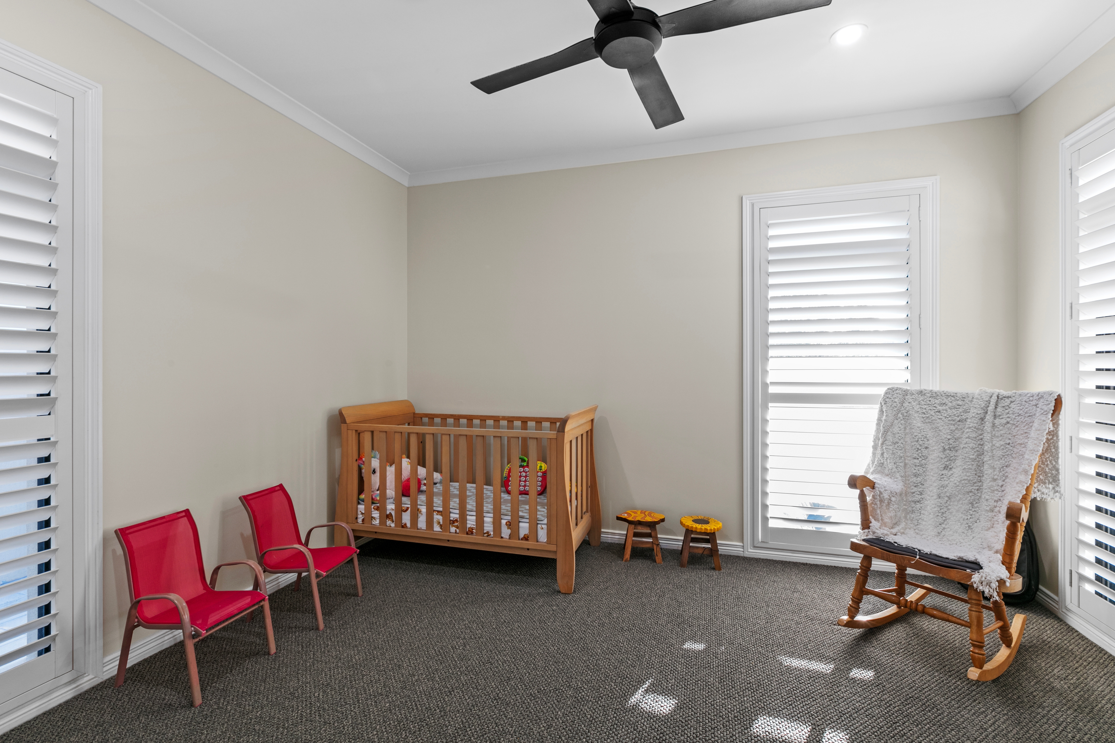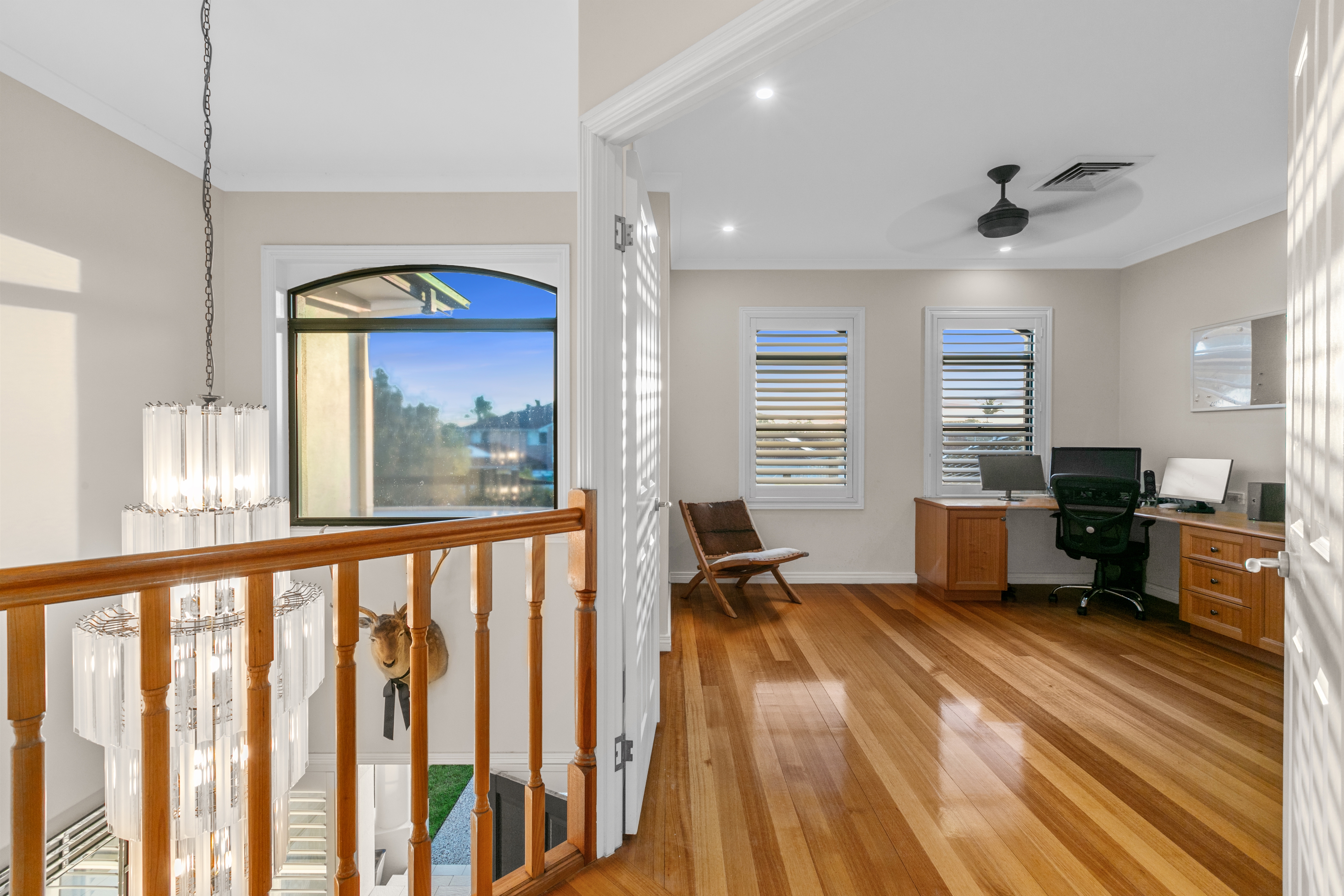 The upper level is dedicated to the master suite, offering a luxurious private retreat. Complete with a walk-in robe and a stylish ensuite, the suite extends to a private balcony where you can unwind and take in sweeping views of the manicured gardens, the glistening pool, and Golden Beach skyline. A spacious study, which can also serve as a fourth bedroom, adds versatility to the upper floor, making it a perfect haven for relaxation or productivity.