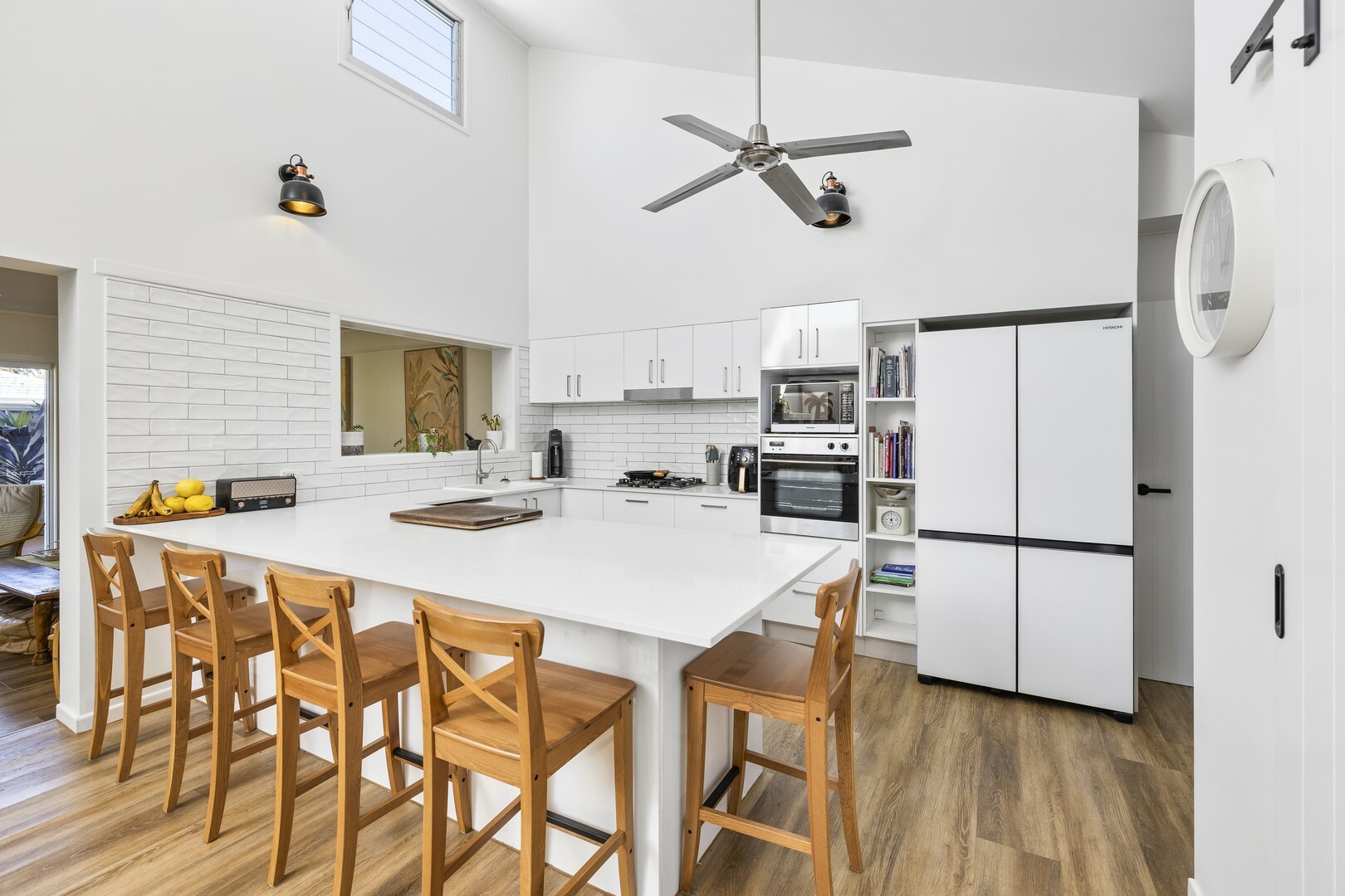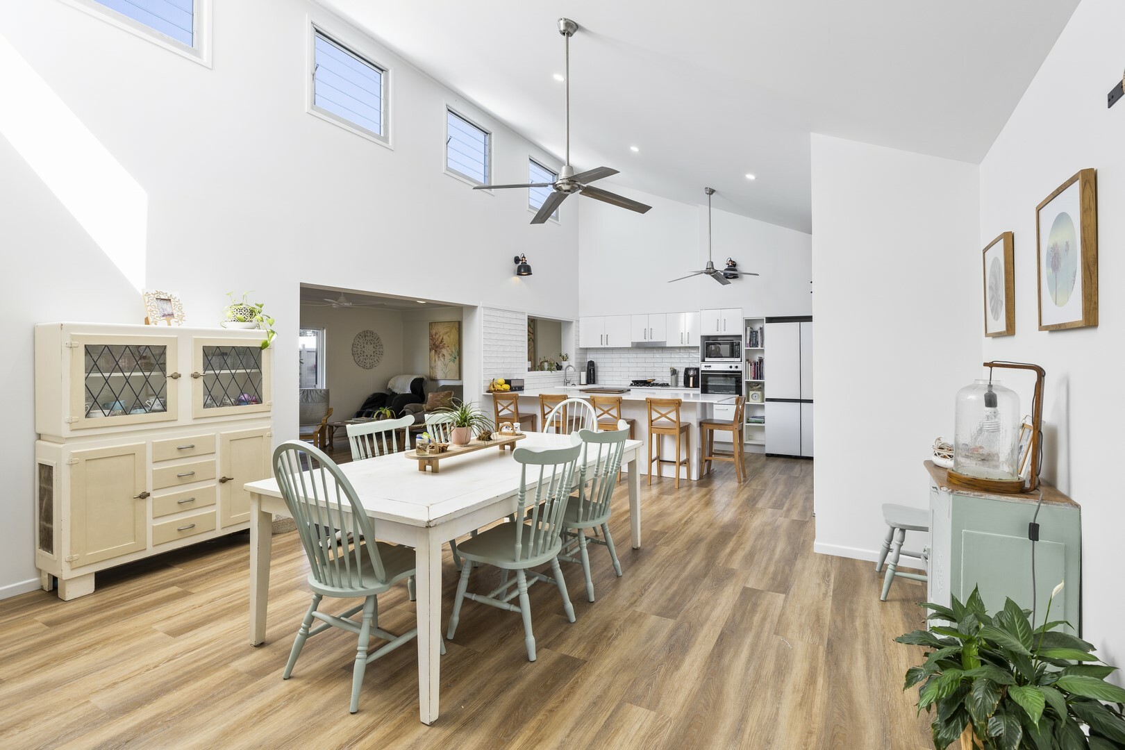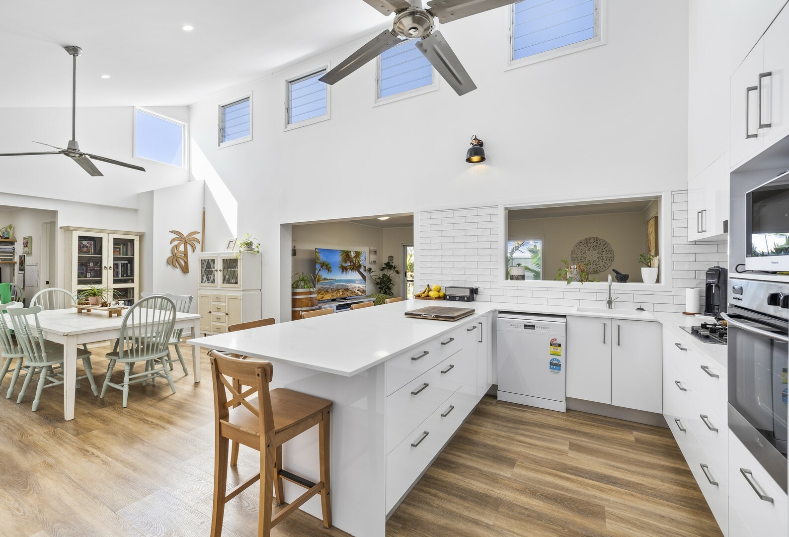 - Spacious open plan living with sky high ceiling and feature windows and louvres that flood the area with natural light, warmth and cross ventilation