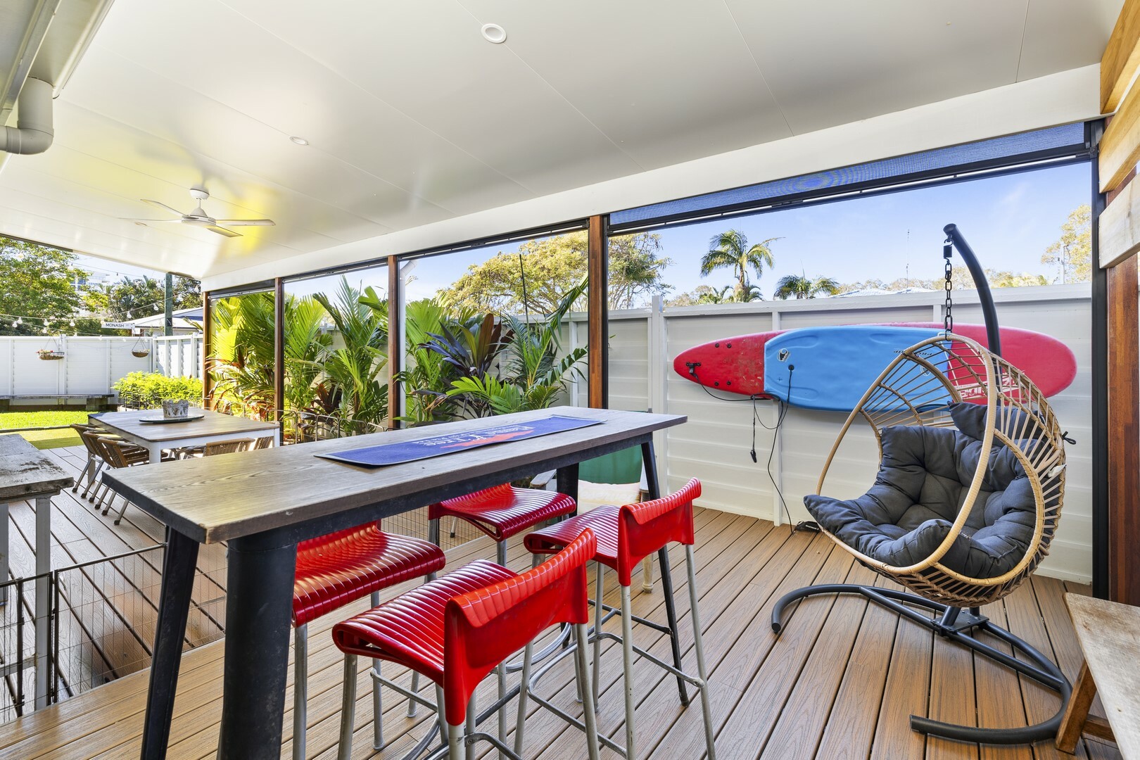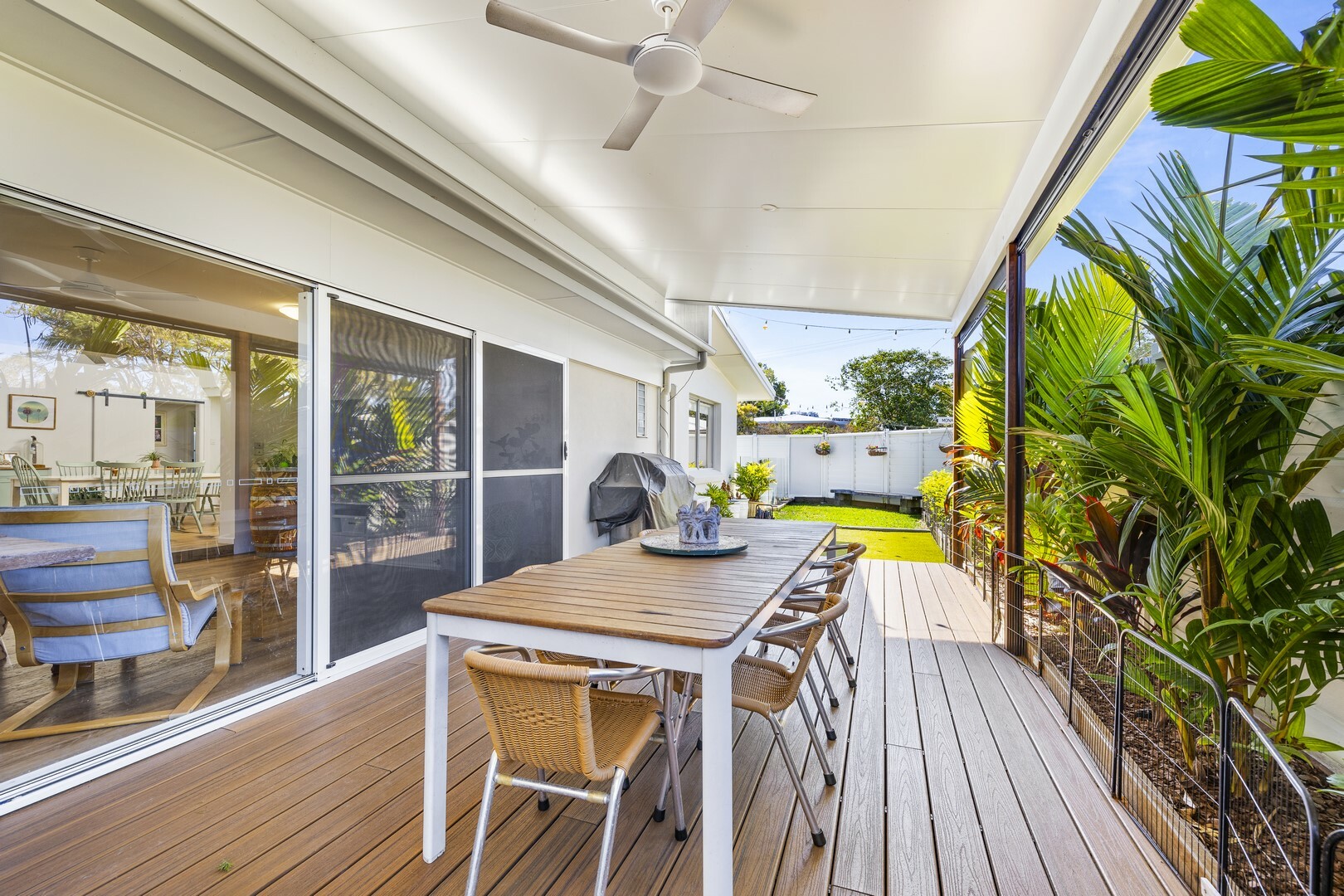 - Large outdoor covered timber decking areas for dining and entertaining. A private space with high fence and pull down blinds to keep weather out will soon become a family favourite space