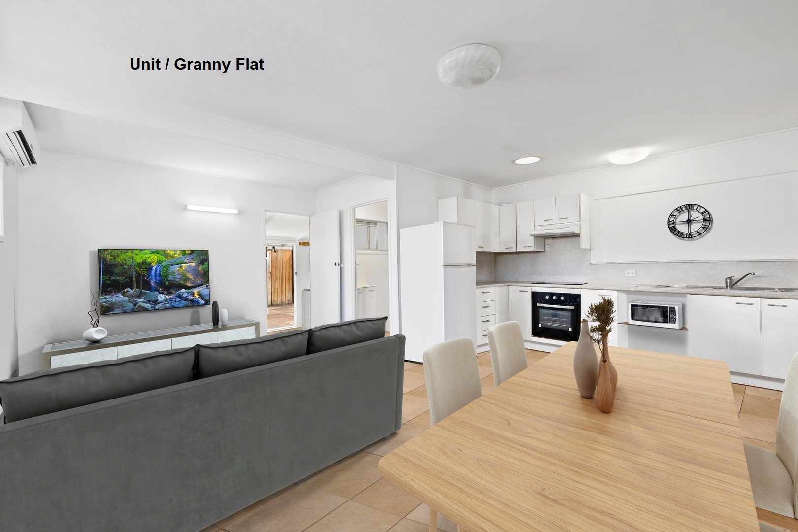 - Open plan living, dining and kitchen area with air-conditioning