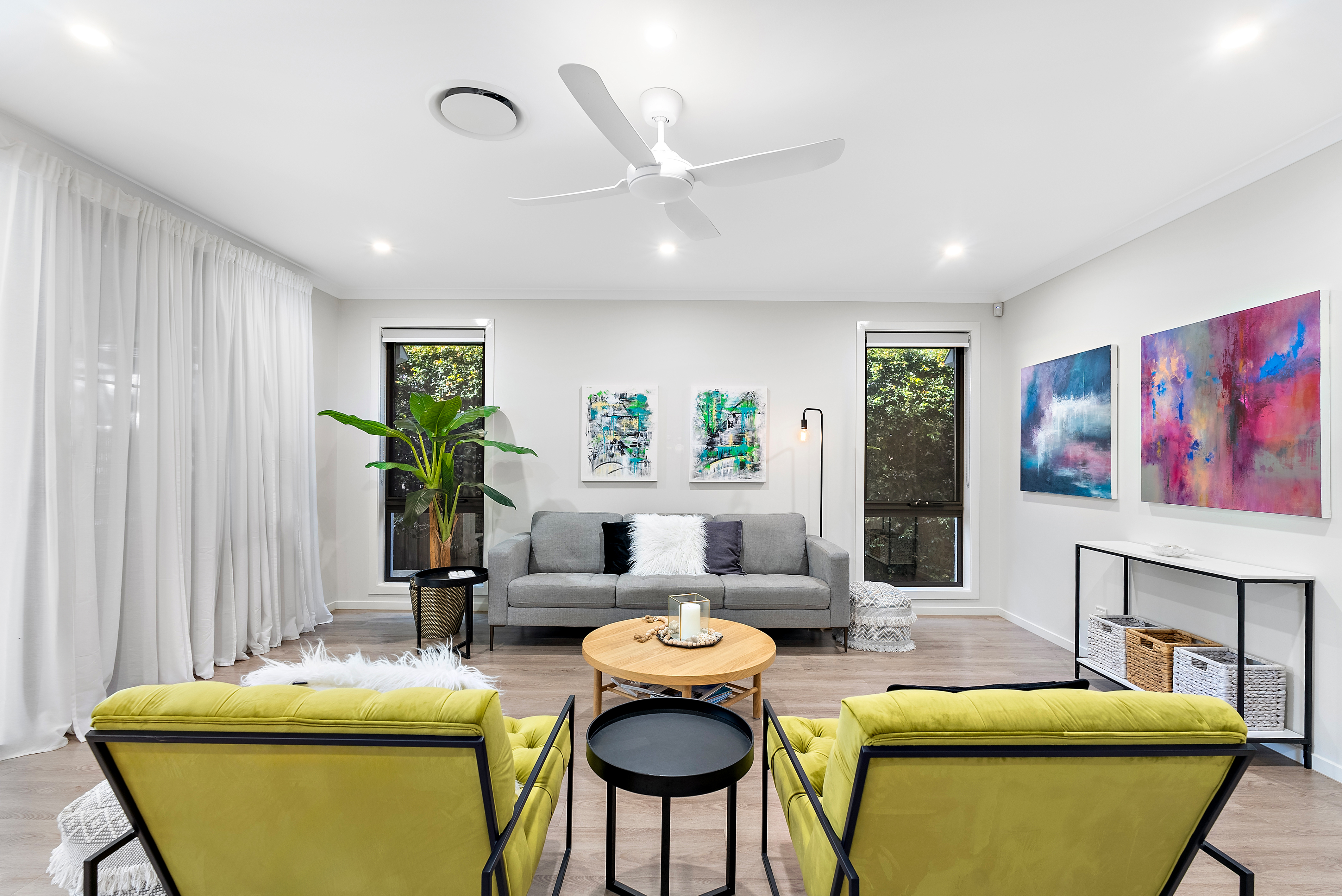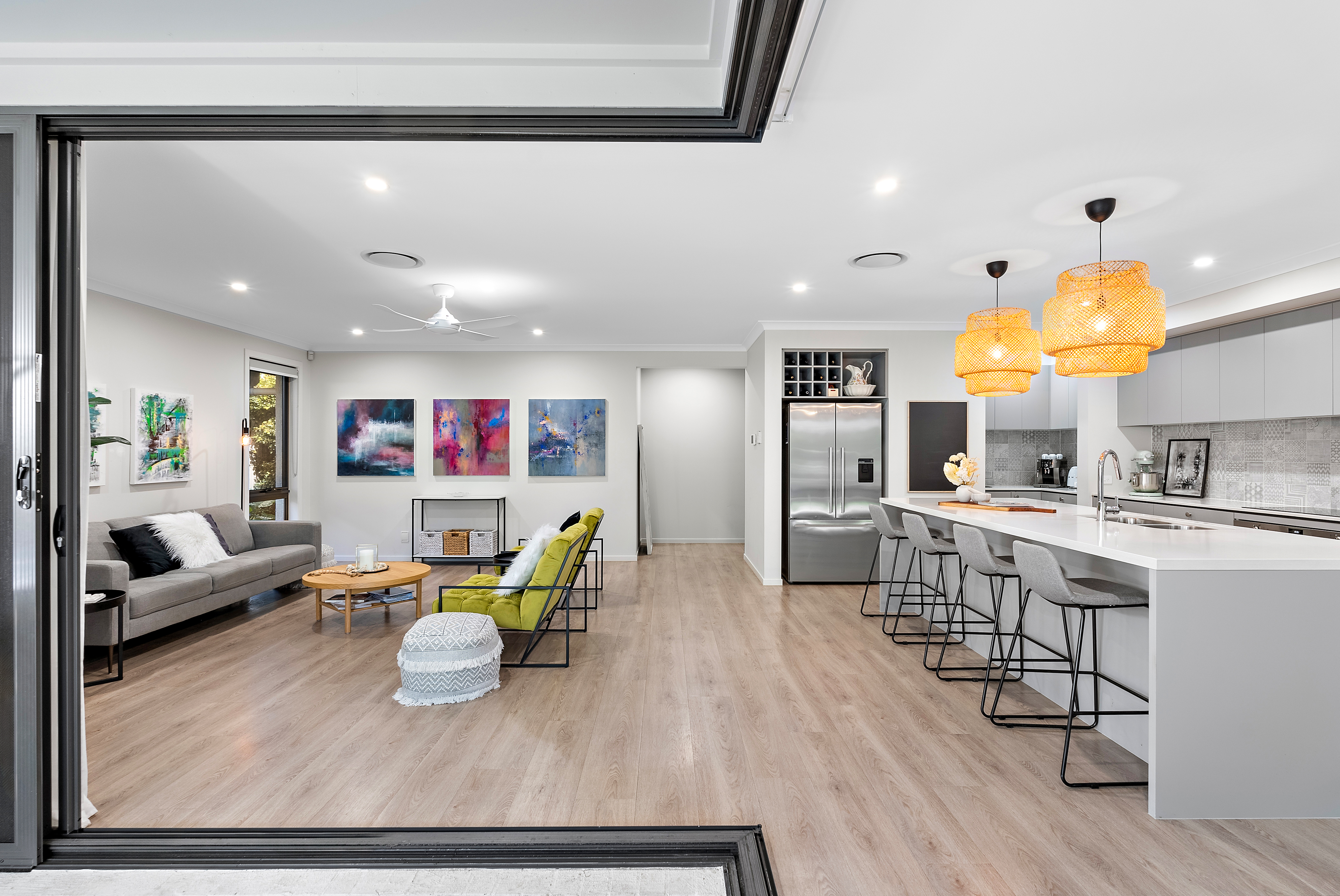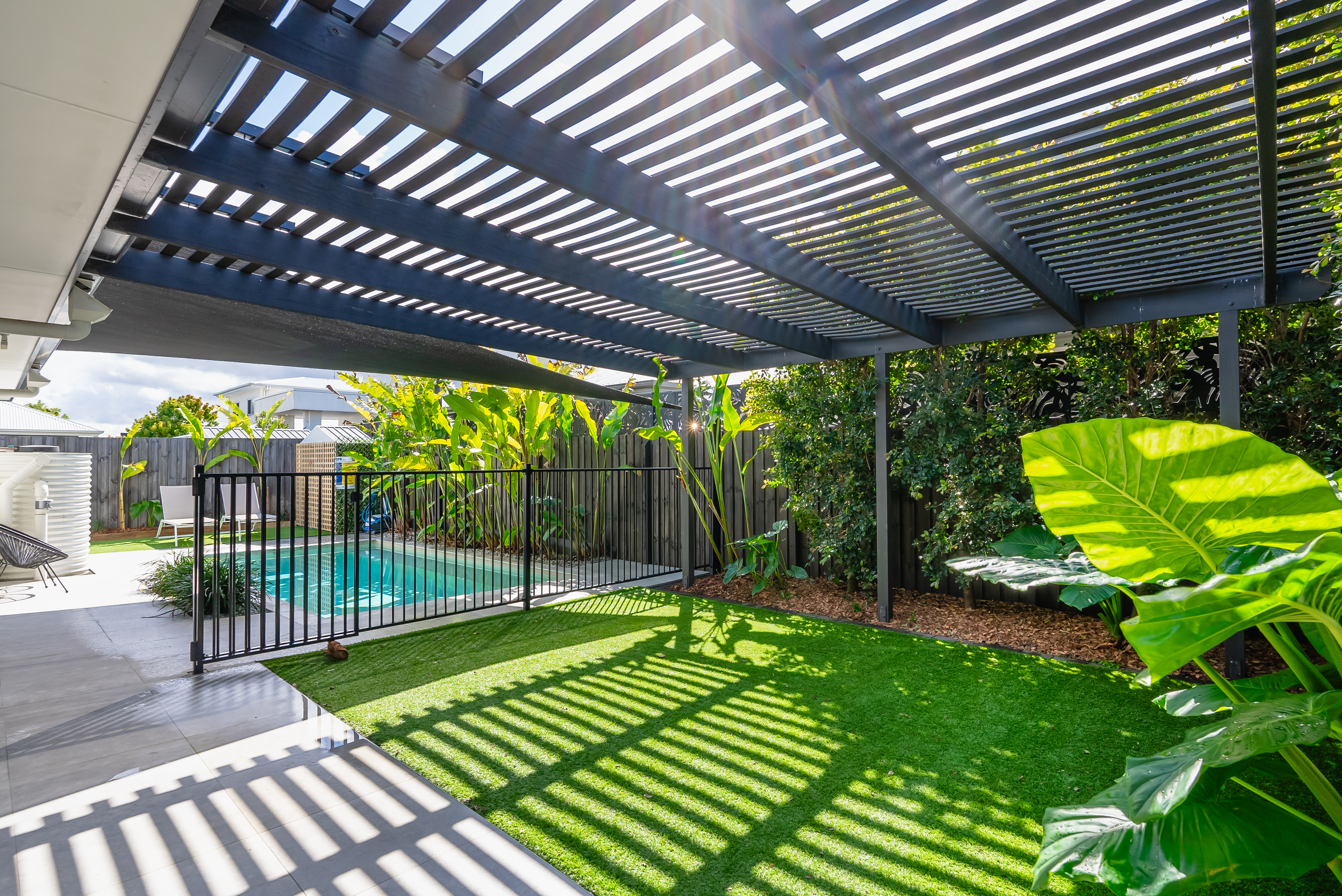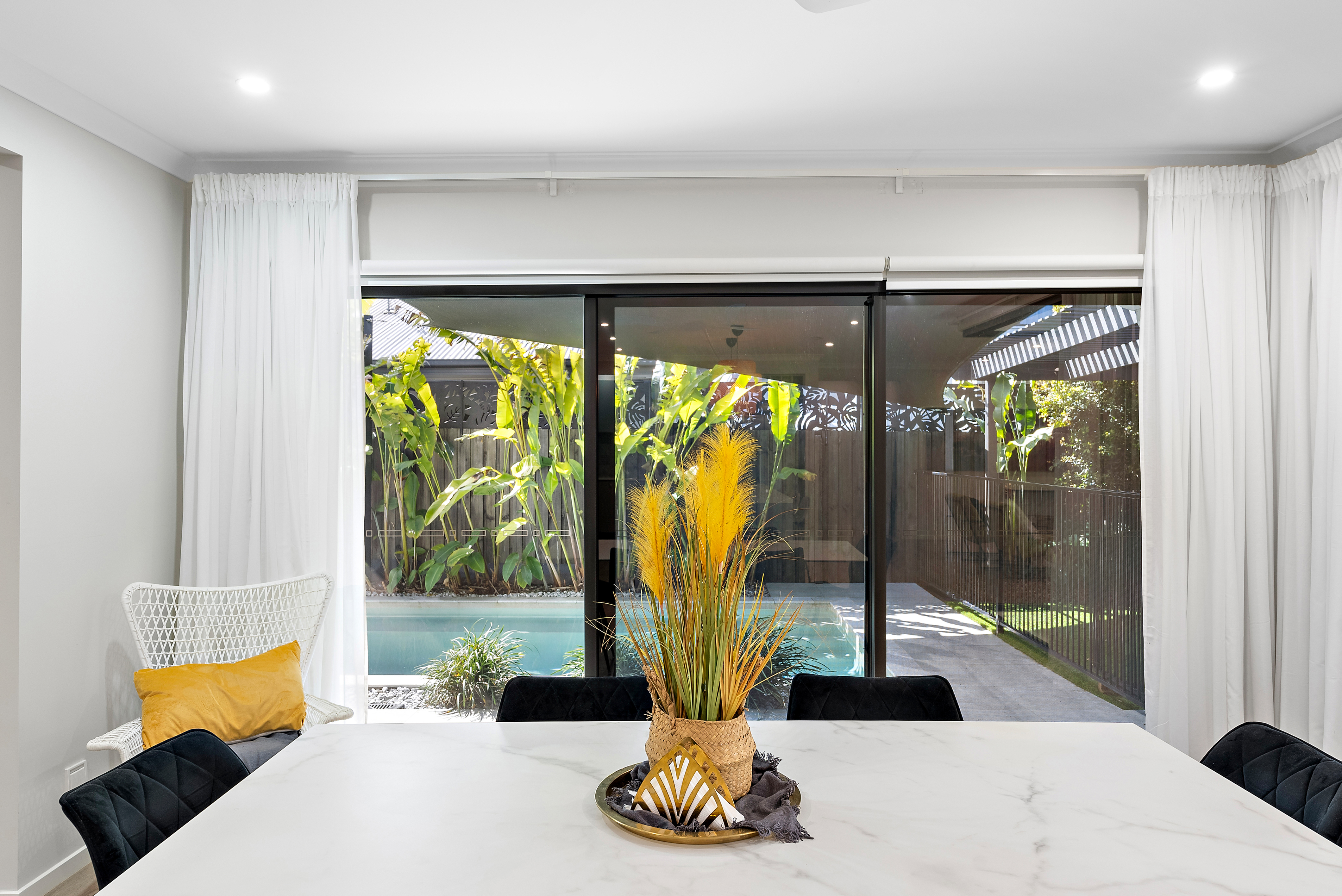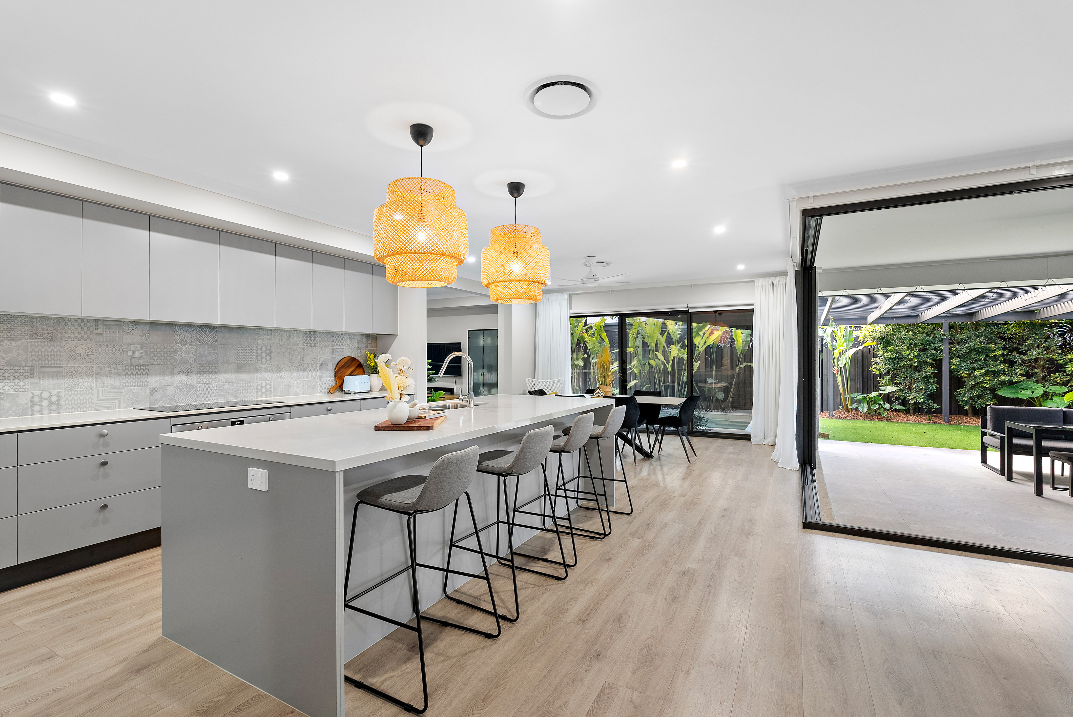 - Welcoming entrance with a grand timber door, security screen, established plants, and wide paths - Expansive open-plan living and dining area flowing outside to alfresco entertaining and the swimming pool - Entertainer's kitchen with pendant lighting, an opulent kitchen island with 40mm stone bench-top , stunning feature tile splashback, and in-built sink - Quality SMEG appliances, including a 900mm oven, induction hob, stainless steel dishwasher, built-in microwave, and plumbing connected to the fridge cavity - Butler's pantry with a sink, extended bench-top, kitchen splashback, power sockets, ample storage, and overhead cabinetry - Dining area with stunning floor-to-ceiling stacking windows and magnificent pool views - Corner stacking sliding doors dressed with floor-to-ceiling sheers - Security screens to welcome afternoon breezes, allowing the space to open completely or close up stunning views while keeping the ducted air inside - Lounge flowing outside to the large alfresco entertaining area with connective views to the pool - Multi-zoned outdoor living space featuring an extensive covered alfresco area, pergola, artificial turf, and lush established greenery for ultimate privacy and filtered sunlight, along with a tiled patio for soaking up the sun by the pool - Heated swimming pool for year-round enjoyment