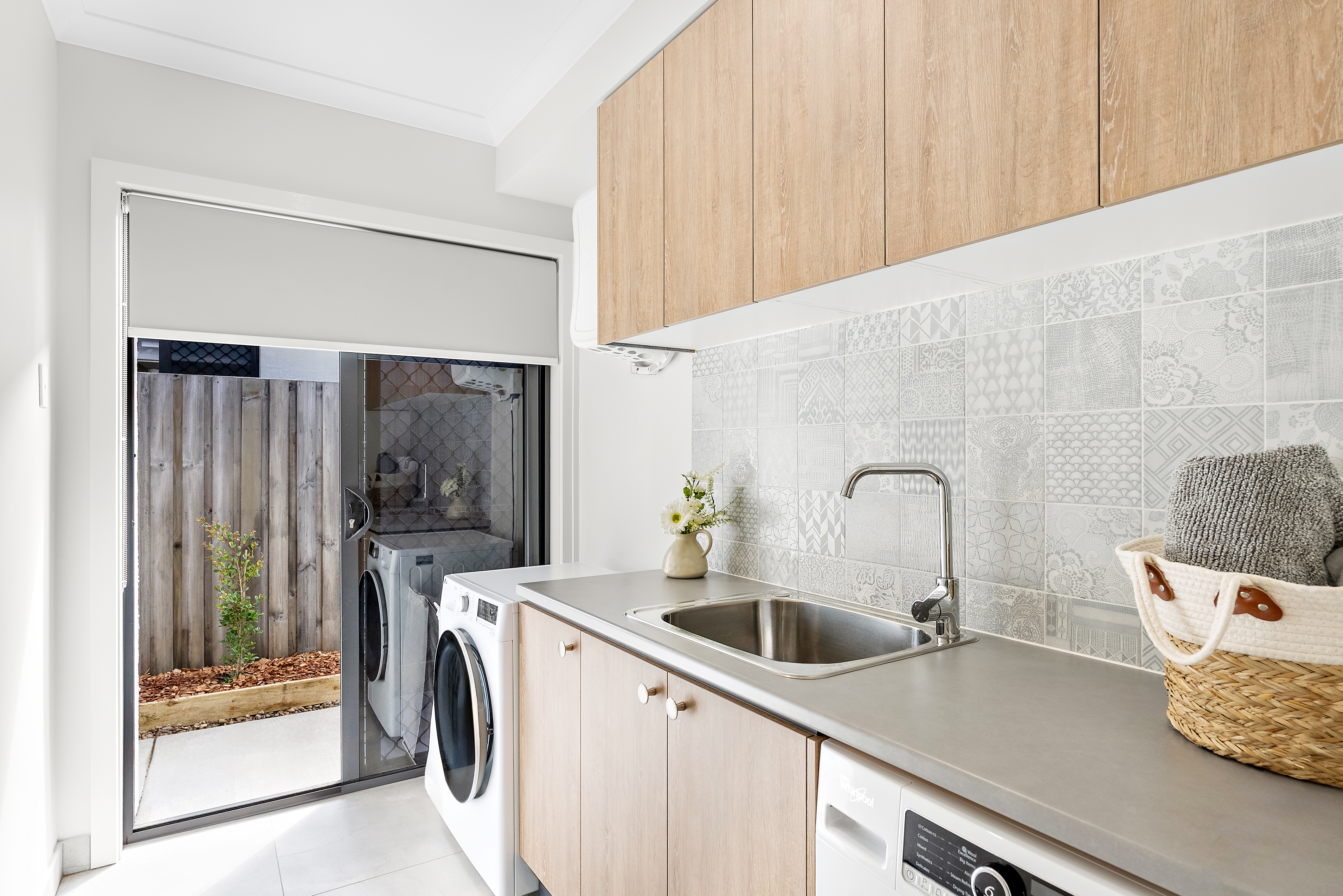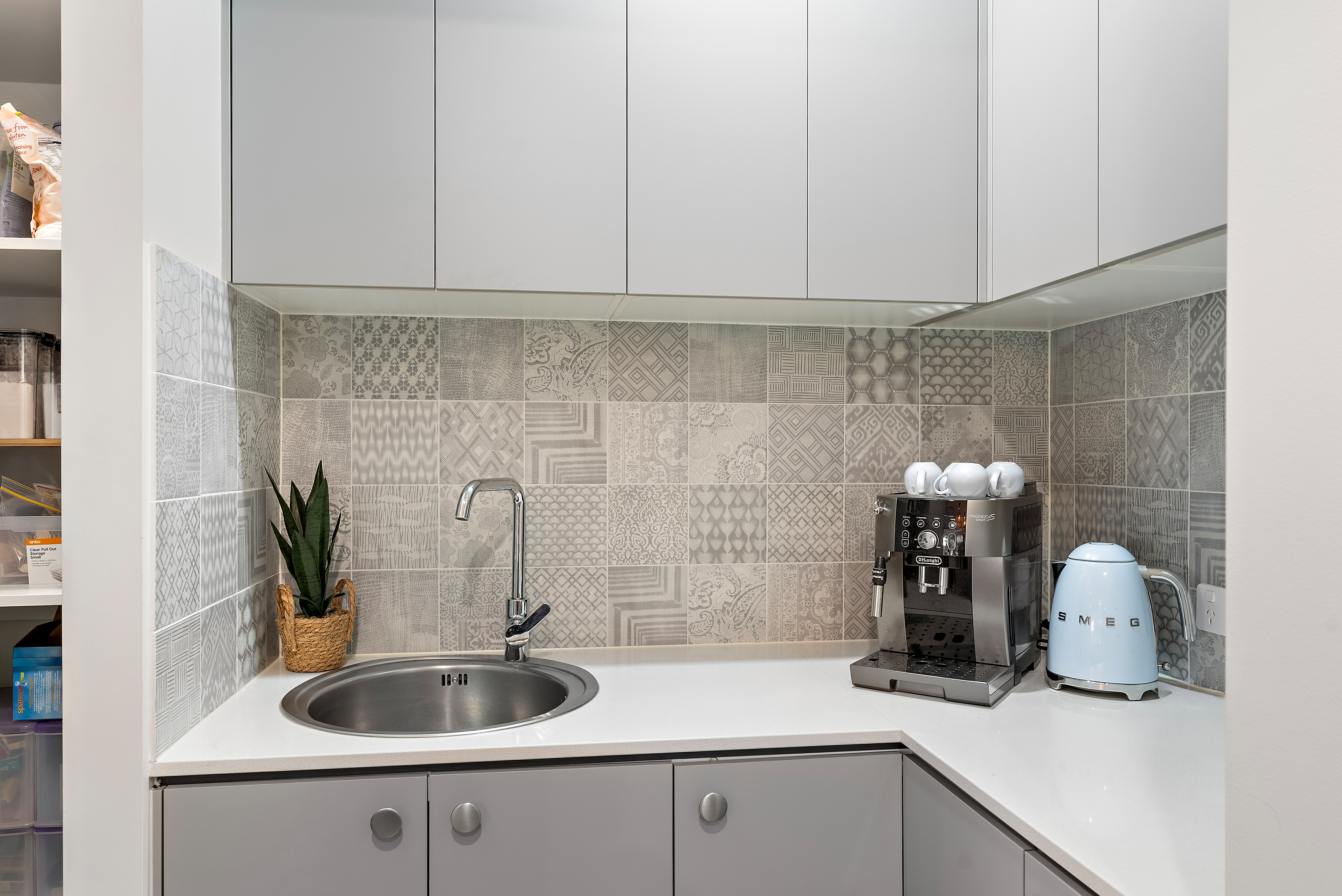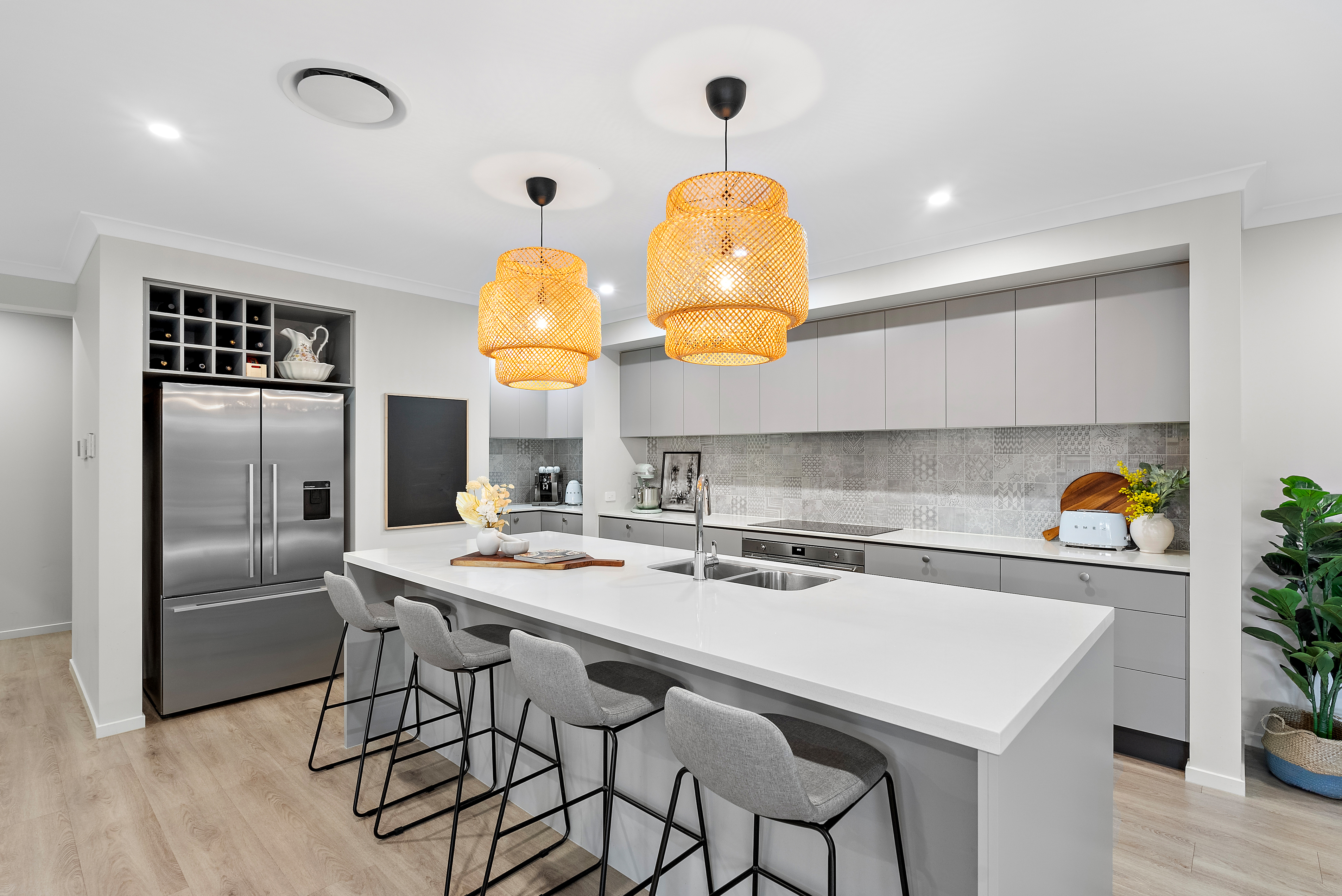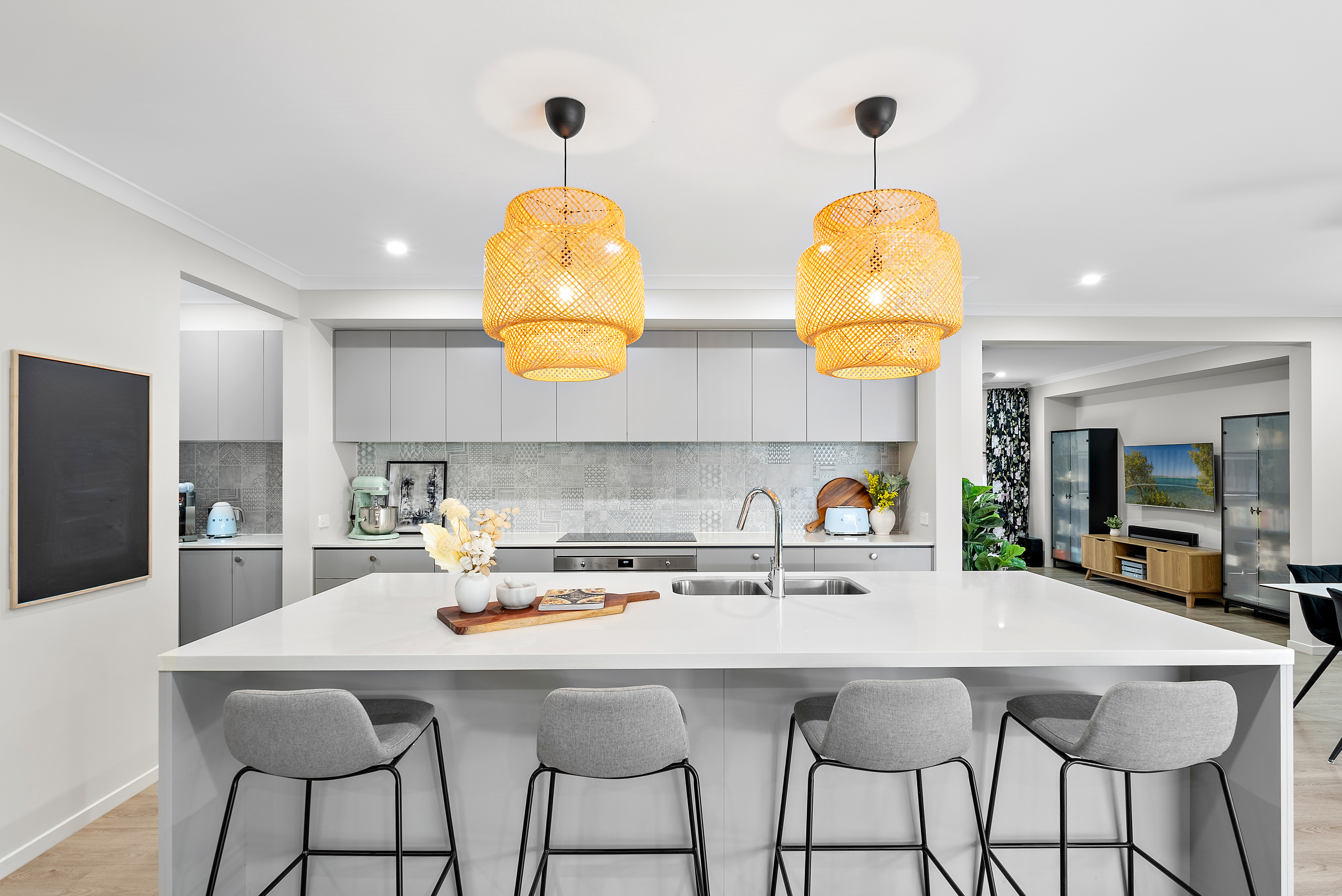 The heart of this home is the entertainer's kitchen, showcasing pendant lighting, a kitchen island with a luxurious 40 mm stone bench-top, and a stunning feature tile splashback. Equipped with quality SMEG appliances, including a 900mm oven, induction hob, and built-in microwave, this kitchen is a chef's dream. The adjoining butler's pantry adds convenience with its ample storage, sink and extended bench space.