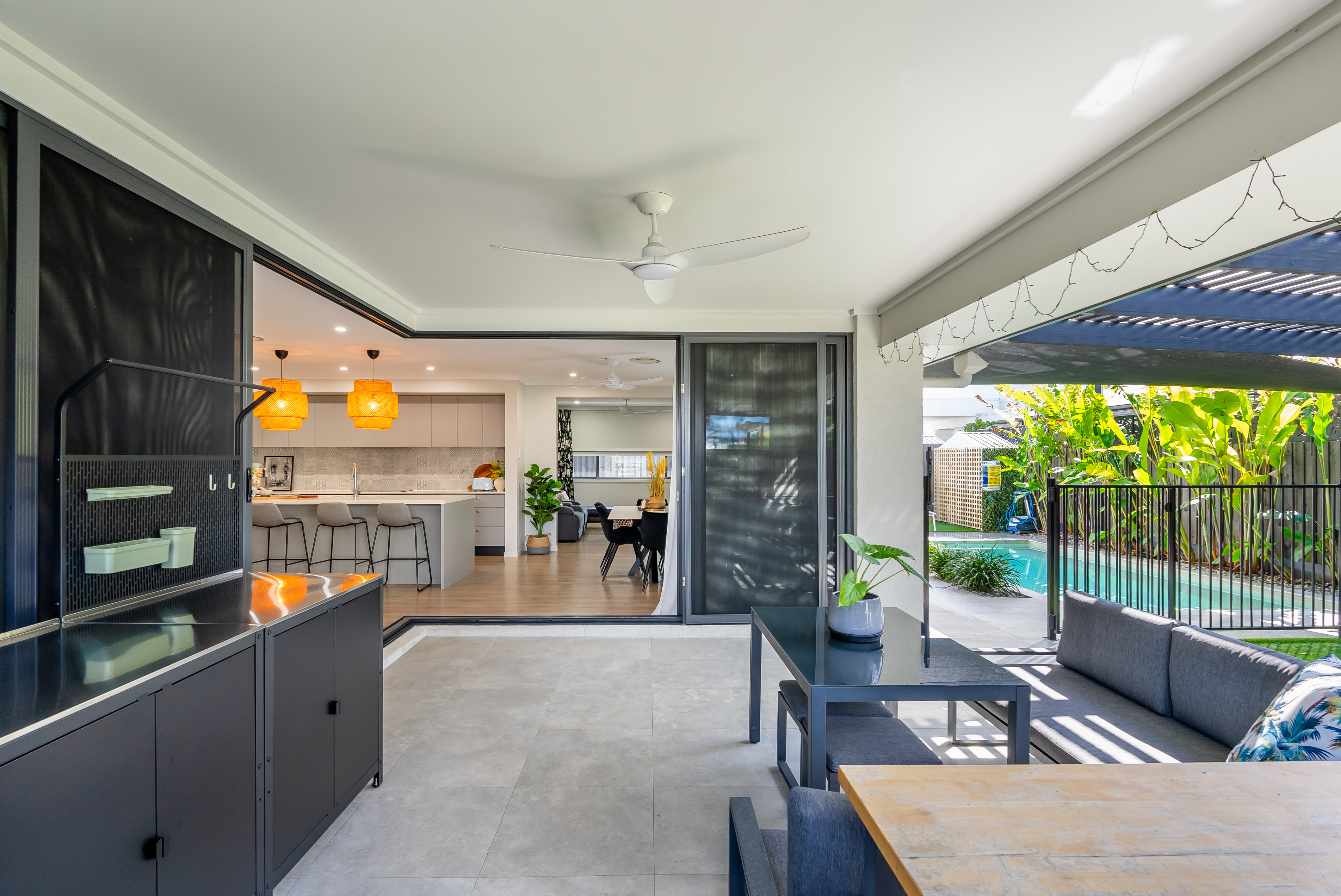 Step inside to discover a welcoming entrance featuring a grand timber door, security screen, and established plants that lead you into an expansive open-plan living and dining area. The seamless flow between indoor and outdoor spaces creates an inviting atmosphere ideal for entertaining. Enjoy alfresco dining under the covered patio while soaking in views of the stunning pool, enhanced by cool breezes flowing through strategically placed security screens.