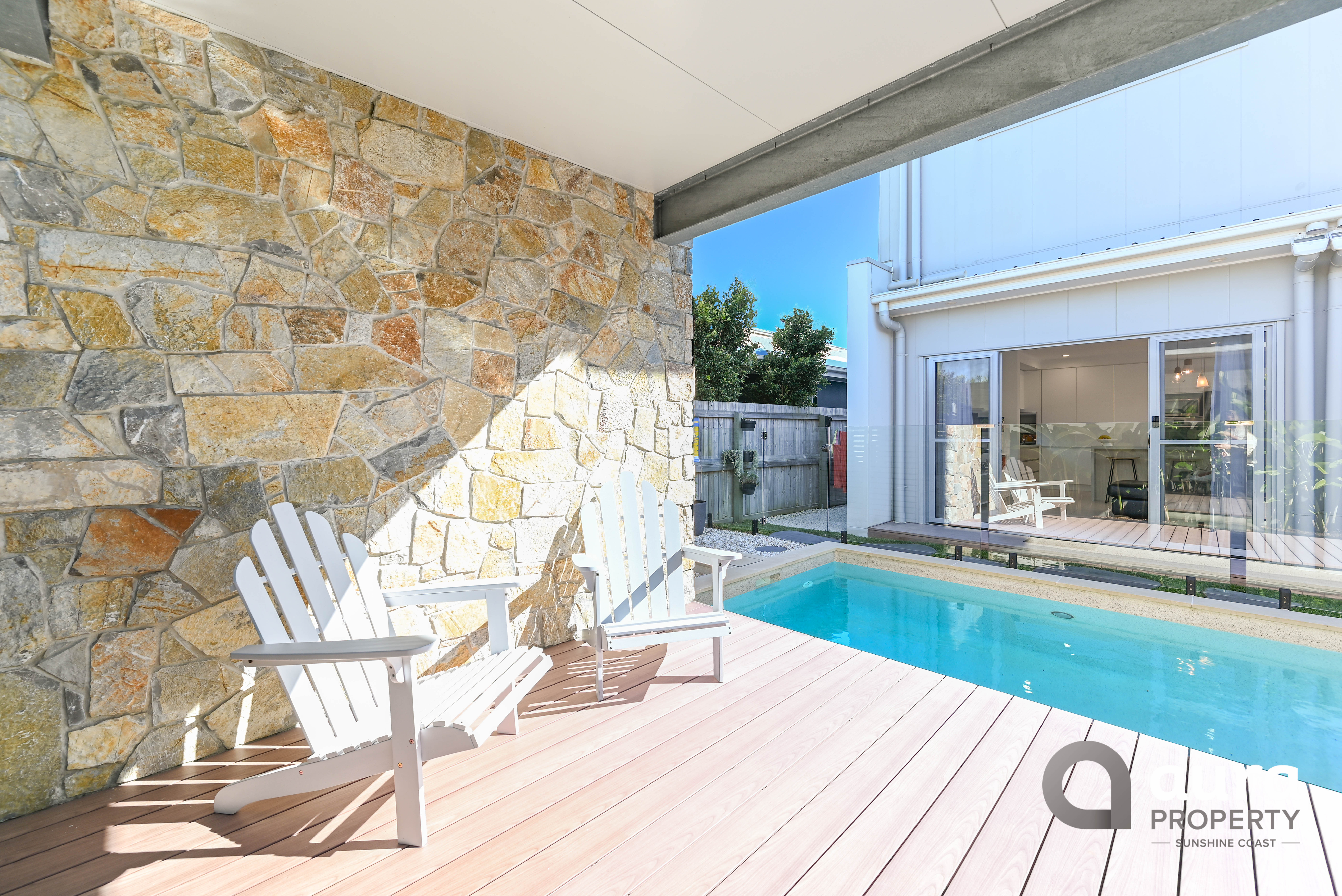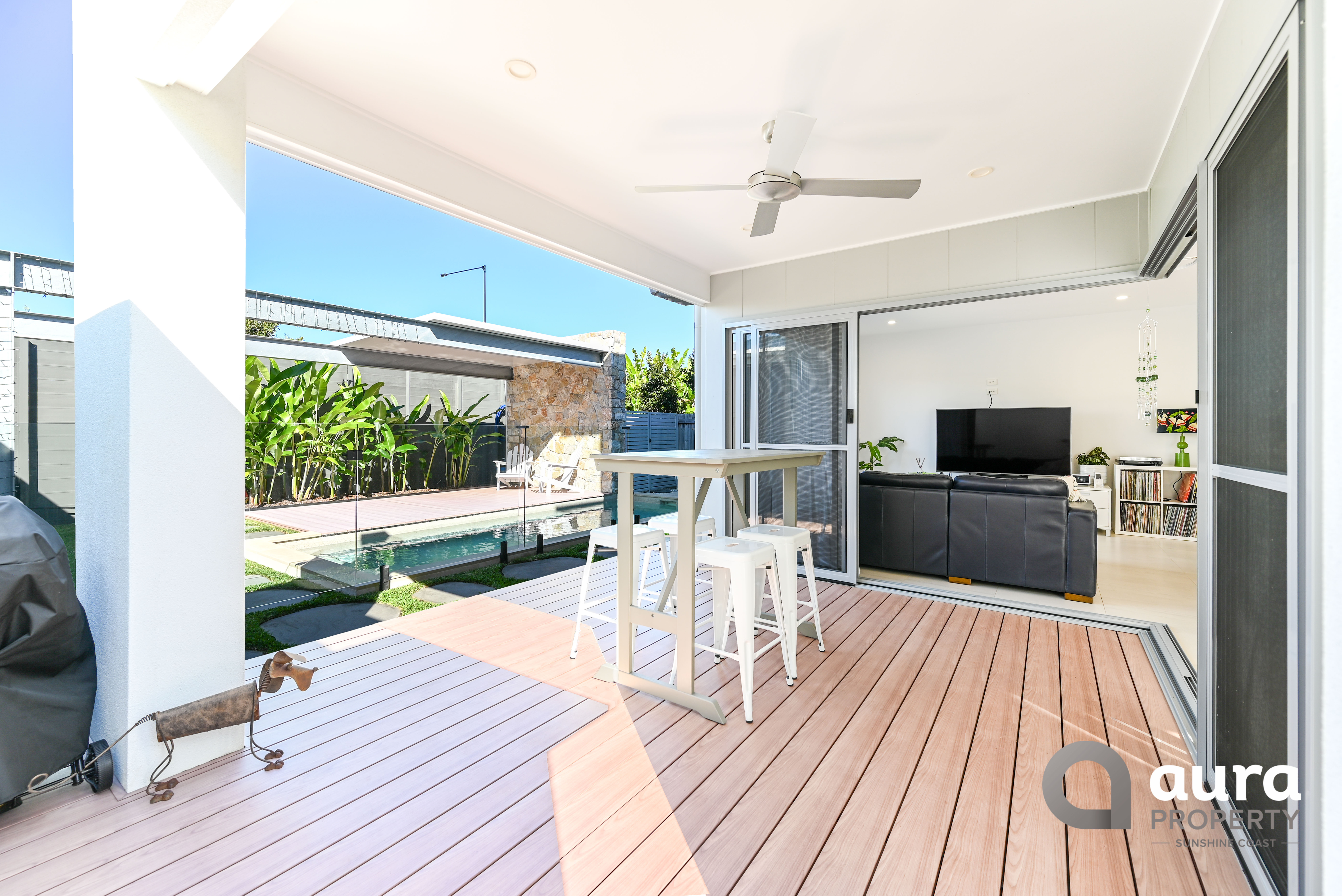 The custom pergola with timber look aluminium decking over looking the pool is a visually striking aspect of the property and a great place to relax in the sun.