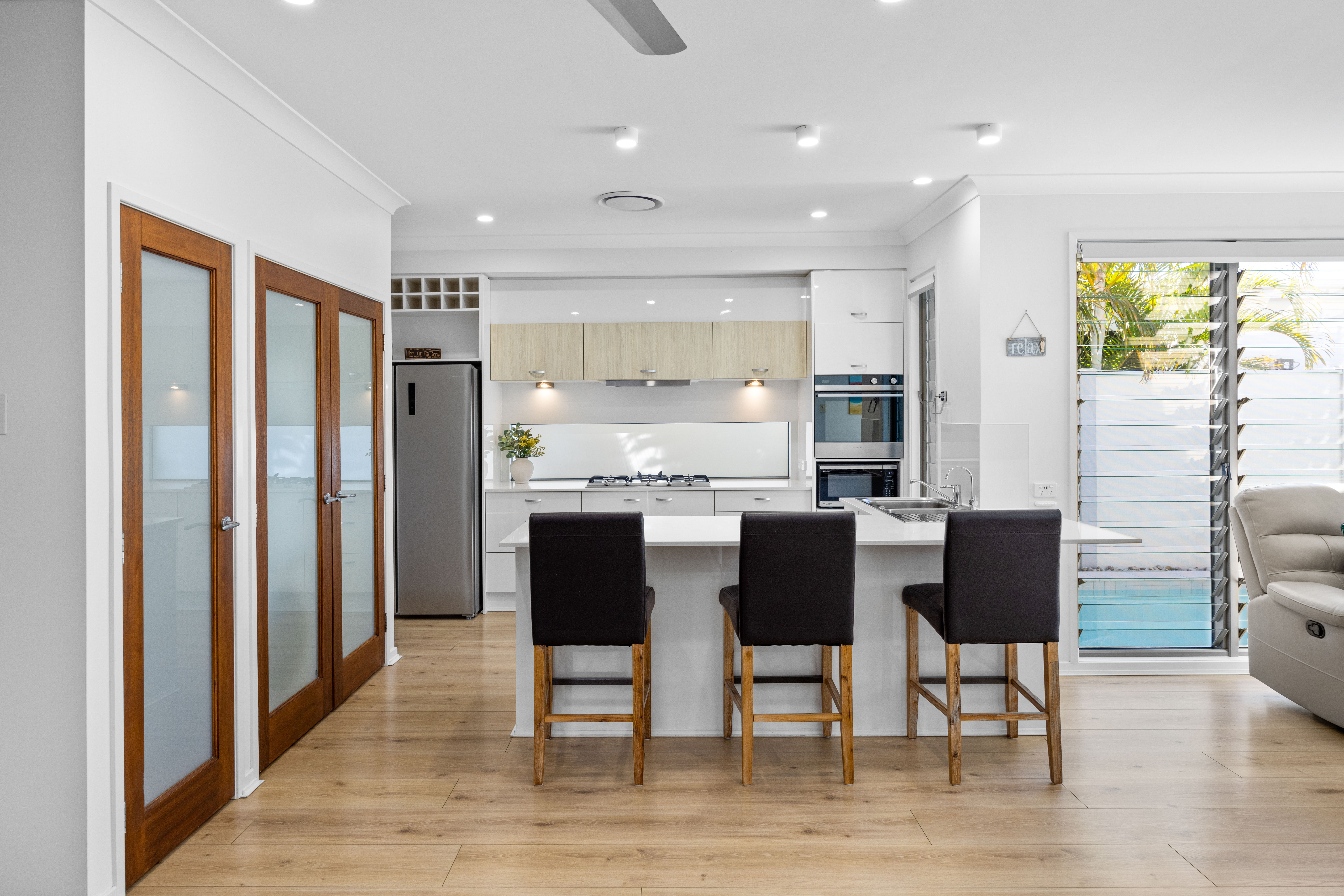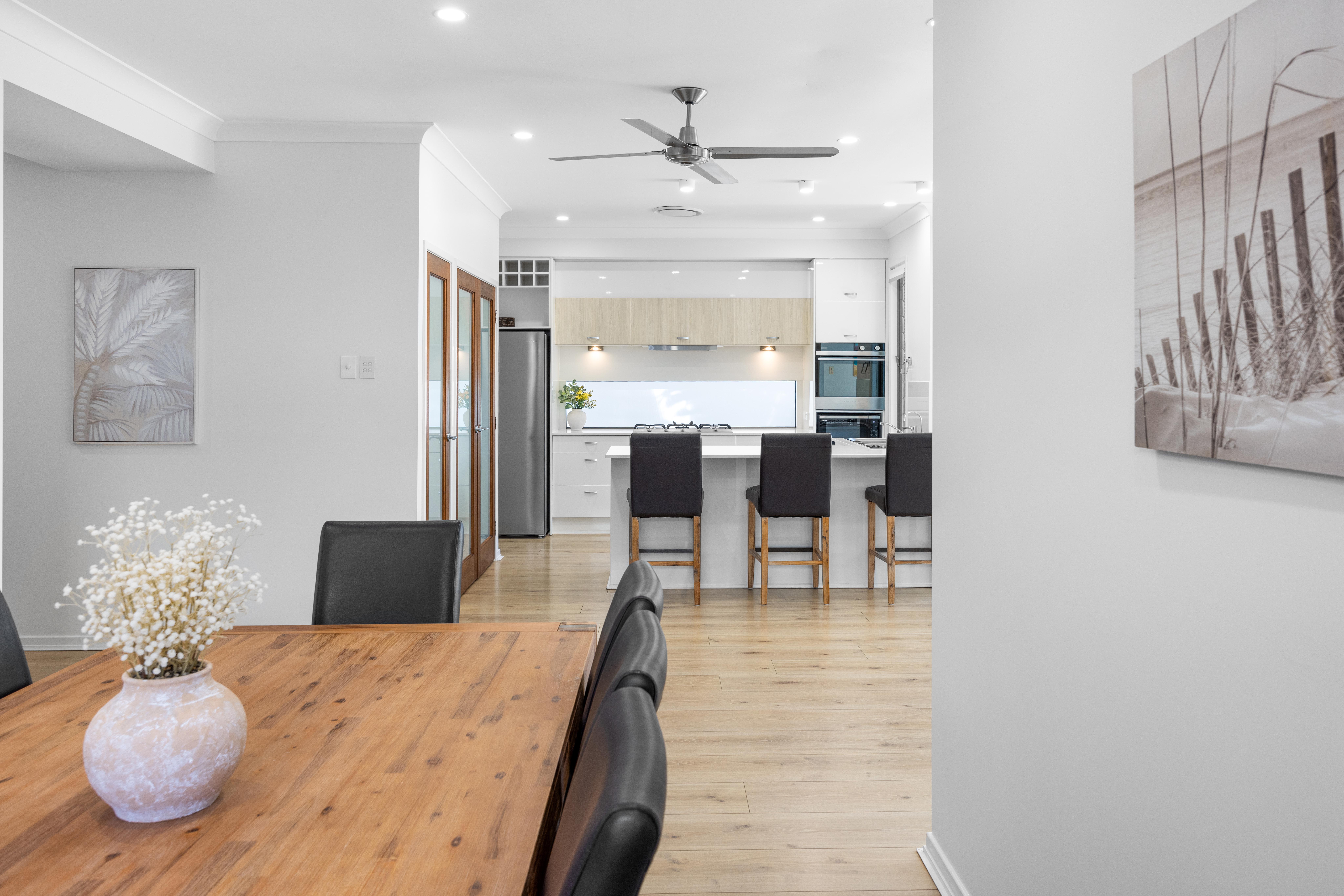As you enter the home, immediately you will be impressed by the open plan living spaces and soaring ceilings. The functional chef's kitchen with its sea of stone benchtops acts as the central hub of the home and seamlessly caters to the indoor and outdoor living and dining areas which overlook the sparkling inground pool. The inside and alfresco dining become one through when the extensive bi-fold doors are opened.