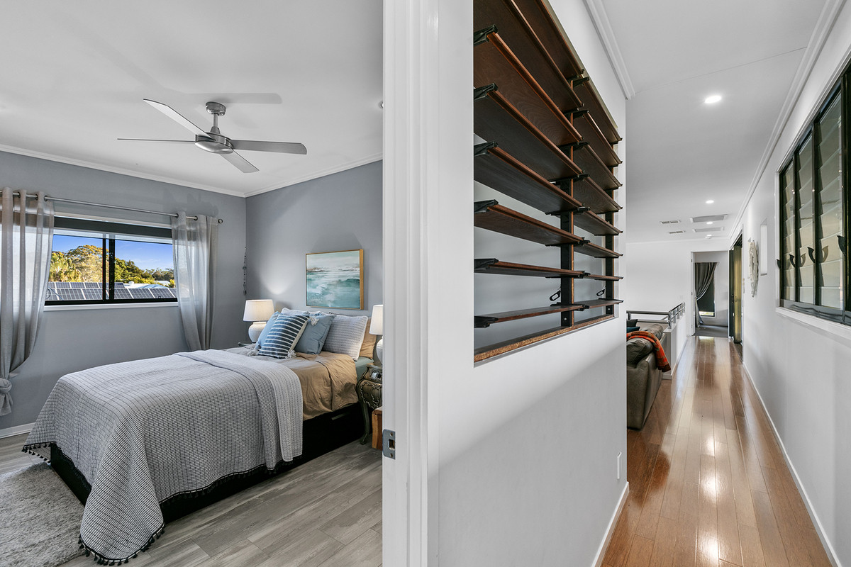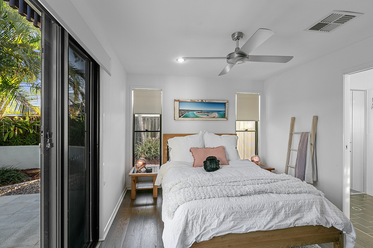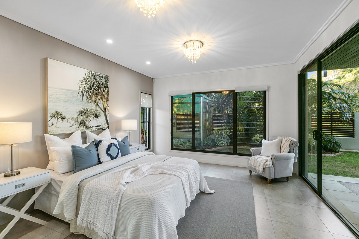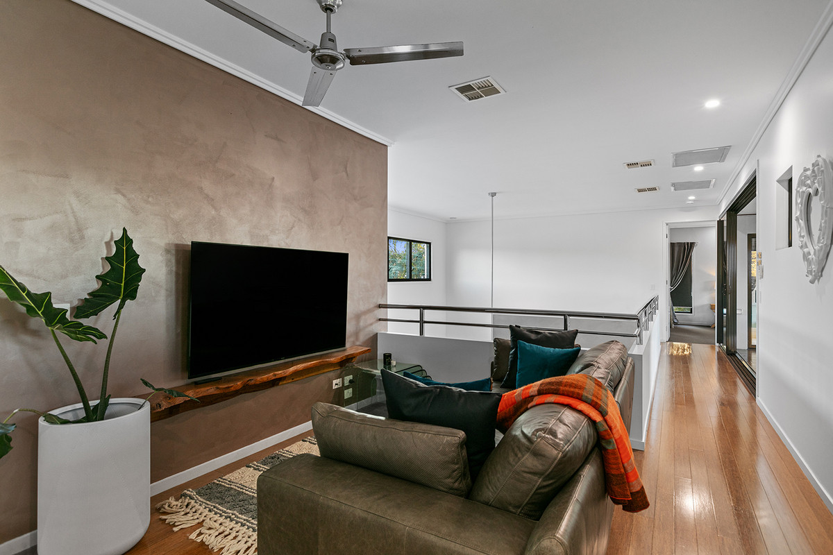 The heart of the upstairs offering is the master bedroom suite, a sanctuary of comfort that gazes out across the green and central tropical gardens. It boasts a vast wardrobe, an exquisite ensuite, and a secluded balcony with direct access to the inviting pool, spa, and garden below. Two additional generous bedrooms and main bathroom, complete with shared entertainment area, echo the commitment to space and functionality.