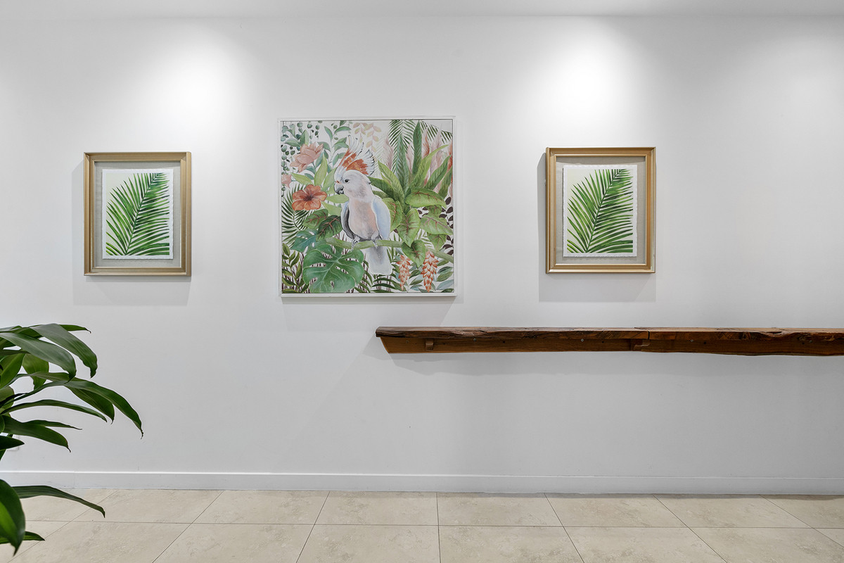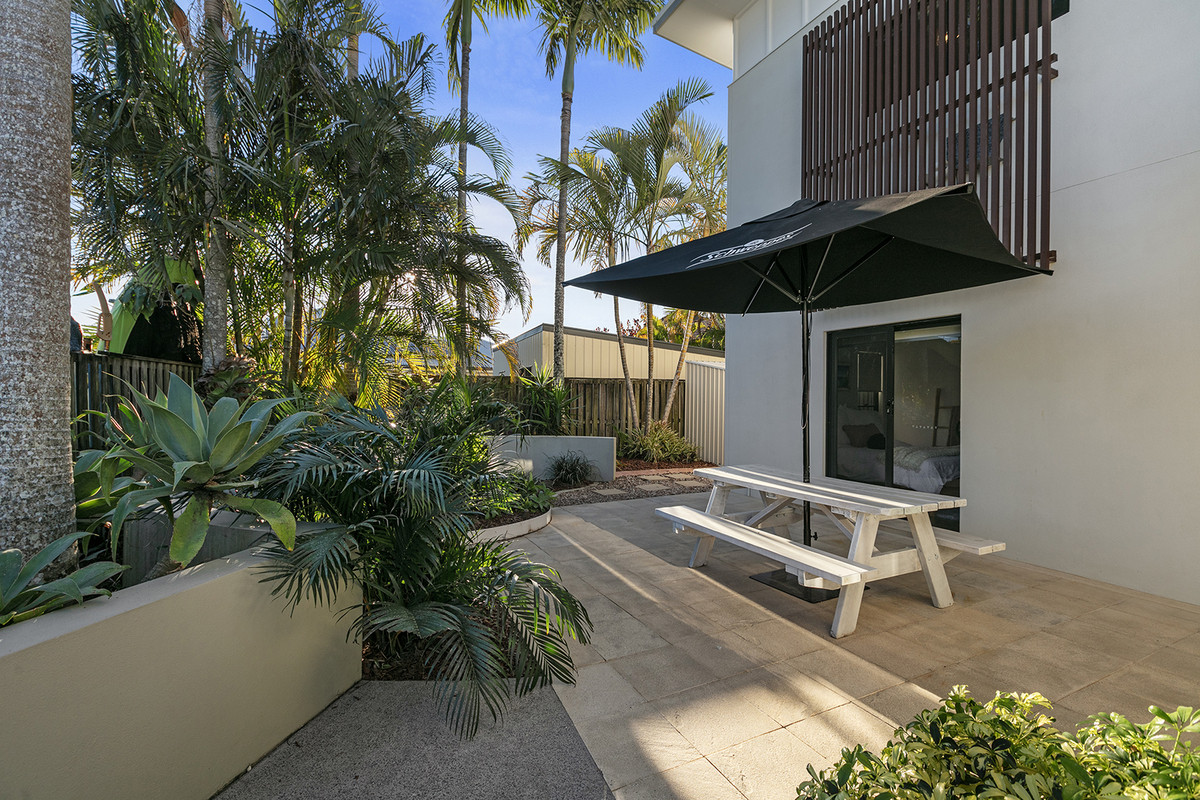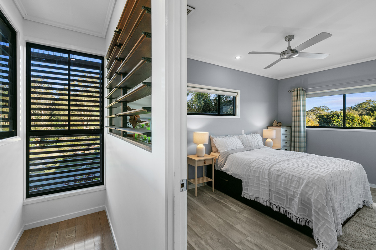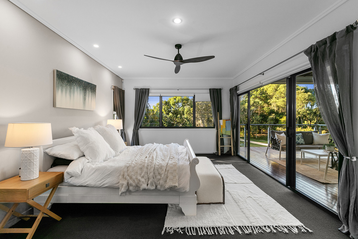 The heart of the upstairs offering is the master bedroom suite, a sanctuary of comfort that gazes out across the green and central tropical gardens. It boasts a vast wardrobe, an exquisite ensuite, and a secluded balcony with direct access to the inviting pool, spa, and garden below. Two additional generous bedrooms and main bathroom, complete with shared entertainment area, echo the commitment to space and functionality.