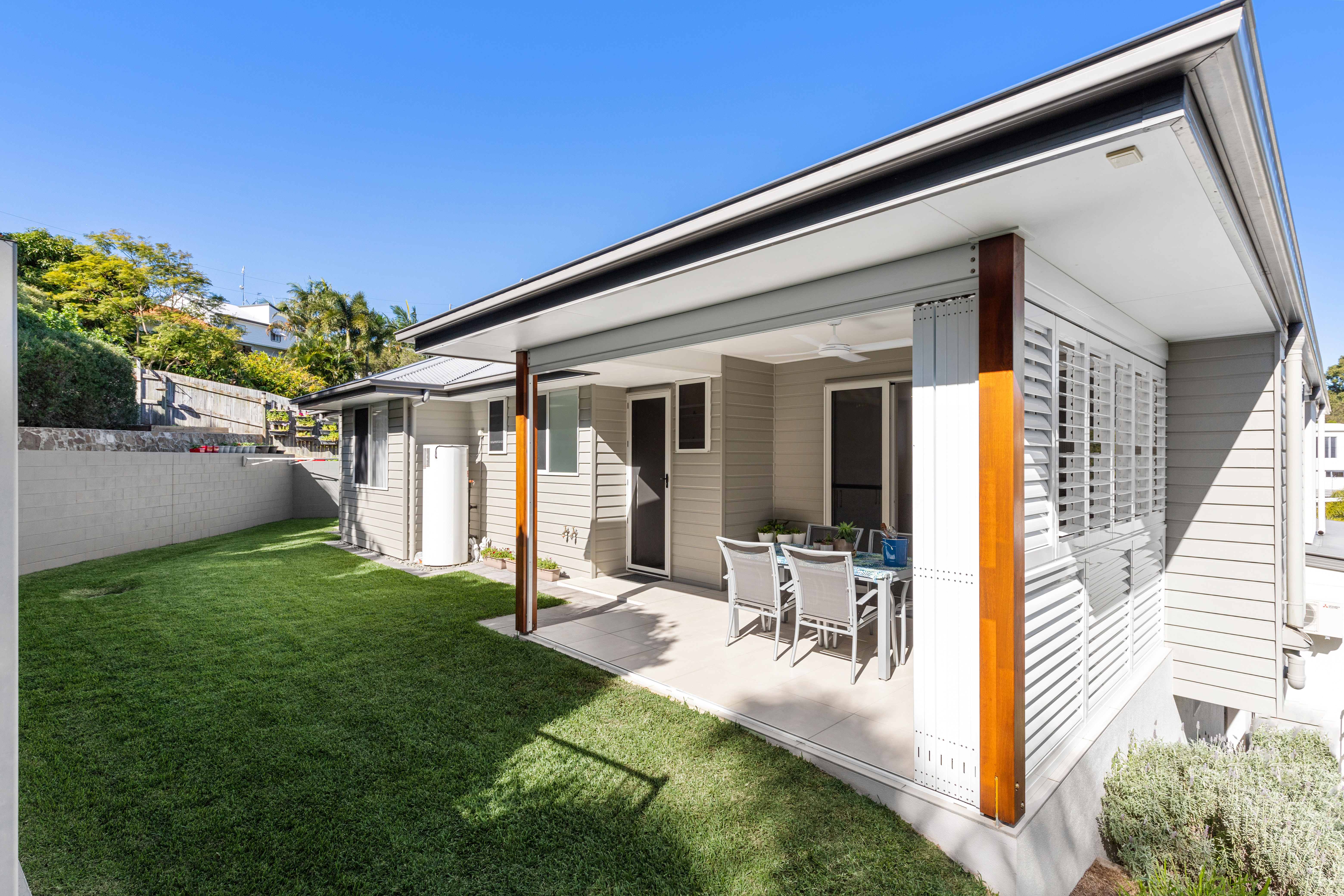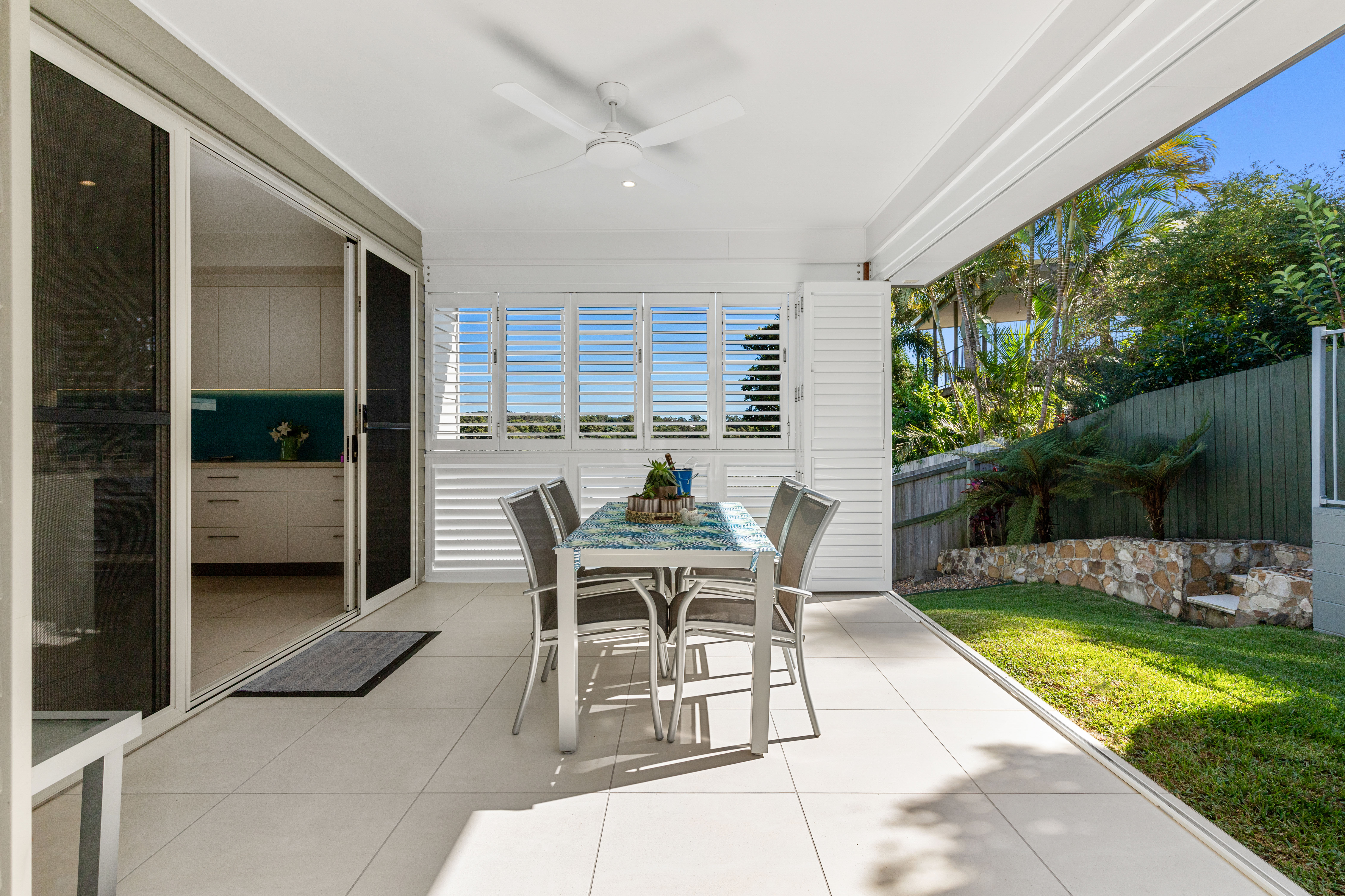 This extends to a rear covered outdoor entertaining area sheltered by aluminium plantation shutters.