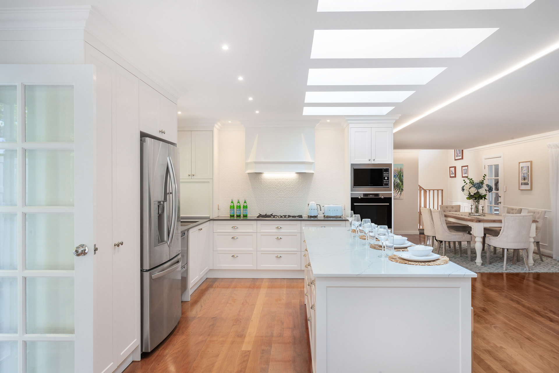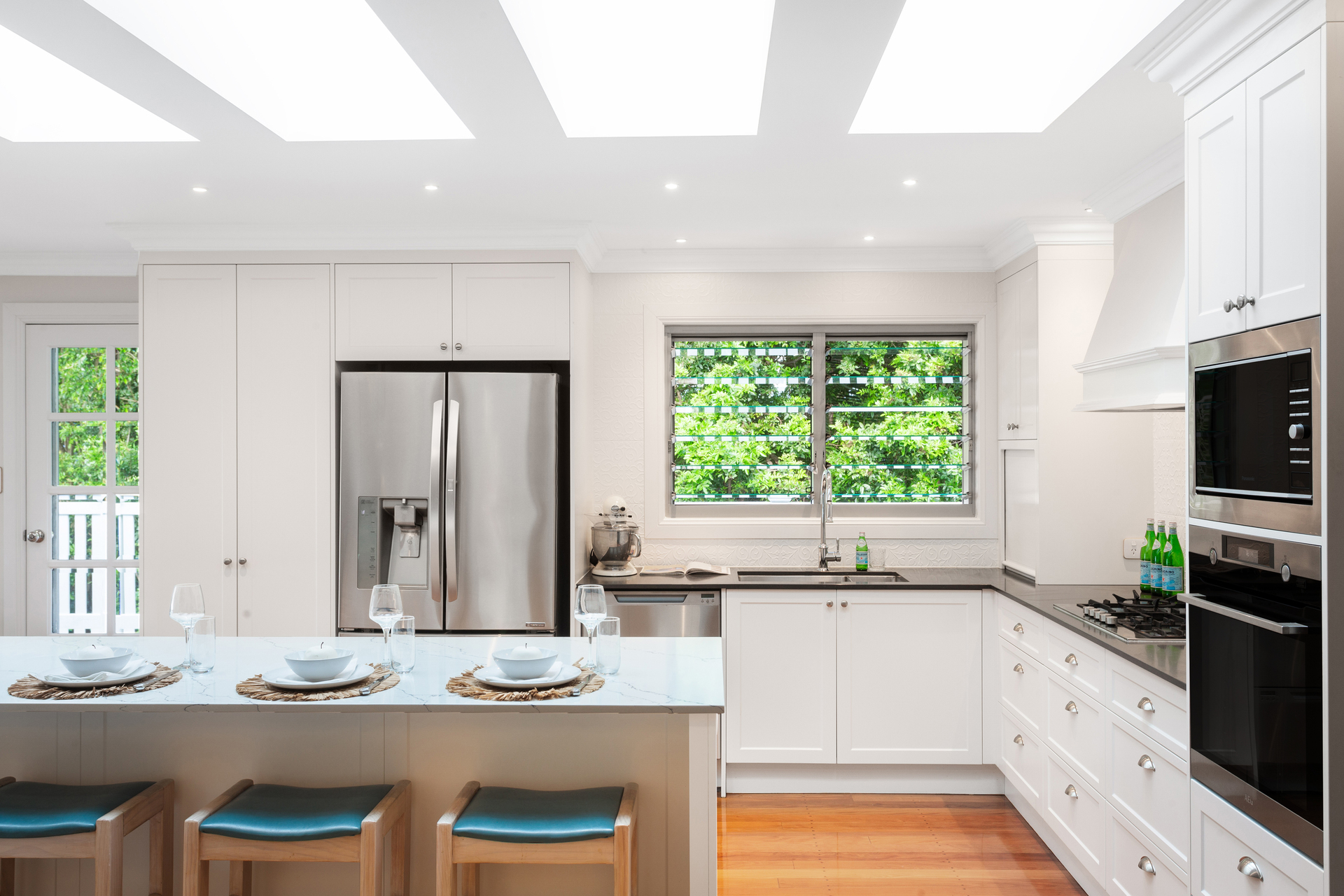 The kitchen is a chef's delight, with premium appliances, AEG pyrolytic oven, an in-built convection microwave, a Fisher and Paykel Double Drawer Dishwasher, gas cooktop and plumbed fridge space.