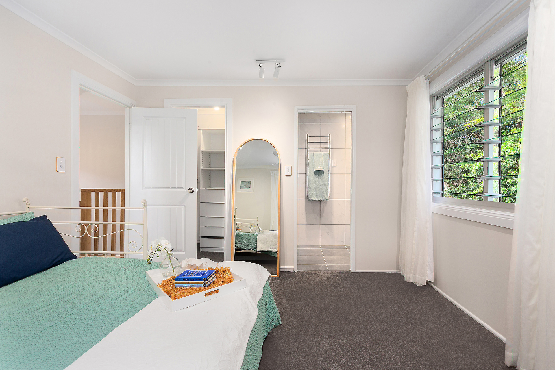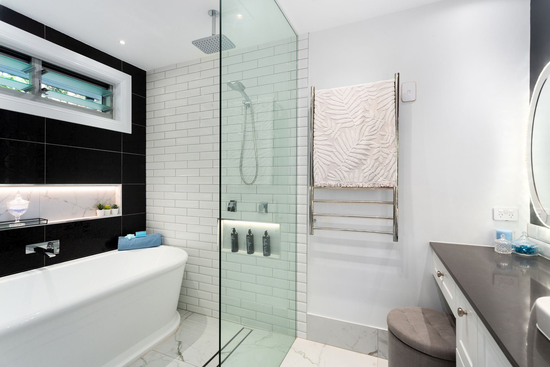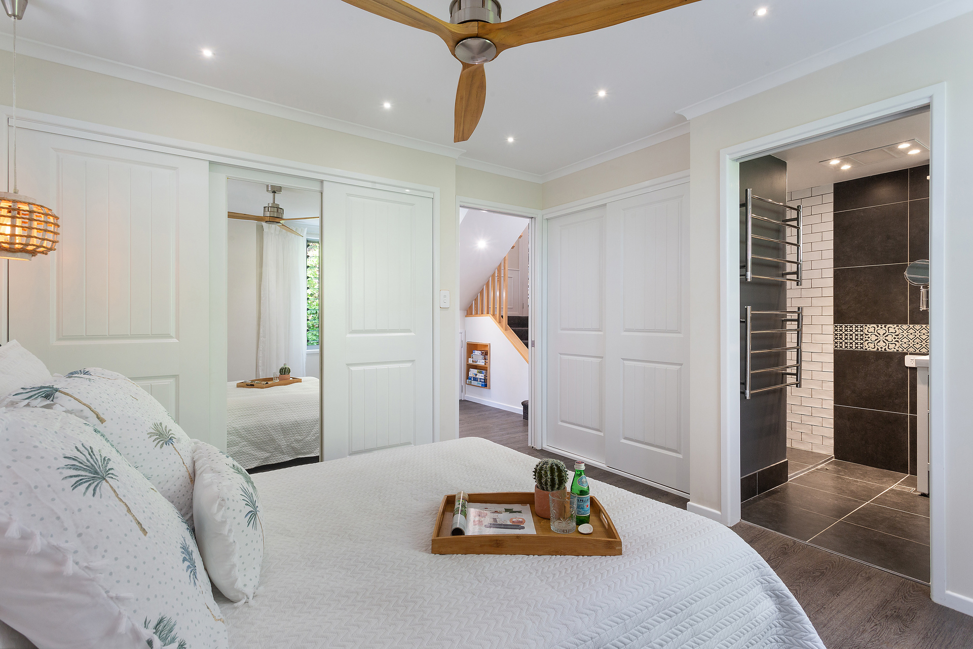 Inside, the house boasts high-end finishes, including heated towel rails, double shower heads and heat lamps in all bathrooms. The downstairs bathrooms even offer floor heating for added comfort and the main bathroom features a Velux rain-sensing skylight. Cross-ventilation through louvred windows keeps the home cool year-round.