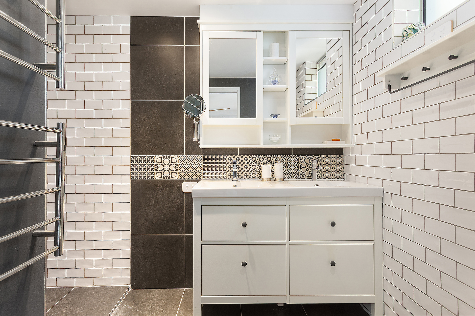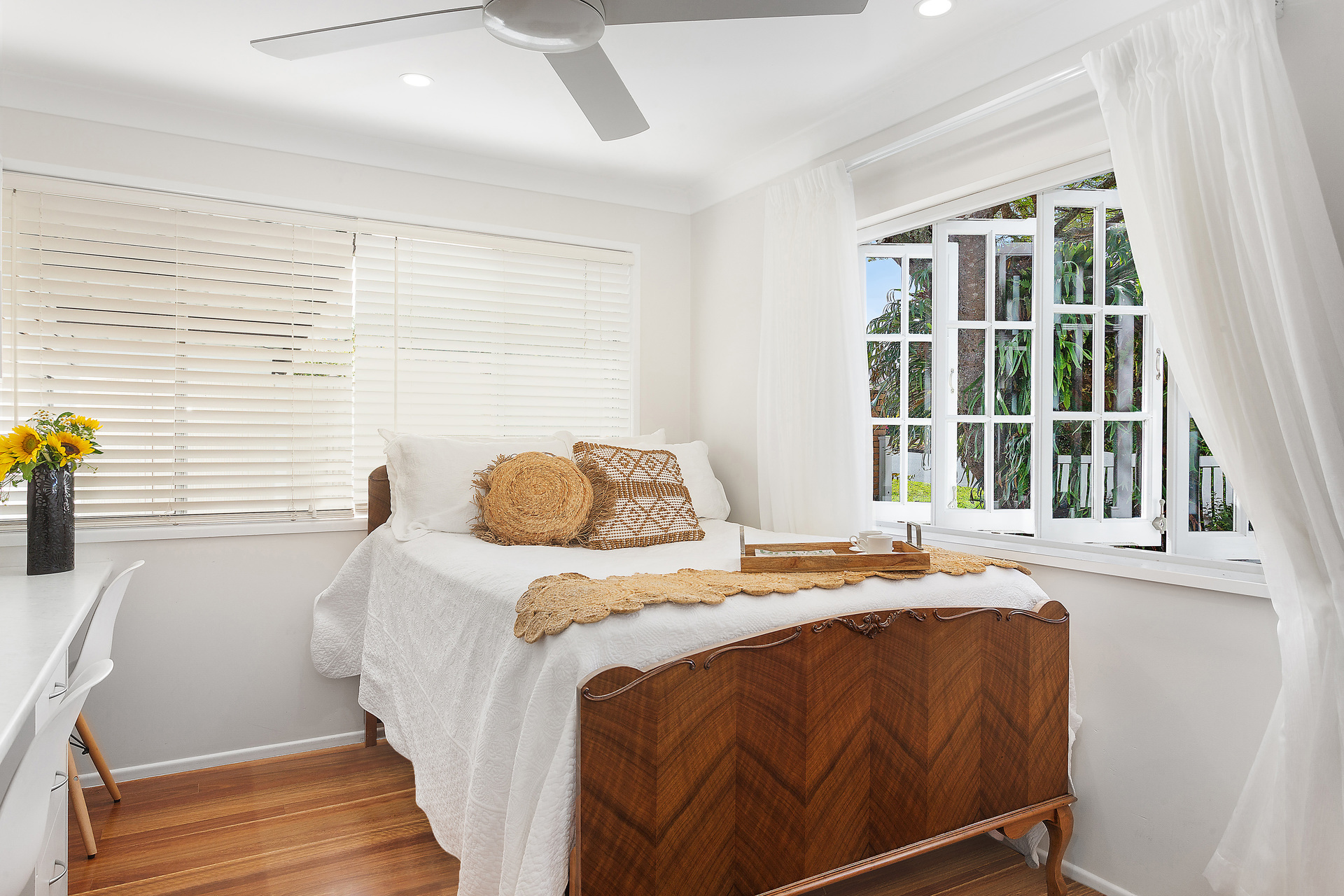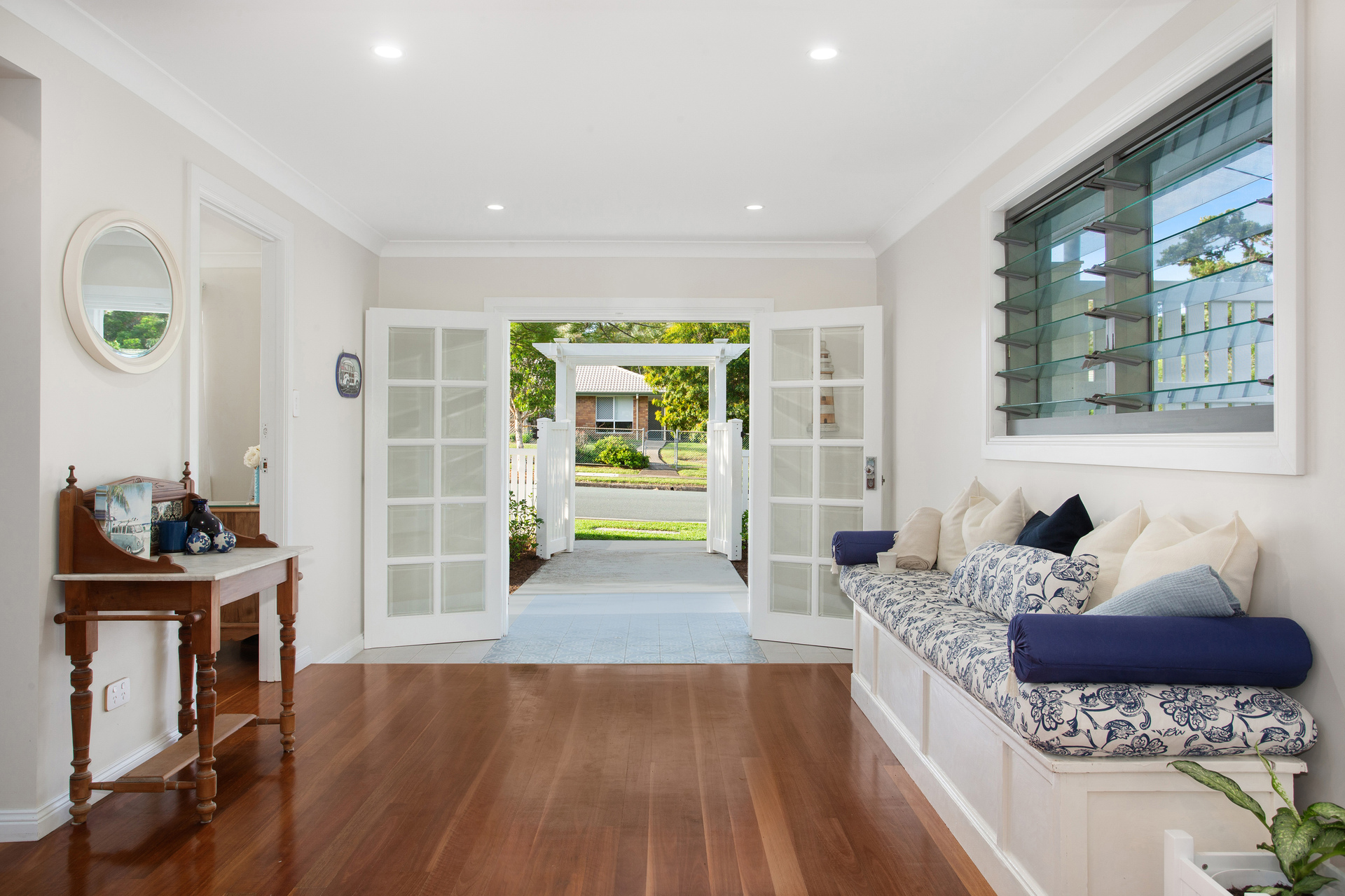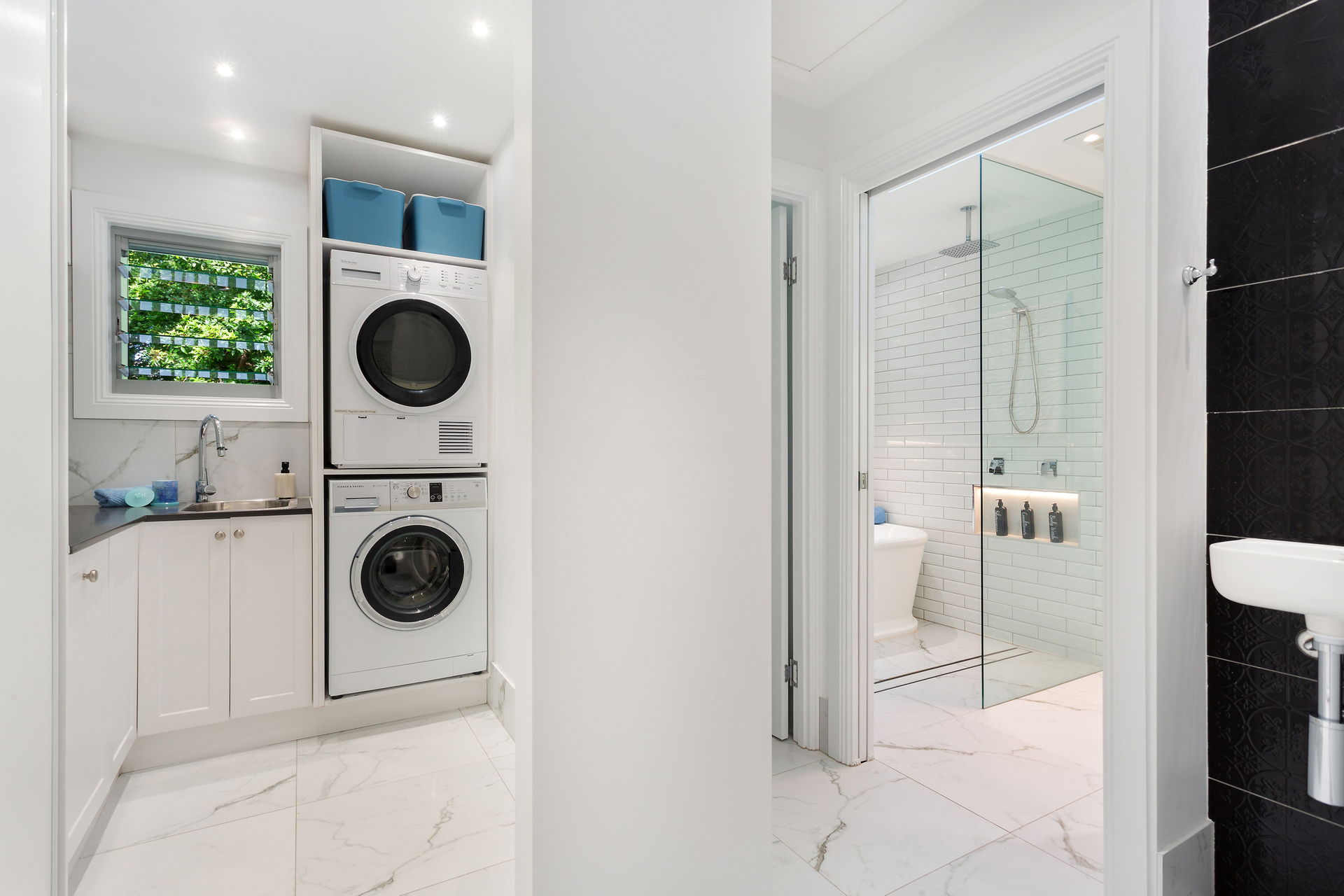 Inside, the house boasts high-end finishes, including heated towel rails, double shower heads and heat lamps in all bathrooms. The downstairs bathrooms even offer floor heating for added comfort and the main bathroom features a Velux rain-sensing skylight. Cross-ventilation through louvred windows keeps the home cool year-round.