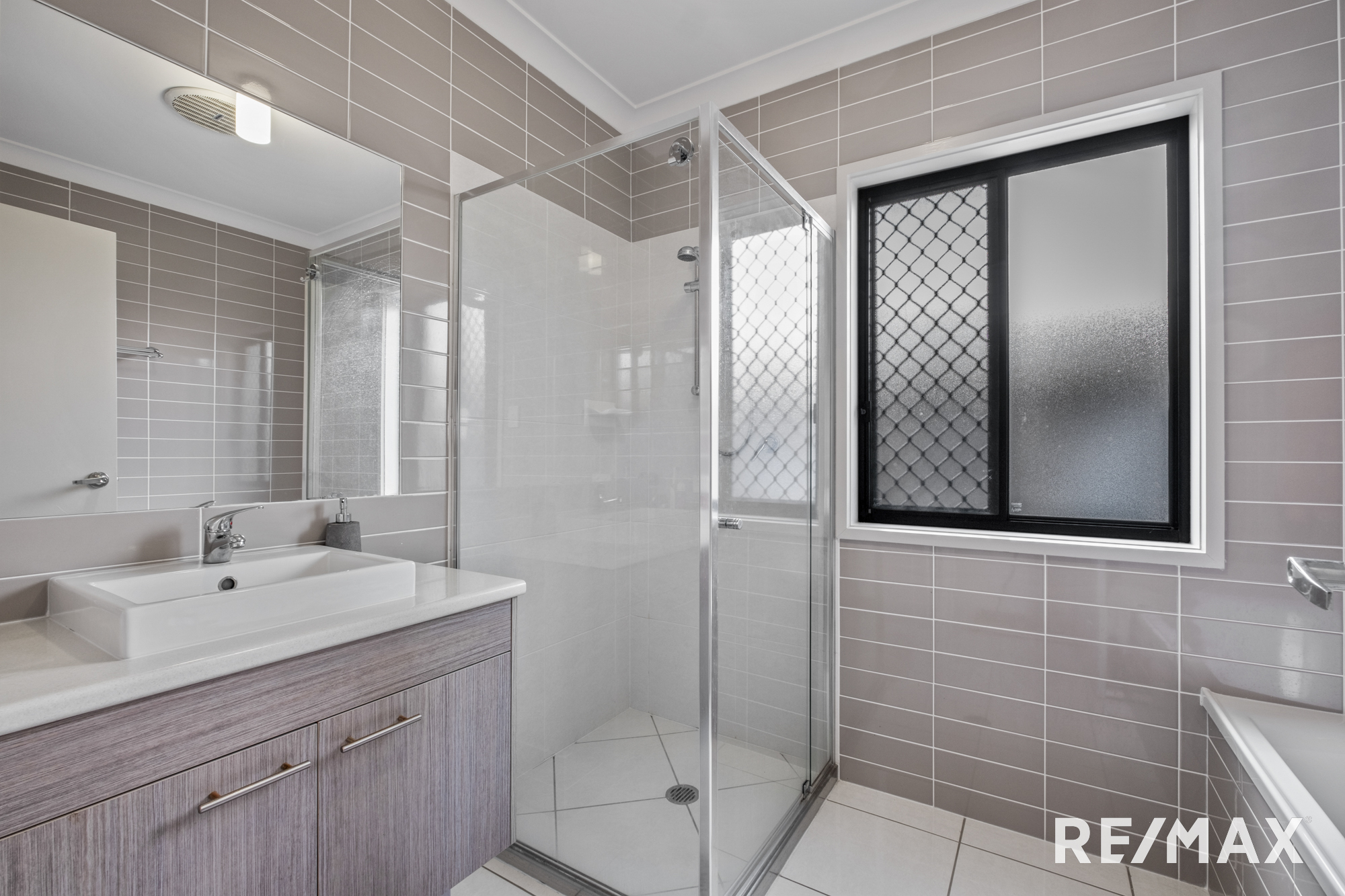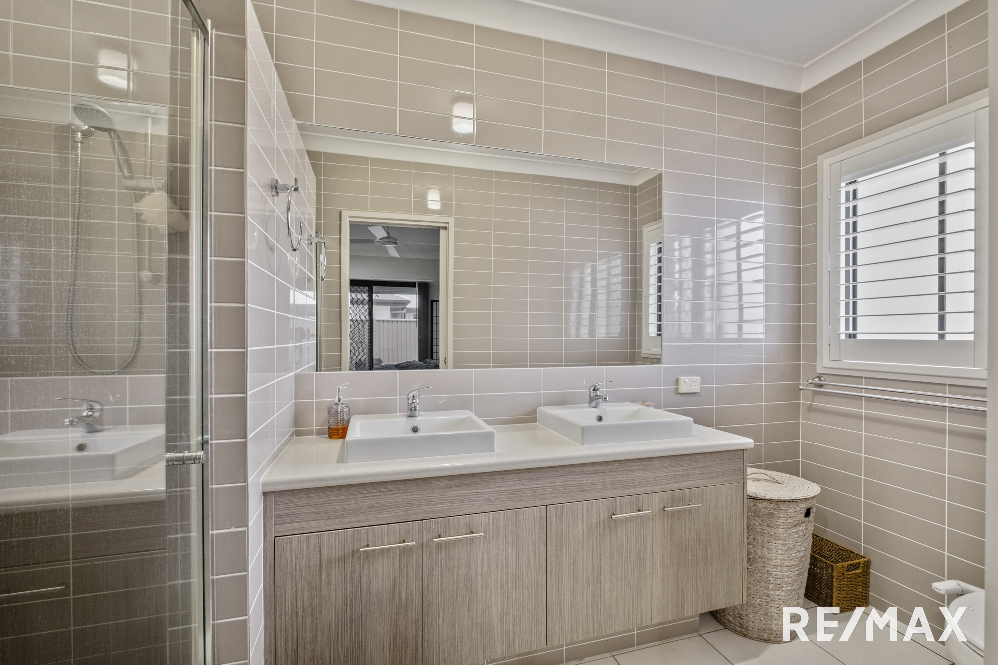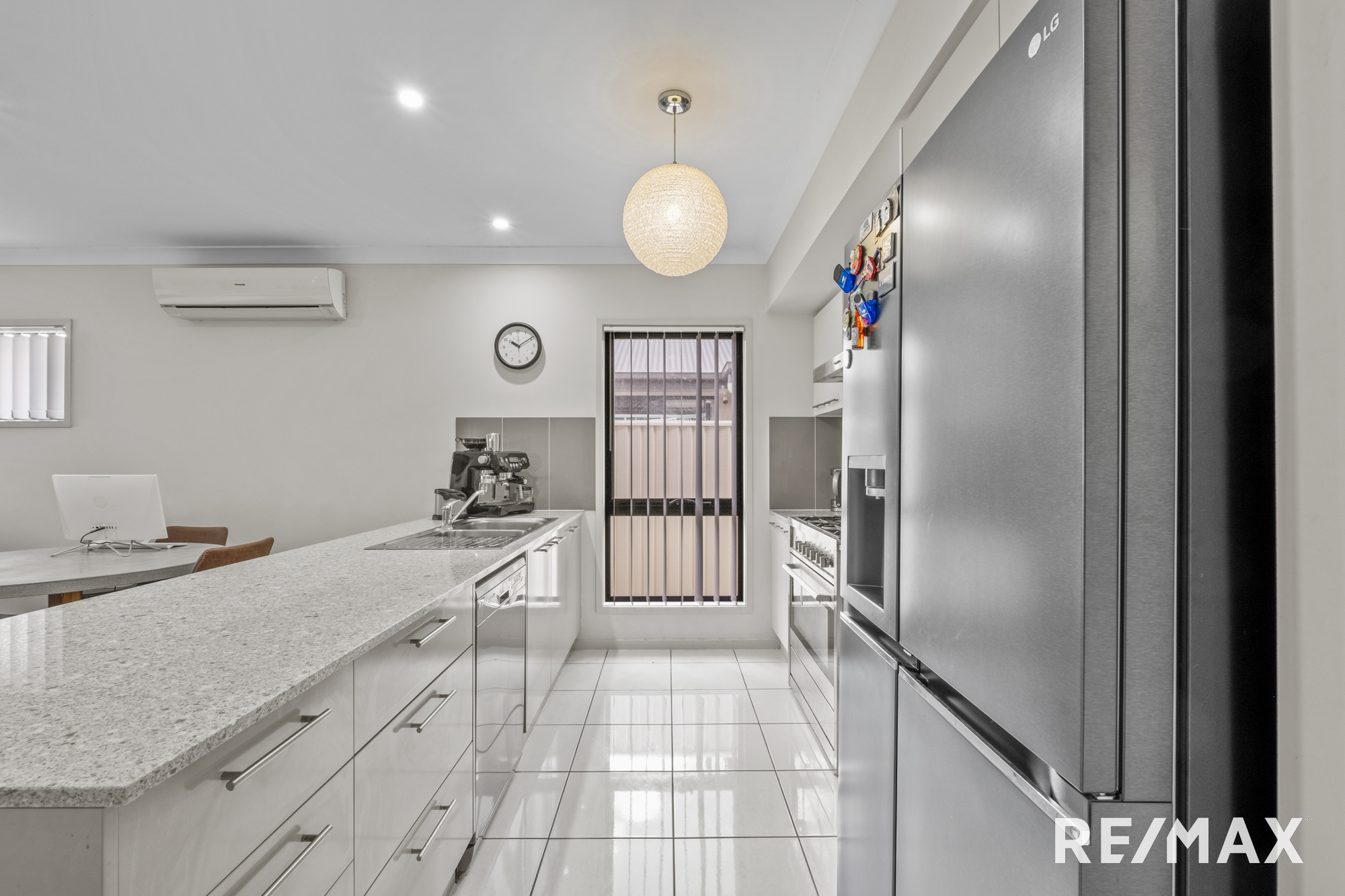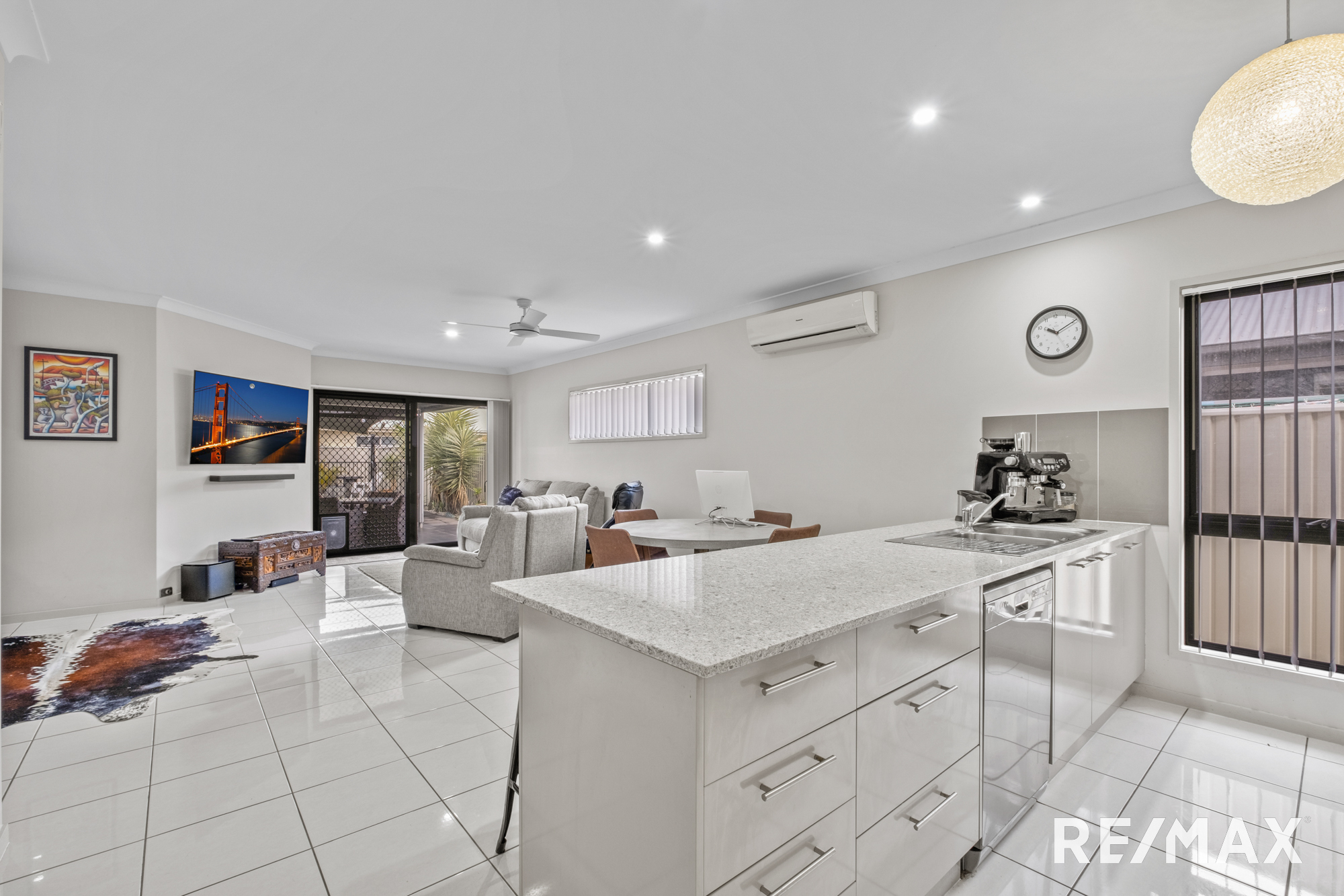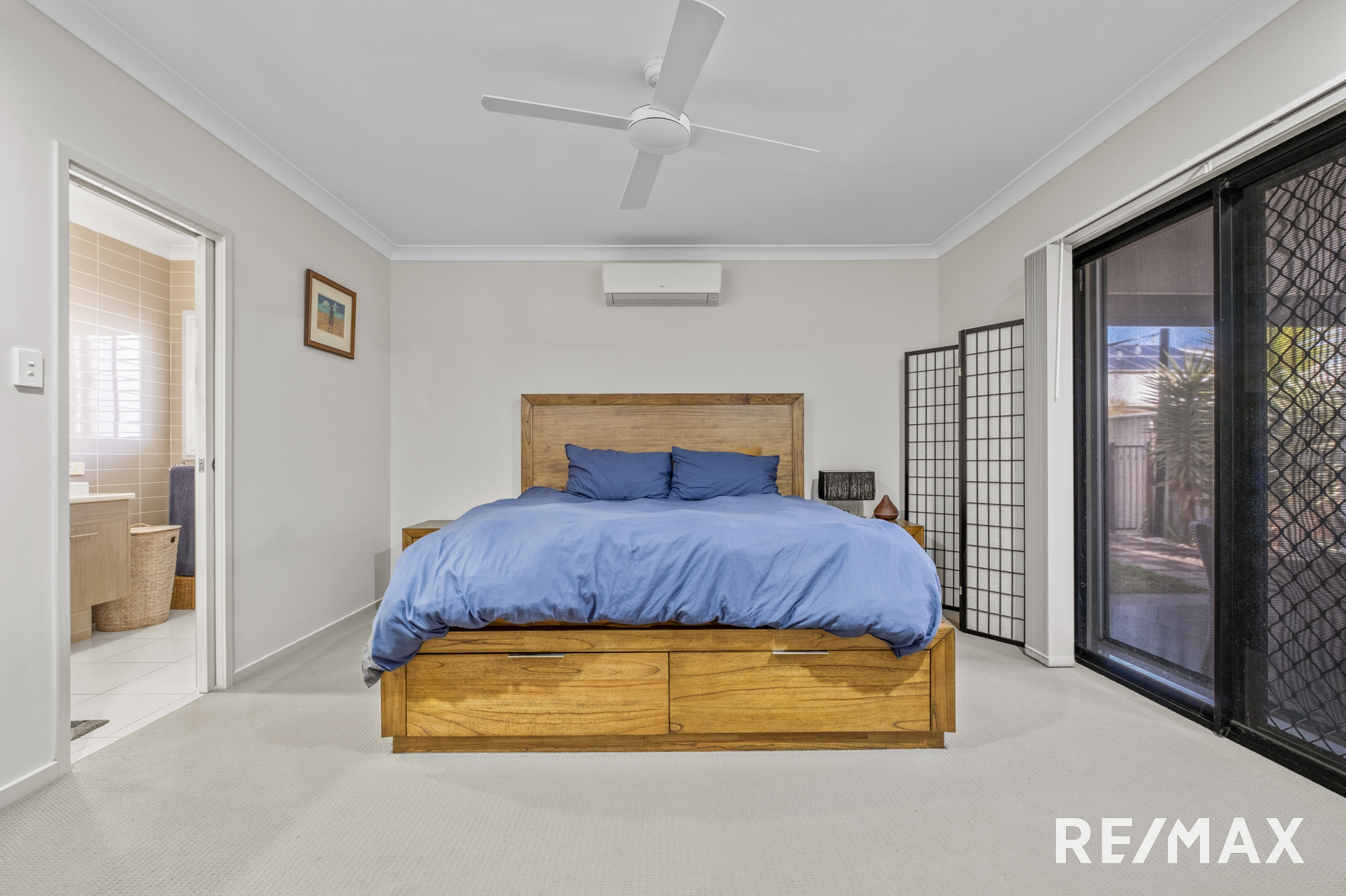 Inside, the home boasts four bedrooms, all with ceiling fans and built-in robes. The master suite is a true retreat, complete with a walk-in robe, a modern ensuite with twin vanities, aircon, and outdoor access.