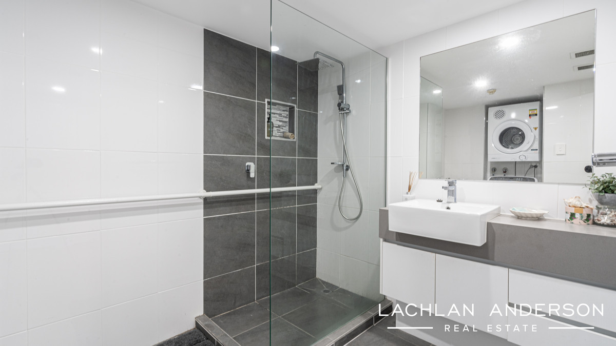 The main bedroom features generous built-in robes, private ensuite and balcony access. The second bedroom features built-ins and serviced by a sleek floor to ceiling tiled bathroom and laundry. The study can be easily converted into a third bedroom with space for built-ins and a queen bed.