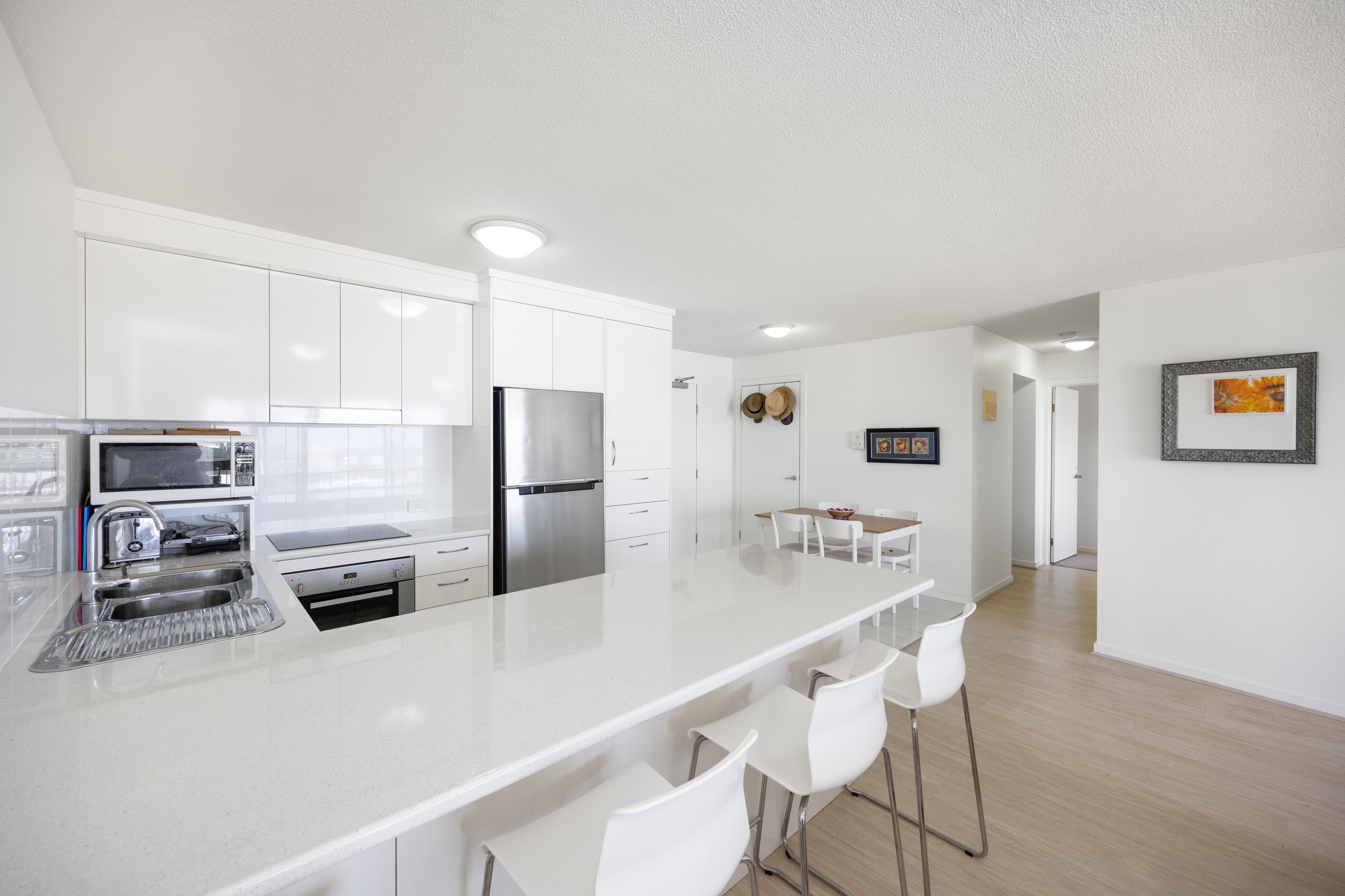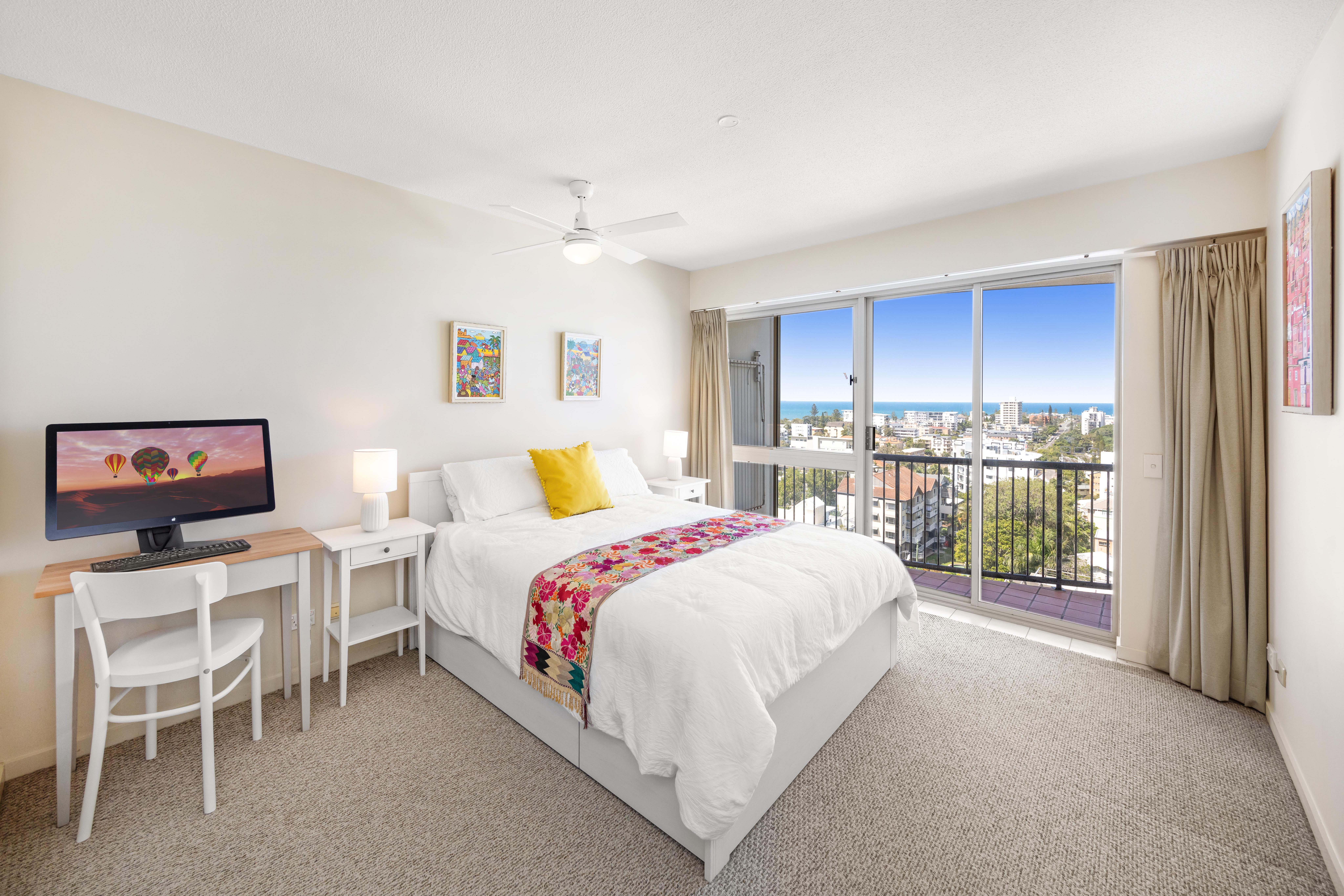Each bedroom, including the master with its ensuite and walk-through robe, grants access to the expansive balcony. It's the ideal spot to indulge in the captivating spectacle of migrating whales and passing ships, all against the backdrop of Moreton Island's sandy shores. The balcony, which spans the length of the apartment, also offers a perfect setting for entertaining guests or relaxing with a glass of bubbly as you bask in the gentle sea breezes.