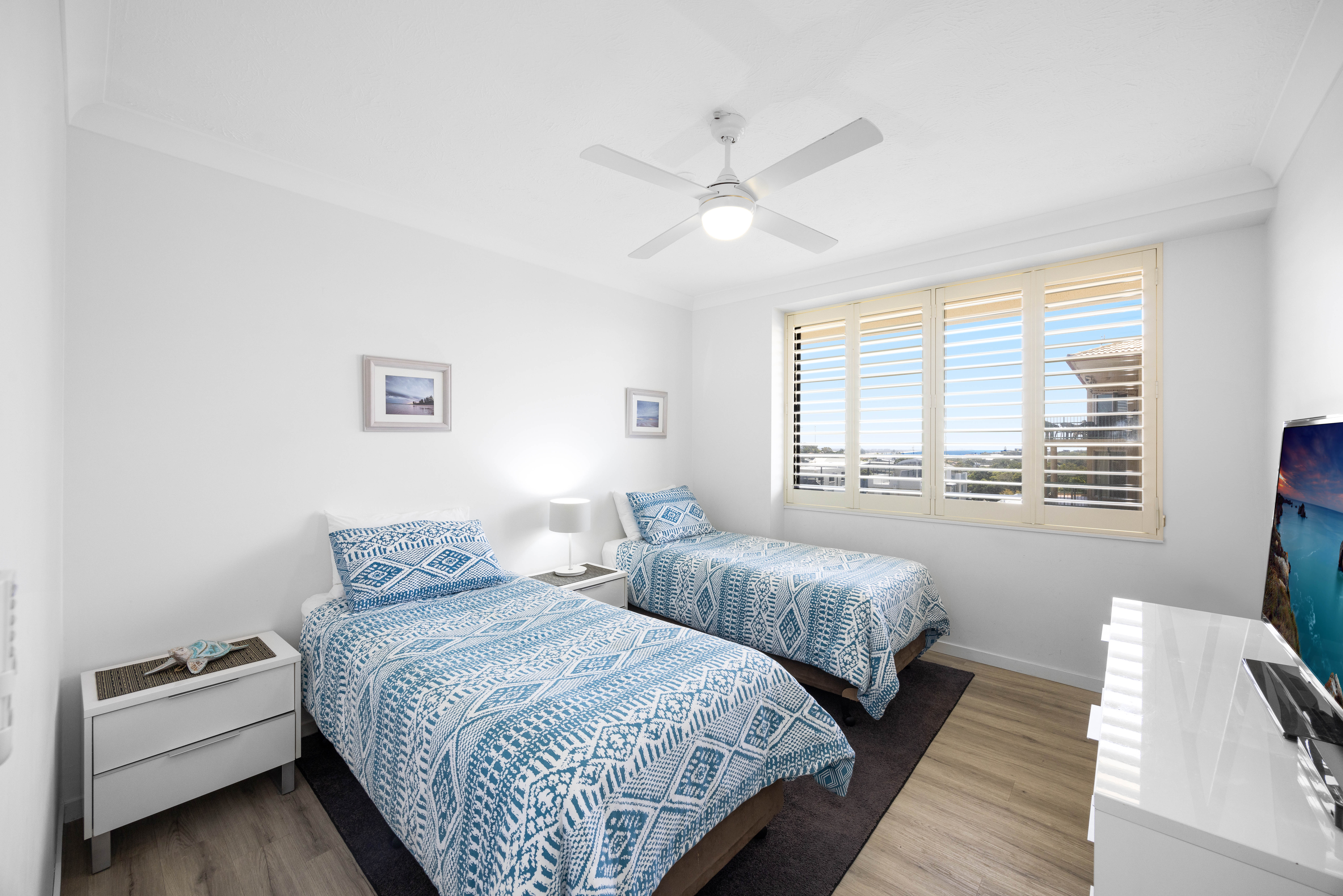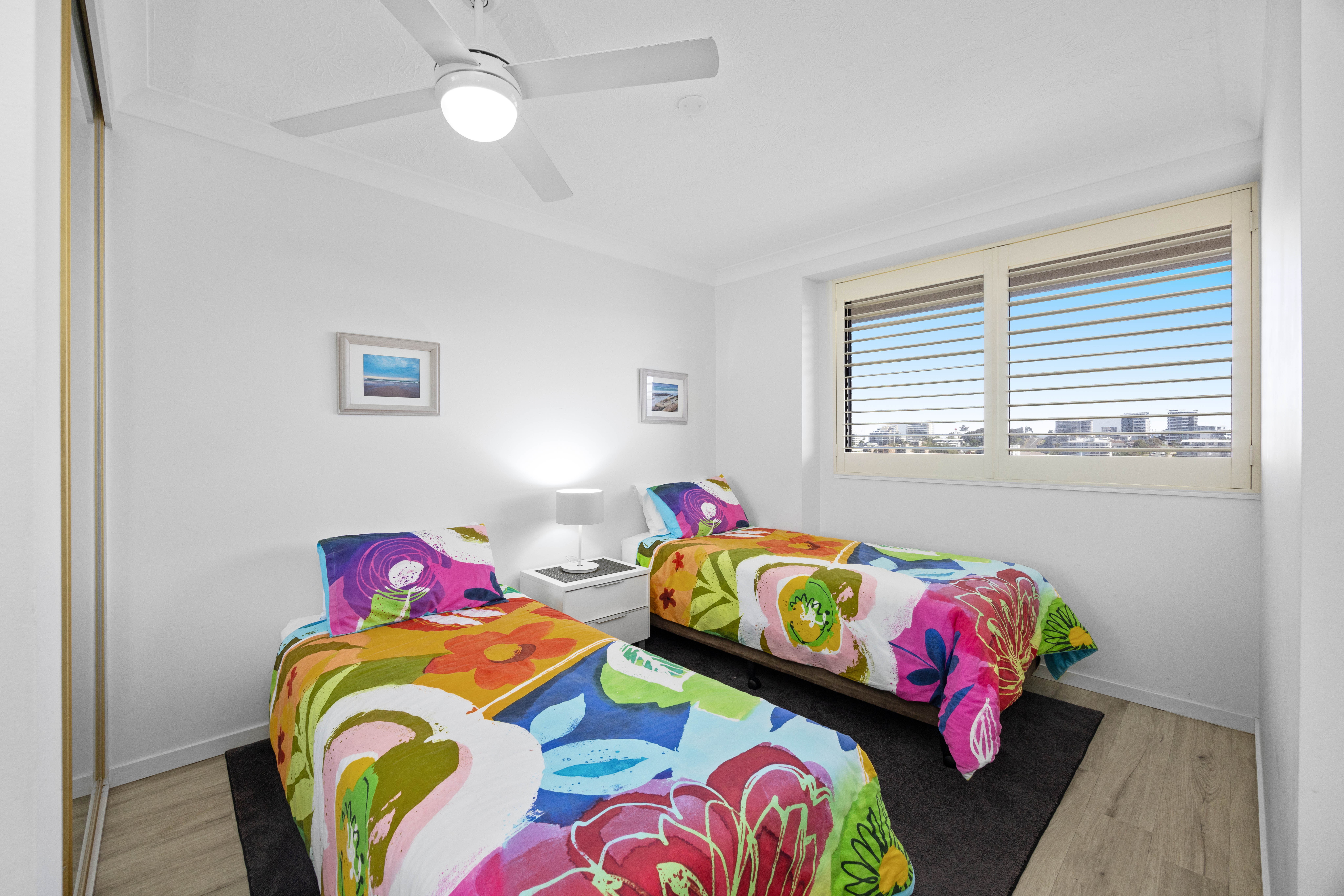 The main bedroom is a true sanctuary - with generous built-in robes, a private ensuite, and stunning north-facing views stretching to Mt. Coolum. The additional two bedrooms are equally inviting, each equipped with built-in storage and sharing a sleek, floor-to-ceiling tiled bathroom with a deluxe walk-in shower.