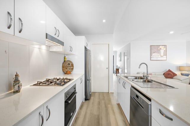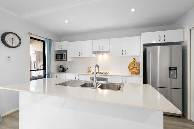 You will love the clean white spaces, wide hallways, light floors and high ceilings; making the home light and airy throughout. The well-appointed kitchen is modern and sleek, featuring a large walk-in pantry, white stone island bench, stainless steel appliances, gas cooking and ample storage.
