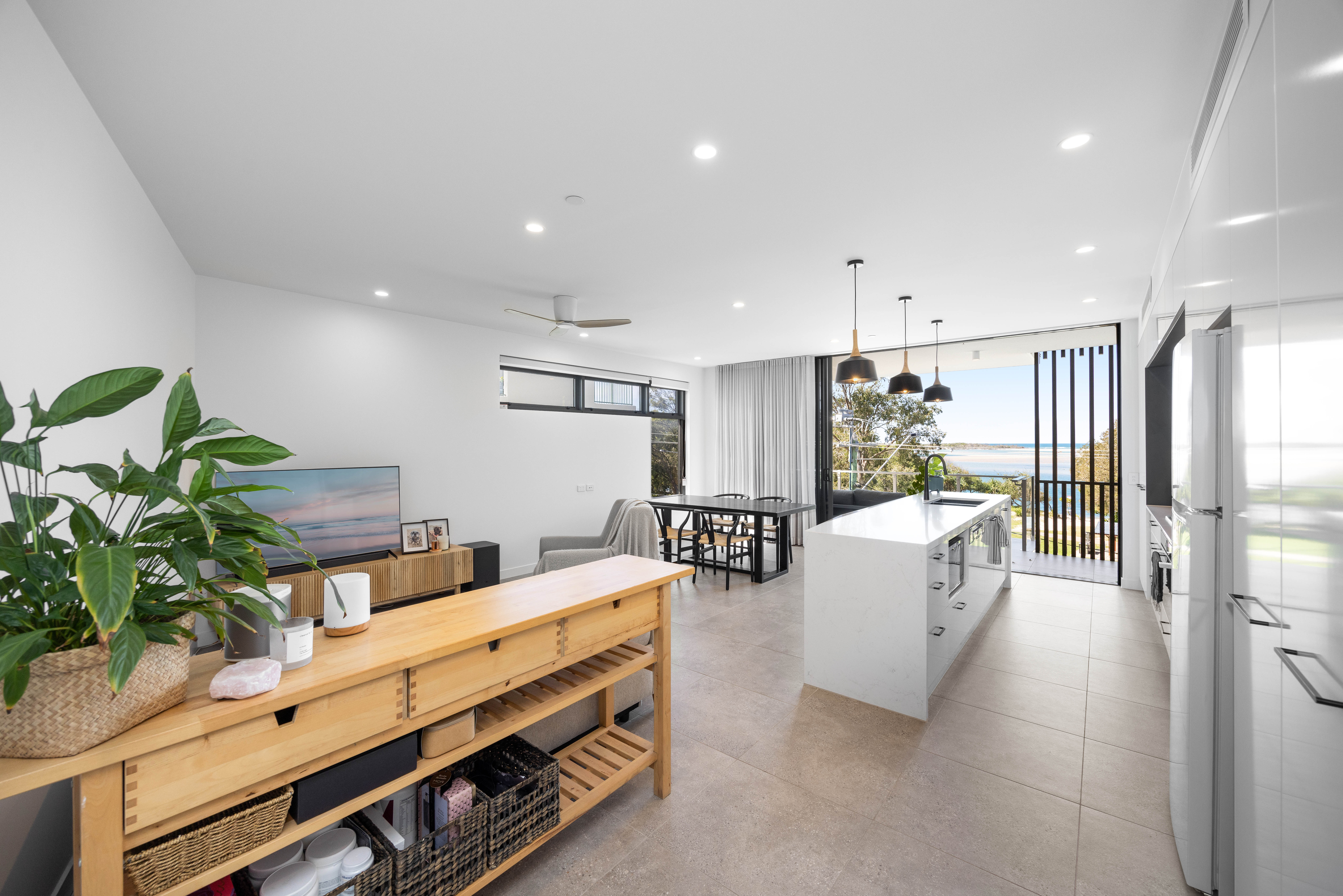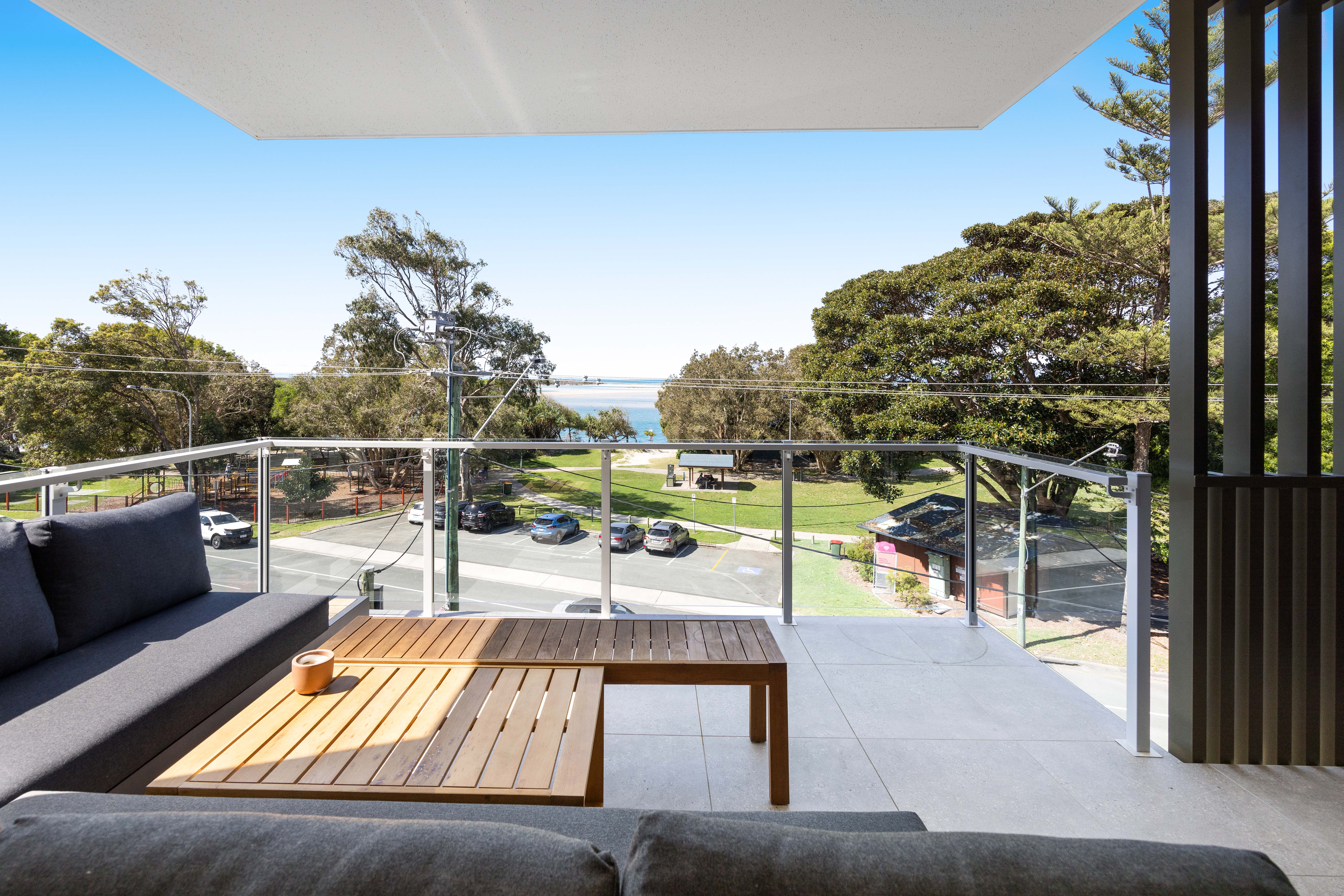 As you enter this sophisticated space, you'll be greeted by chic colours, high ceilings, oversized doors, energy-efficient downlights, and double-glazed windows. The property also offers three stunning balconies, each providing picturesque views of the park, beach, and water, allowing you to unwind in style.